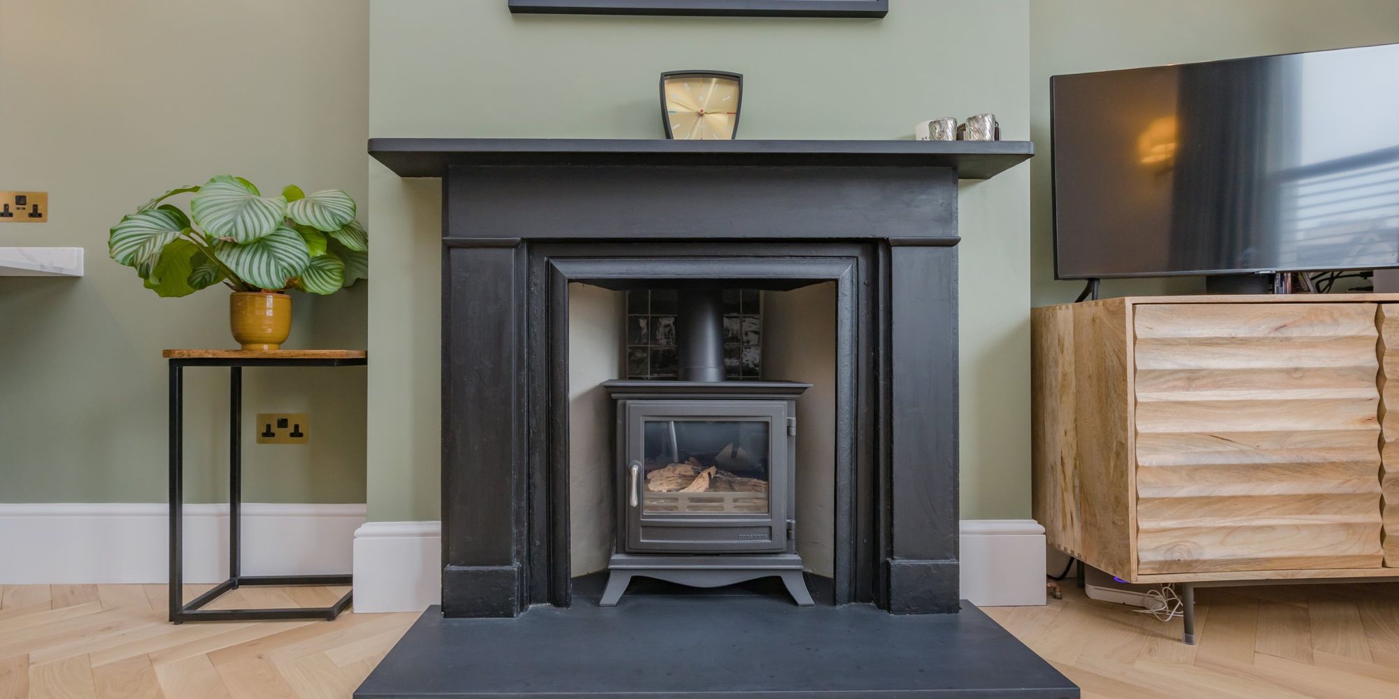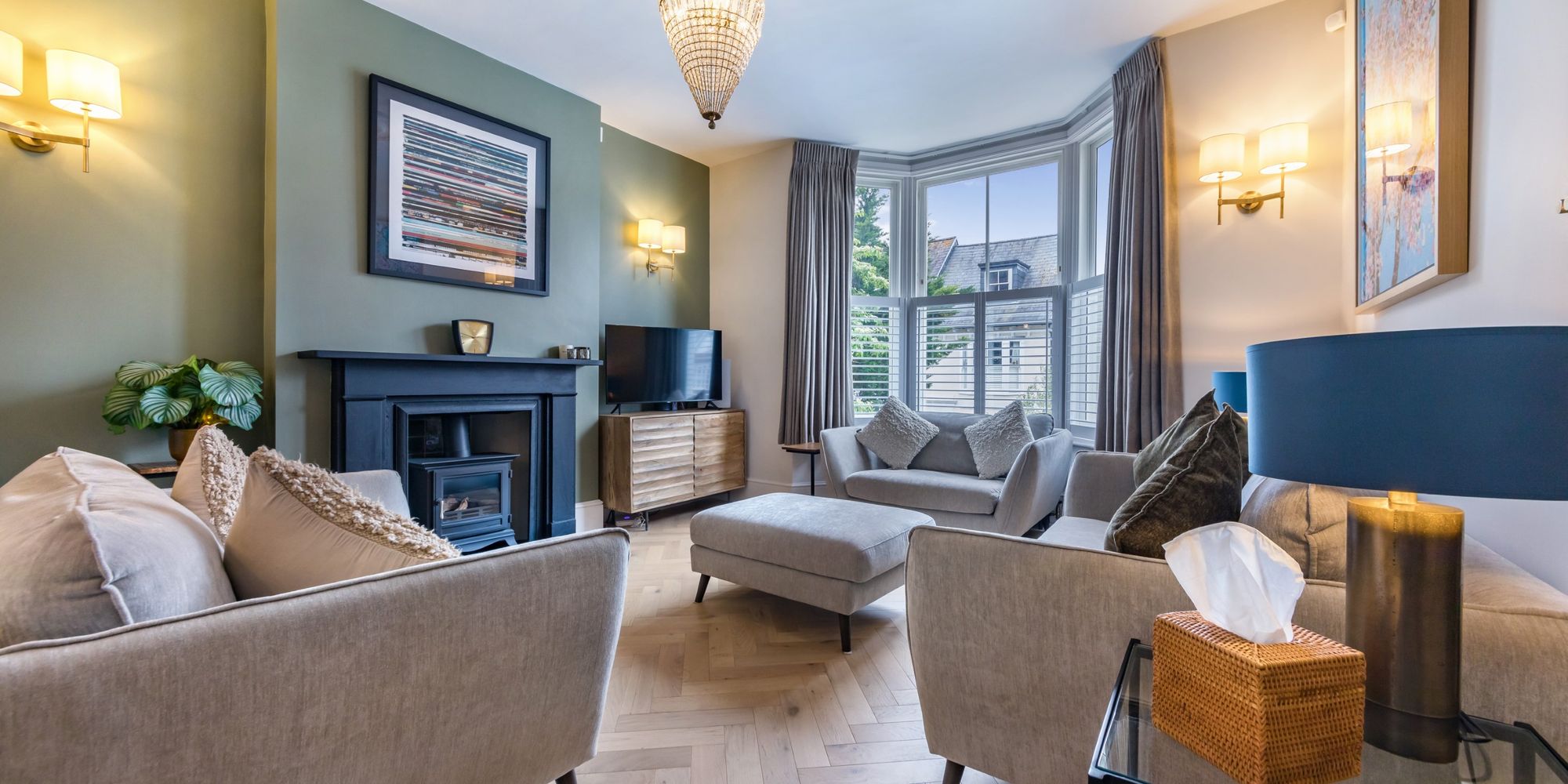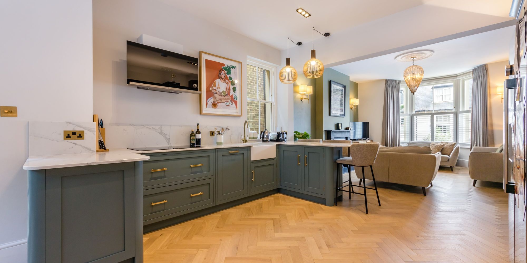 SITTING AREA- The gorgeous solid oak herringbone floor continues throughout the ground floor, and is complemented by beautiful yet simple stone fireplace with modern stove inset. Bay window to the front comprising of three double glazed sash windows flooding the room with natural light and featuring an elevated view along Grange Road. Open plan to;