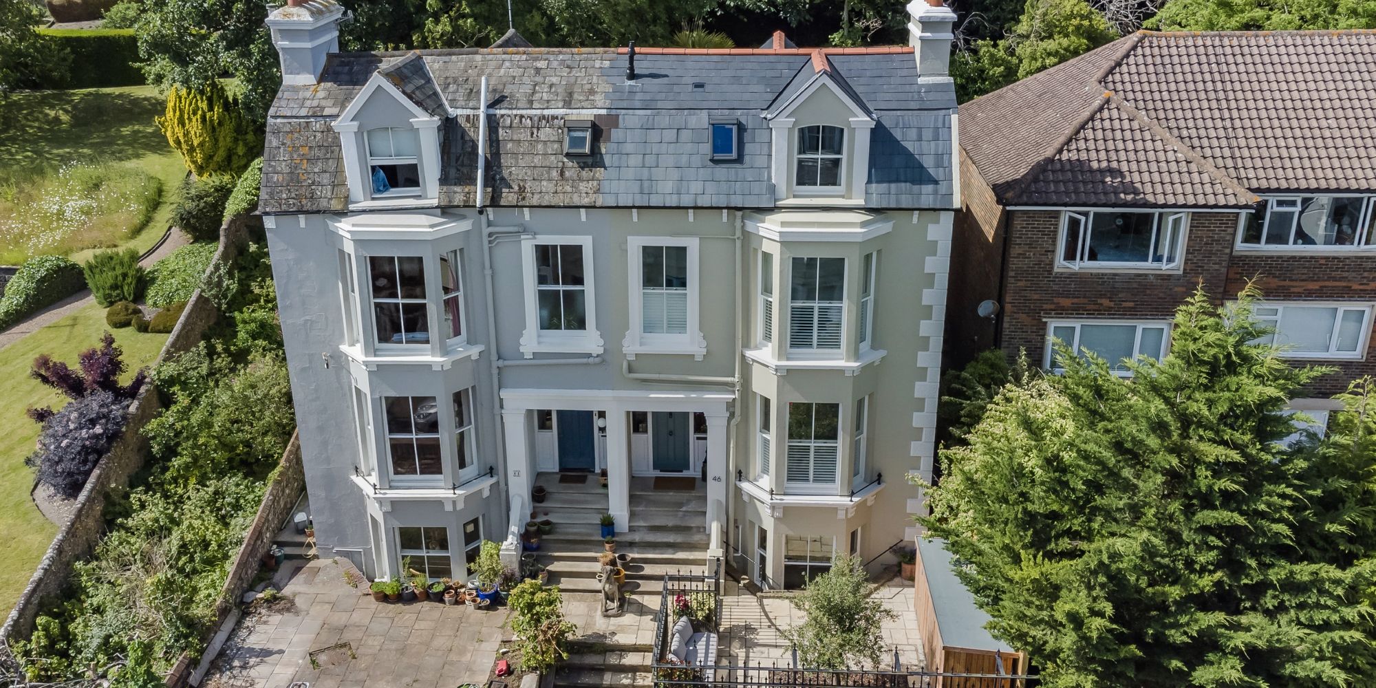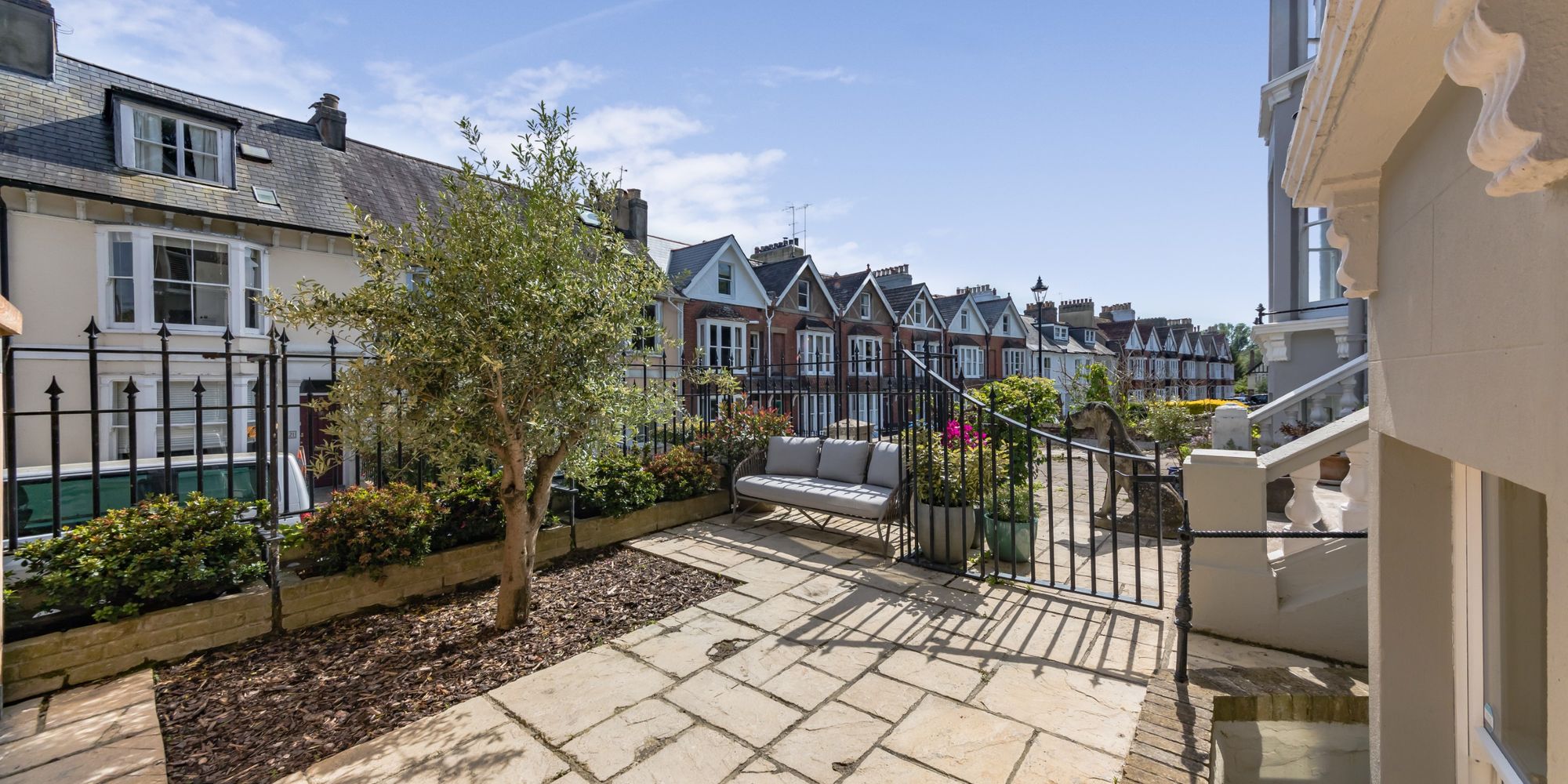 FRONT GARDEN- A very usable front garden being elevated and of an enviable Southerly aspect. The paved garden is enclosed by bespoke made railings and provides a great space for outside seating.