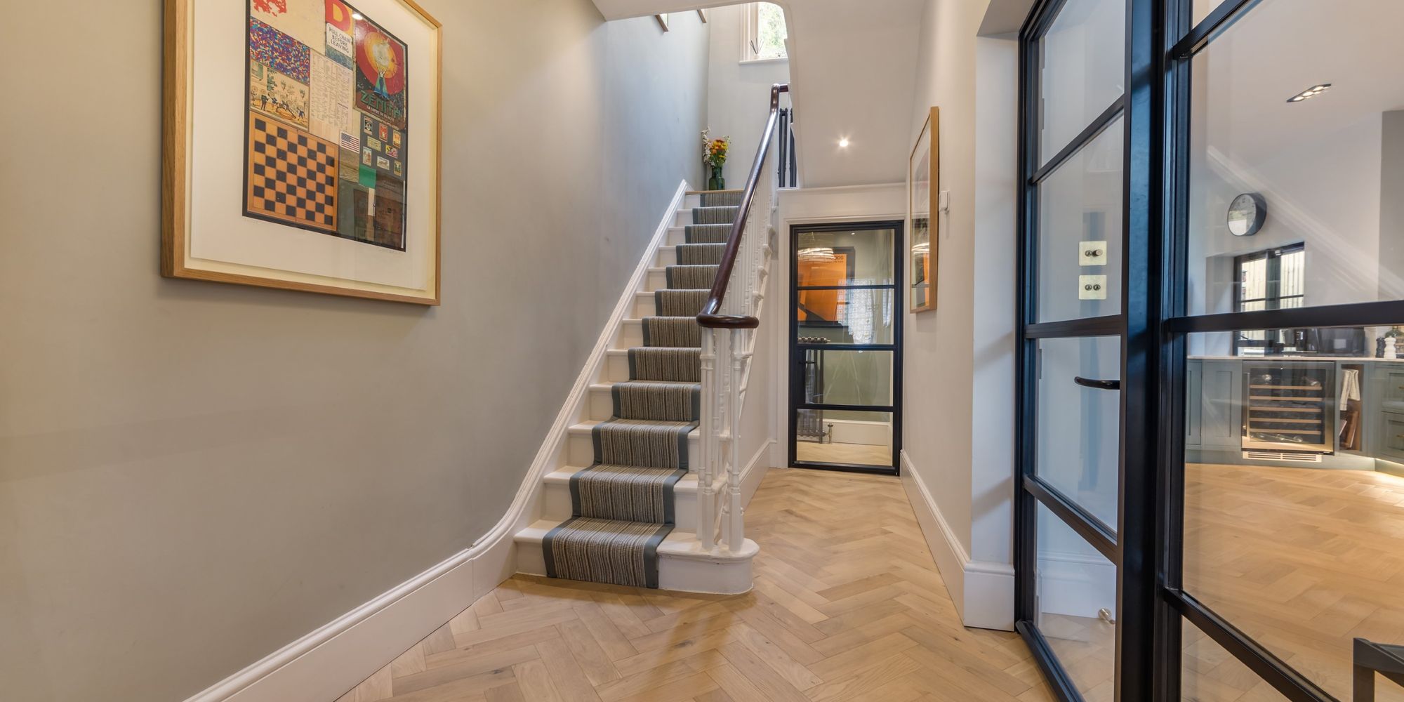ENTRANCE HALL- A gorgeous entrance hall with solid oak herringbone wood floors. the original stair case has been lovingly restored and is complimented by bespoke made collum radiators and contemporary Crittal style doors to principal rooms. Stairs continue to lower ground floor.