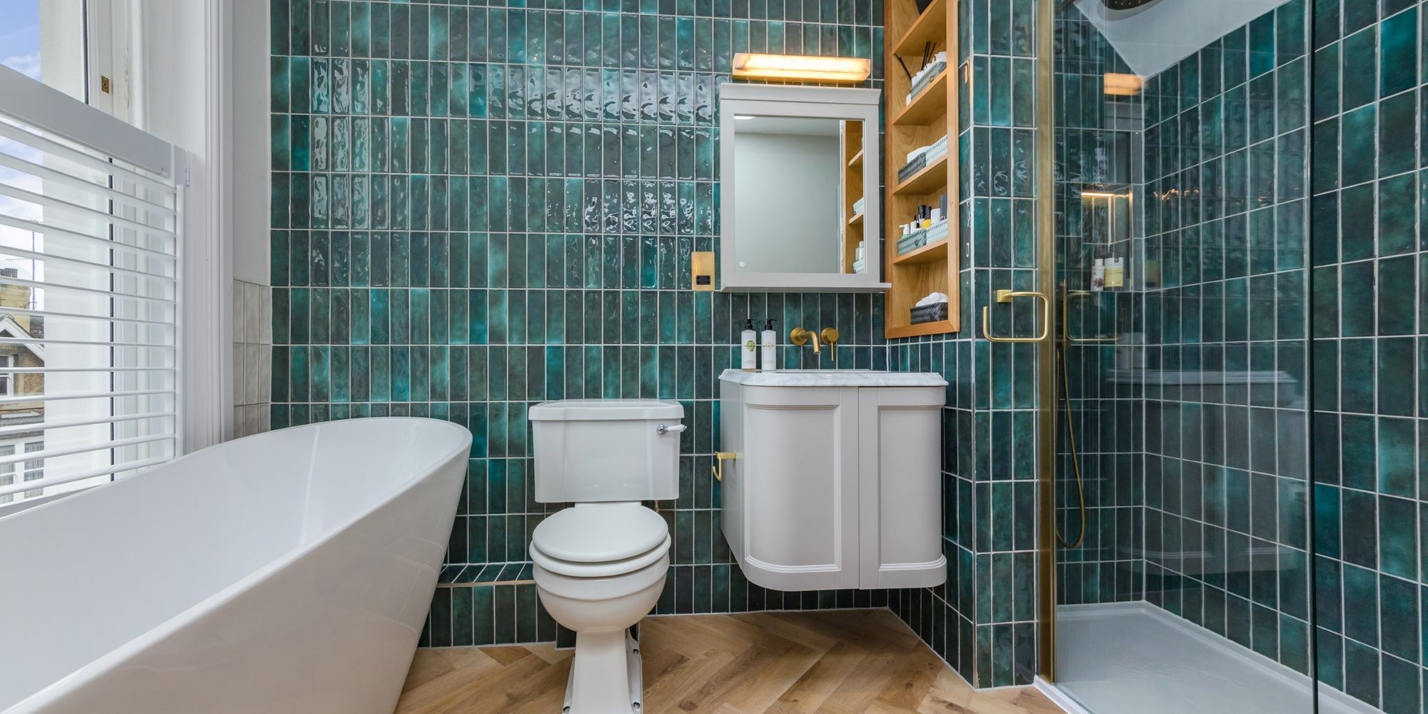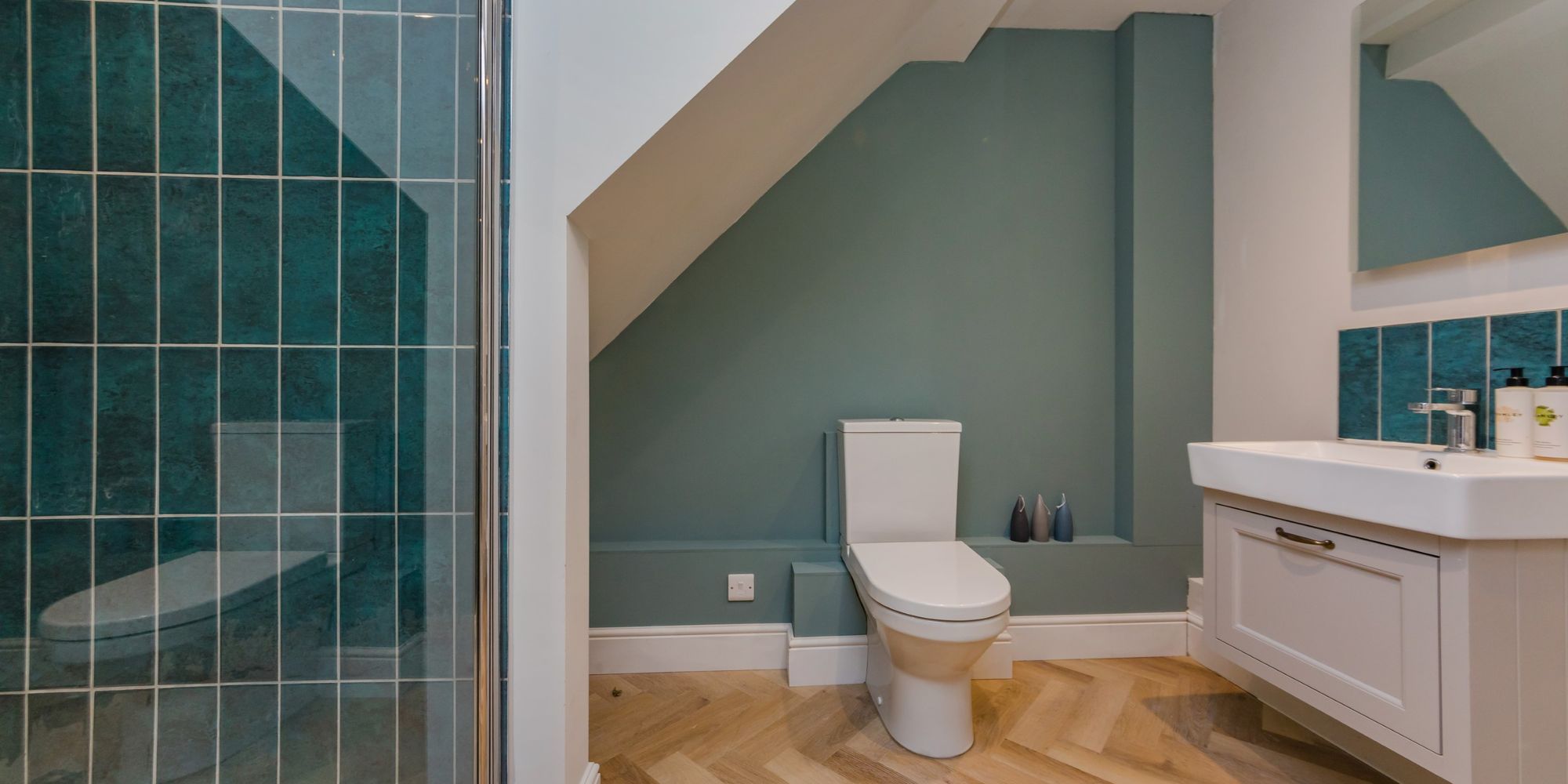 EnSUITE SHOWER ROOM- A modern suite comprising of a generously sized shower enclosure with beautiful teal coloured tiles, a wc and wash hand basin which is set into a vanity unit. Solid oak herringbone wood floor.