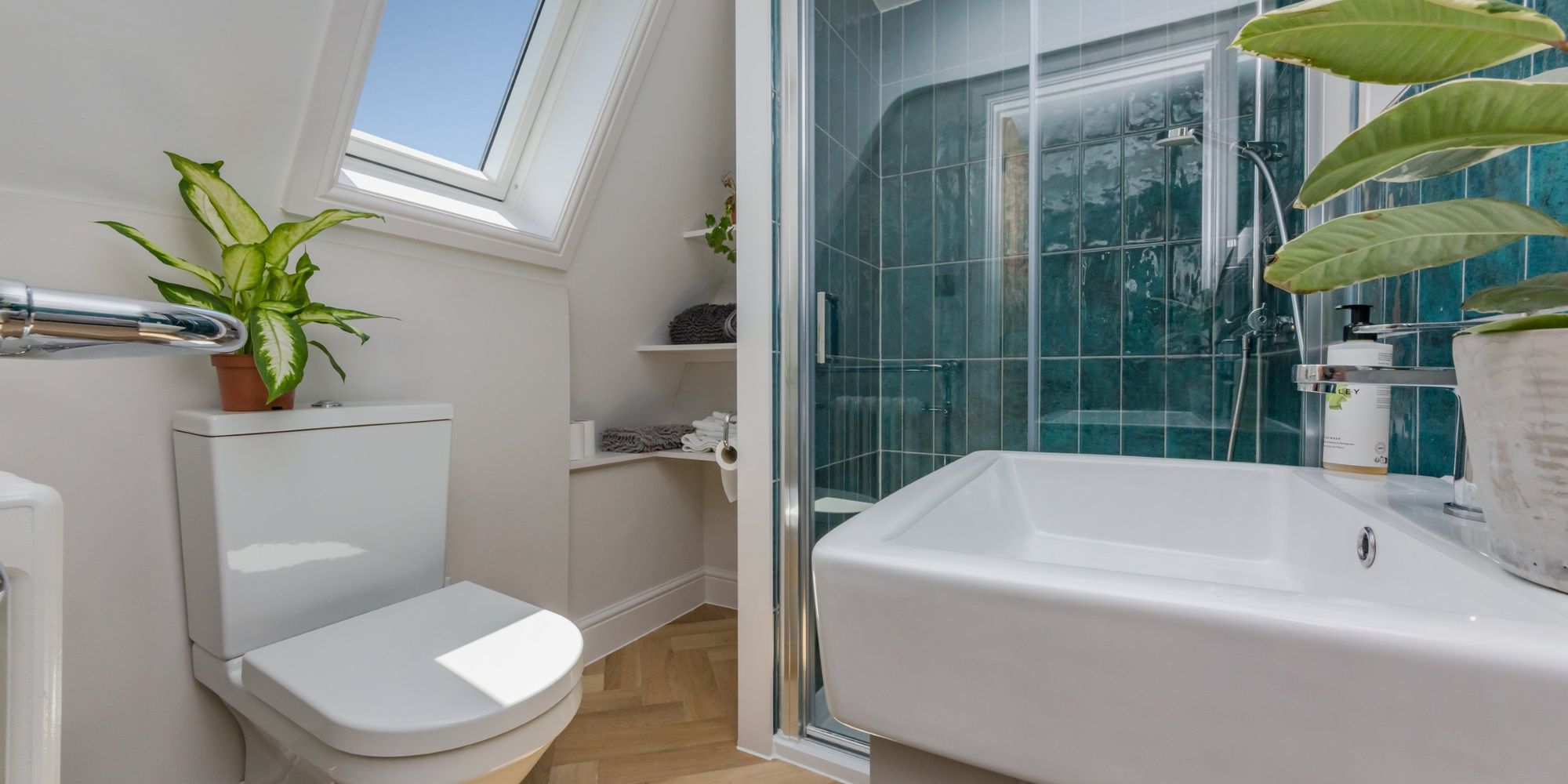EnSUITE- Modern suite comprising of a generously sized shower enclosure, wc and wash hand basin set into a vanity unit. Herringbone wood floor and roof window.