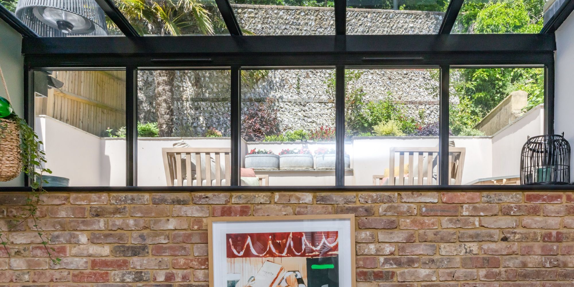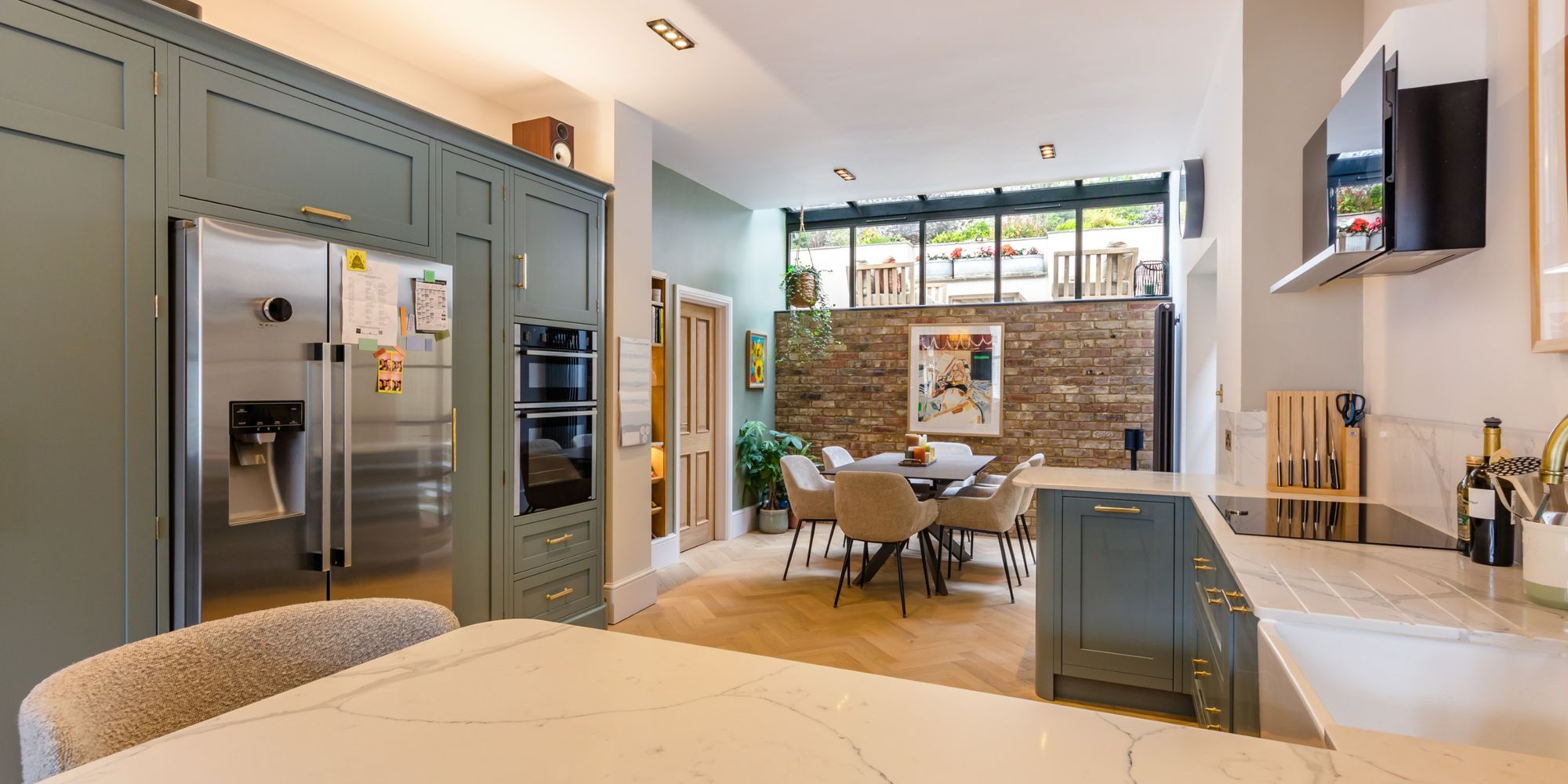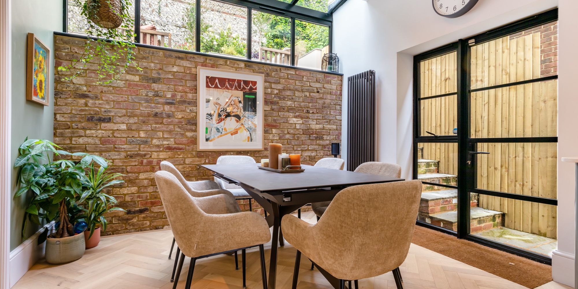 DINING AREA- Open plan to the Kitchen the Dining Area boasts a feature wall from reclaimed bricks topped with modern black framed windows and partially glazed roof, providing glimpse of the landscaped garden. further Crittal style double glazed window and door to the side. Solid oak door to;