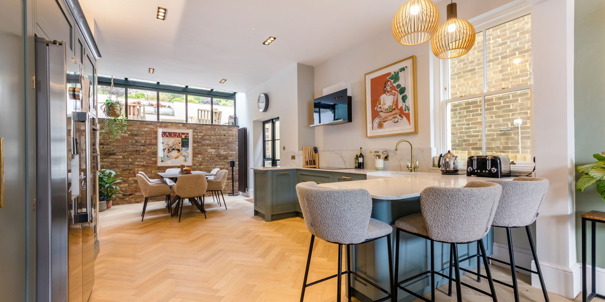 The 2,278 sq ft property boasts a wonderful open plan Living, Kitchen, Dining Room with a gorgeous solid oak wood floor which has been laid in a herringbone design and can be found through out much of the home. The Living Room boasts an almost floor to ceiling bay window comprising of three double glazed sash windows. The Kitchen features a beautiful kitchen which is complimented by marble worksurfaces and incorporates a breakfast bar into the design. The Dining boasts a feature wall created from reclaimed bricks which contrasts to the modern Crittal Style windows and doors and partially glazed roof.