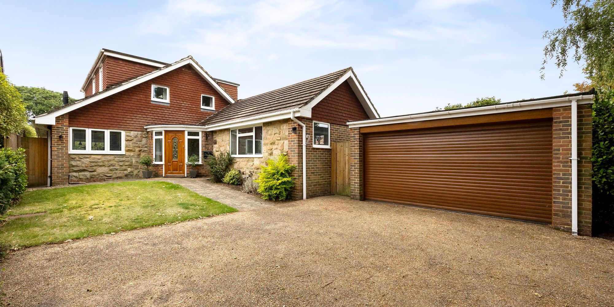 The frontage features a mature garden with two oak trees and lawn complemented by a driveway accommodating multiple vehicles. Also, a double garage with an electric roller door offers easy rear access, adding to the property's allure.