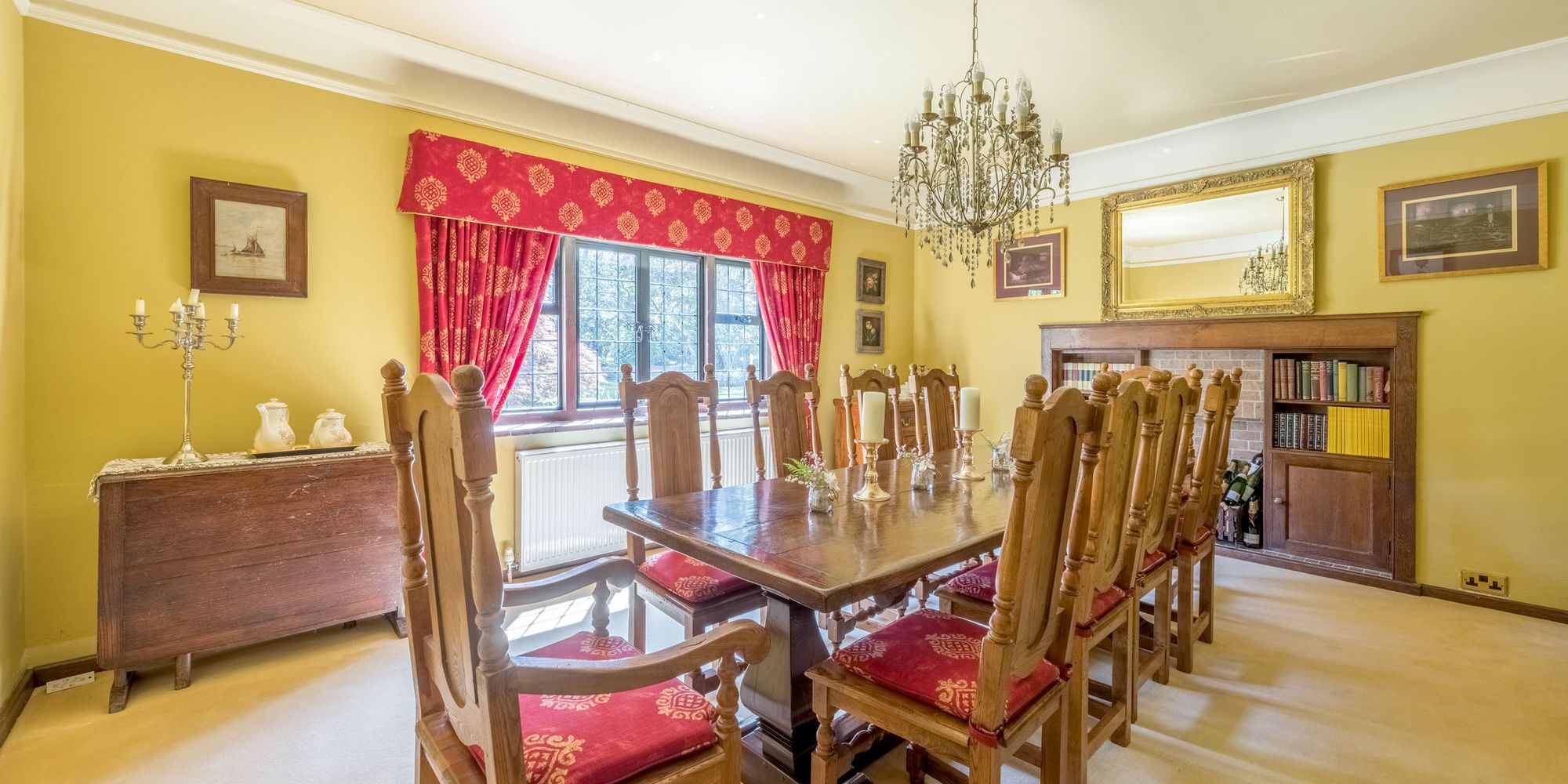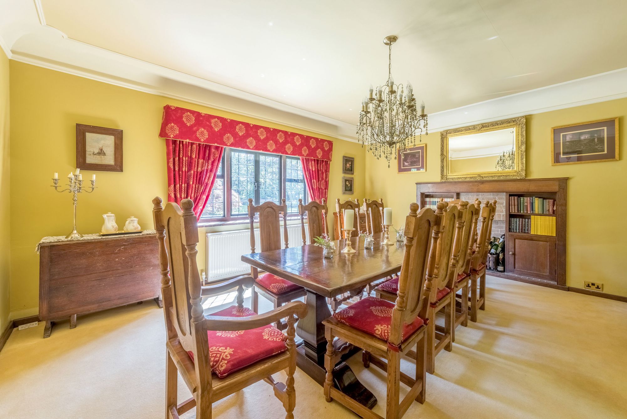 DINING ROOM: 16’11 x 14’ window overlooking the gardens and grounds, oak fireplace with tiled inserts, recessed display shelving, serving hatch to kitchen, ornate ceiling cornicing, picture rail.