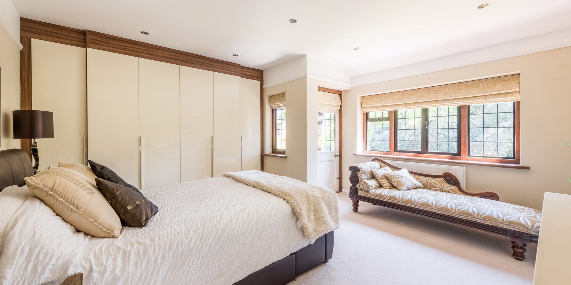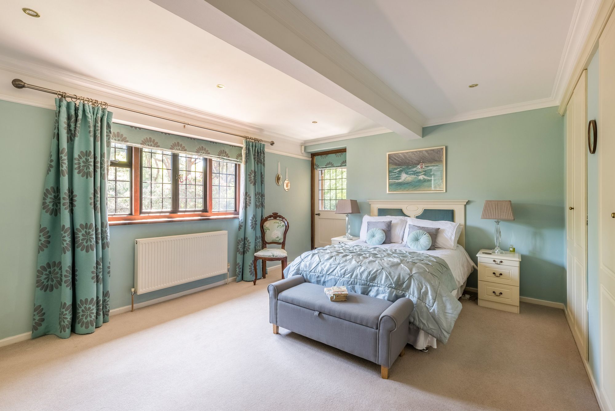 GUEST BEDROOM: 15’6 x 14’5 window overlooking the gardens and grounds, extensive range of built-in wardrobes, picture rail, recessed spotlighting, door with glazed insert opening to the BALCONY with views across the gardens and grounds.