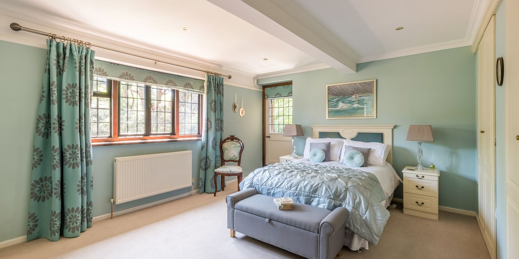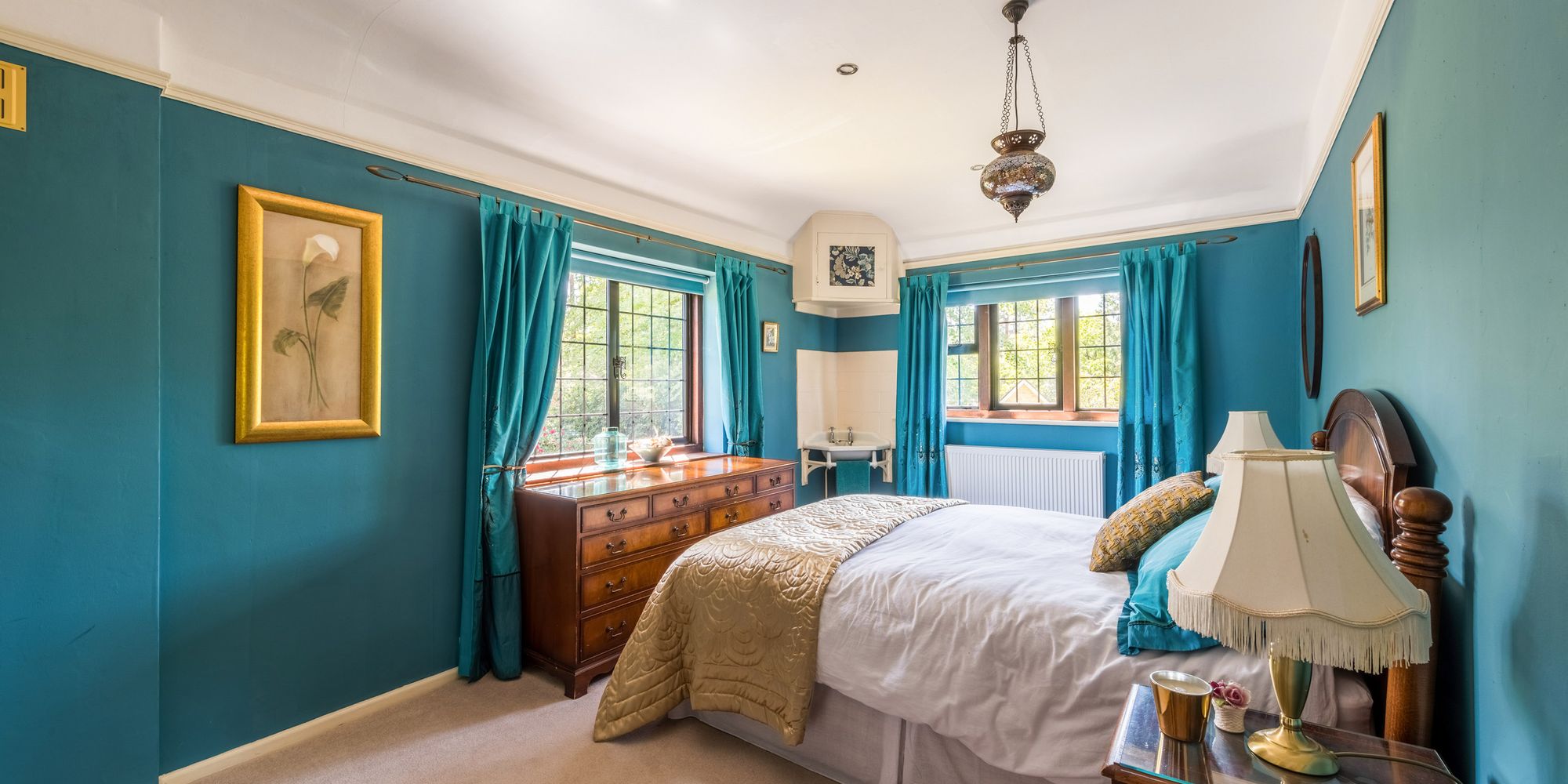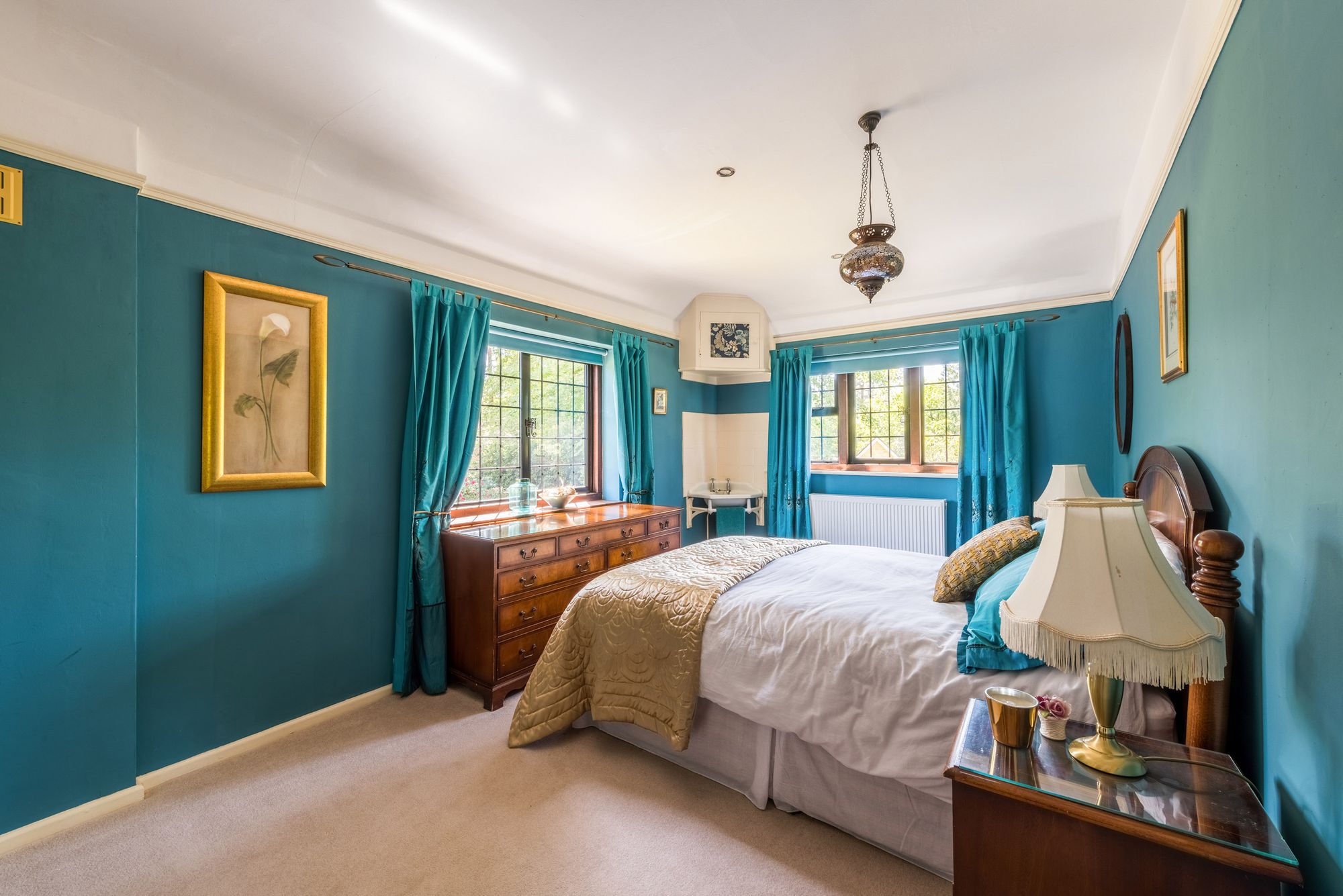 BEDROOM: 16’8 x 9’7 double aspect room, windows overlooking the side and rear of the property with views across the gardens, built-in double wardrobe, washbasin with tiled surround, picture rail, recessed spotlighting.