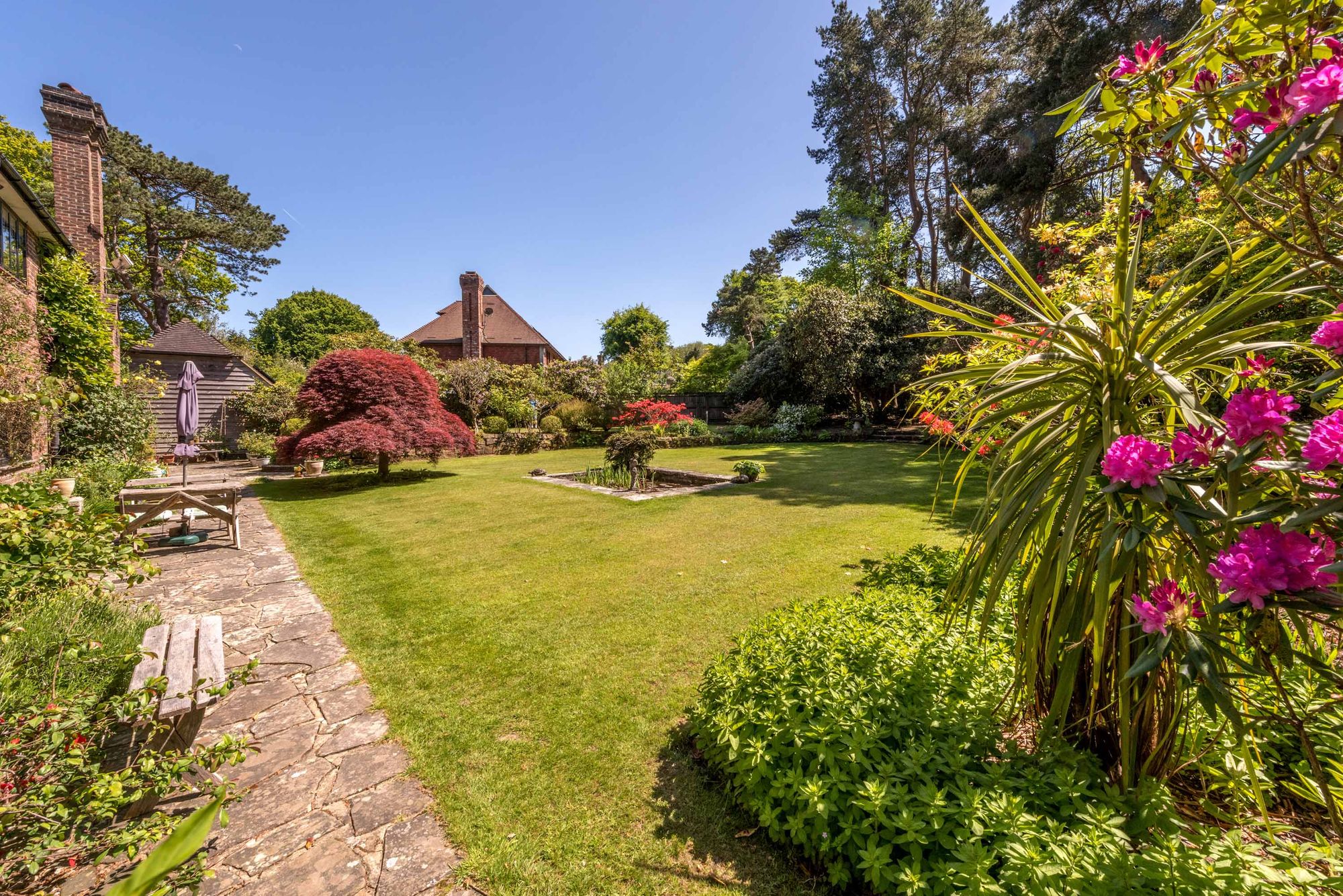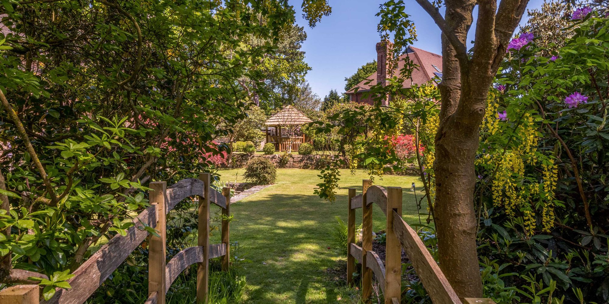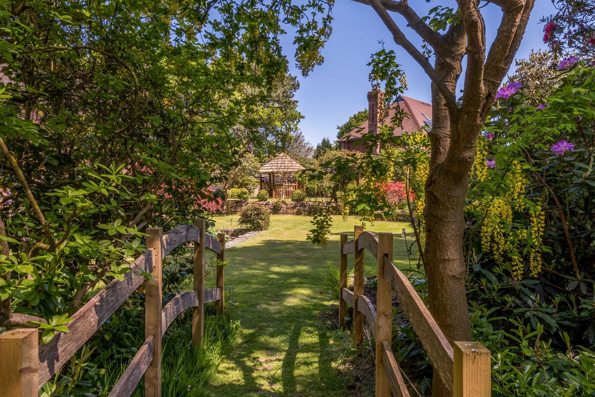 The fantastic south-facing GARDENS are a particular feature of the property and are laid to lawn with a multitude of mature trees, shrubs, and flower beds. The gardens are divided into various sections which include terraces and seating areas, ornamental pond, garden store and an attractive circular thatched gazebo which is ideal for entertaining and al fresco dining. In all the property extends to about 0.74 acres
