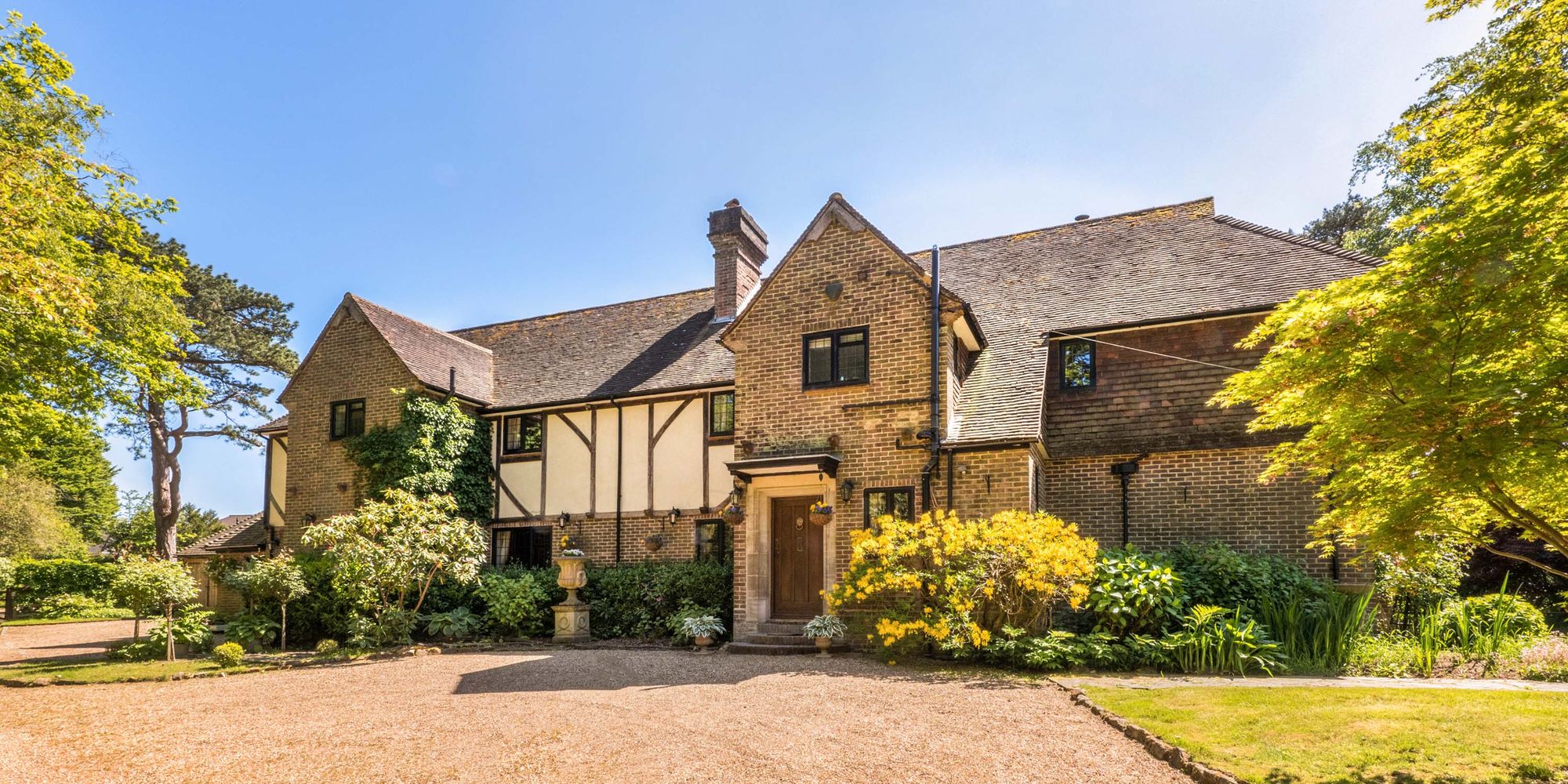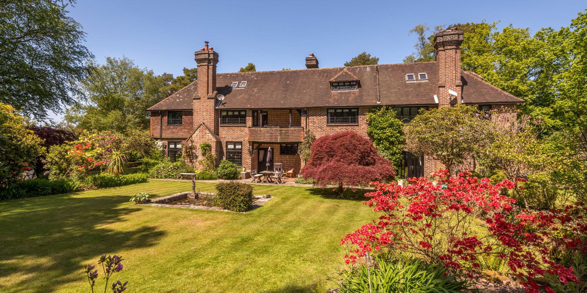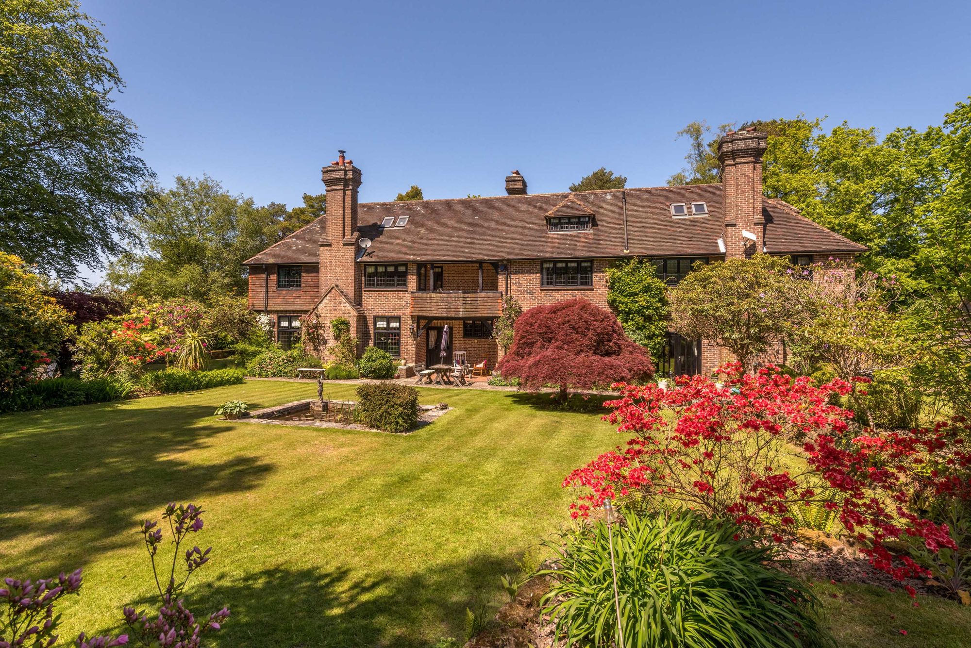 A substantial and beautifully situated detached character country house occupying gardens and grounds extending to ¾ of an acre on the edge of the breath-taking Ashdown Forest yet within a short stroll of Crowborough town centre and a regarded primary school. This outstanding home, constructed in the 1920’s by the highly regarded local building firm Connors Brothers, retains a wealth of features inherent with the era to include numerous fireplaces, oak framed double glazed leaded light windows, and a wonderful original oak staircase. The gardens and grounds provide a spectacular backdrop and are predominantly south facing laid predominantly to areas of rolling lawn interspersed and flanked with an extensive variety of mature shrubs and trees affording peace and a good deal of seclusion. Within the grounds there is a pretty thatched gazebo ideal for outdoor entertaining and affording a fine view across the grounds. The generously proportioned accommodation extends in excess of 3,600 sq. ft., a fine reception hall, a cloakroom, a separate formal dining room which affords views across the gardens, a wonderful triple aspect bespoke kitchen/breakfast room with granite work surfaces and four oven Aga, a utility room beyond which is a secondary staircase rising to the first floor, a separate WC, and a magnificent square bay fronted drawing room with a square bay window overlooking the gardens and grounds and an original fireplace with recessed wood burner. The first floor provides five generously proportioned bedrooms, all of which enjoy views across the grounds, with a principal bedroom having extensive built-in wardrobes, luxuriously appointed en-suite bath/shower room, and a charming balcony (shared with second bedroom). In addition, there is a further nursery room, a family bath/shower room, and an additional shower room whilst the second floor provides two further bedrooms and a library/landing. Outside the property is approached via a sweeping gravel driveway which leads in part to a detached garage building with an enclosed garage with an electric car charging point and two good sized open bays. The grounds provide a fine backdrop and create a unique settings. EPC Band D. Council Tax Band F.