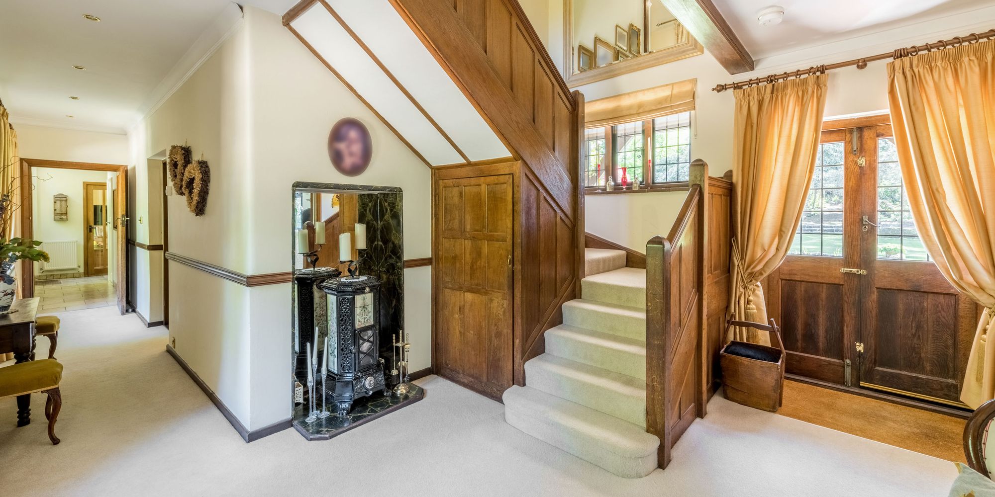 RECEPTION HALL: oak staircase ascending to the first floor, double doors with glazed inserts opening to the covered loggia with views across the grounds, free standing wood burner, deep understairs storage cupboard, windows to front, recessed spotlighting, oak double doors into Drawing Room.