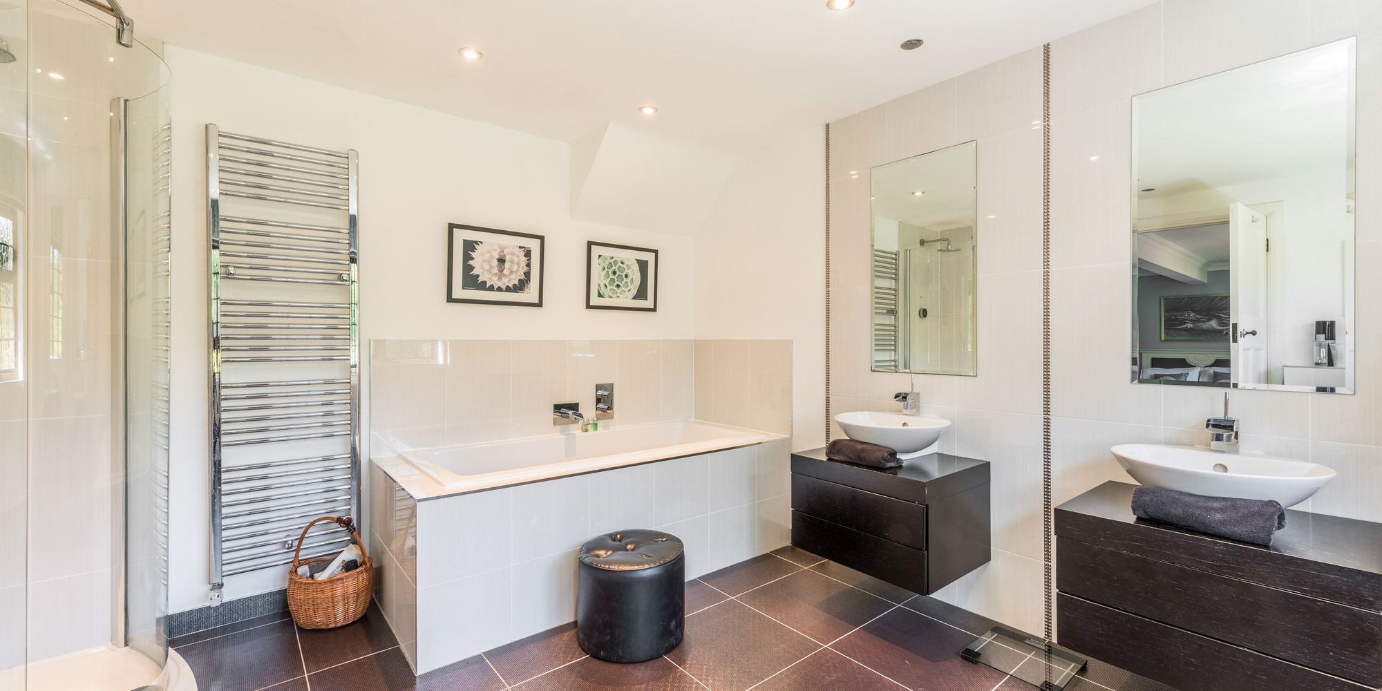 FAMILY BATH/SHOWER ROOM: beautifully refitted with a luxurious white suite and comprising enclosed double ended bath, central chrome mixer tap, tiled surrounds, fully tiled enclosed shower cubicle with wall mounted shower unit, low level WC, vanity unit with inset washbasin, opaque windows overlooking the front and side of the property, heated ladder style towel rail, recessed spotlighting, tiled flooring.