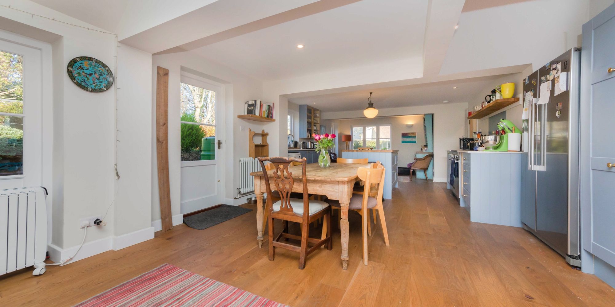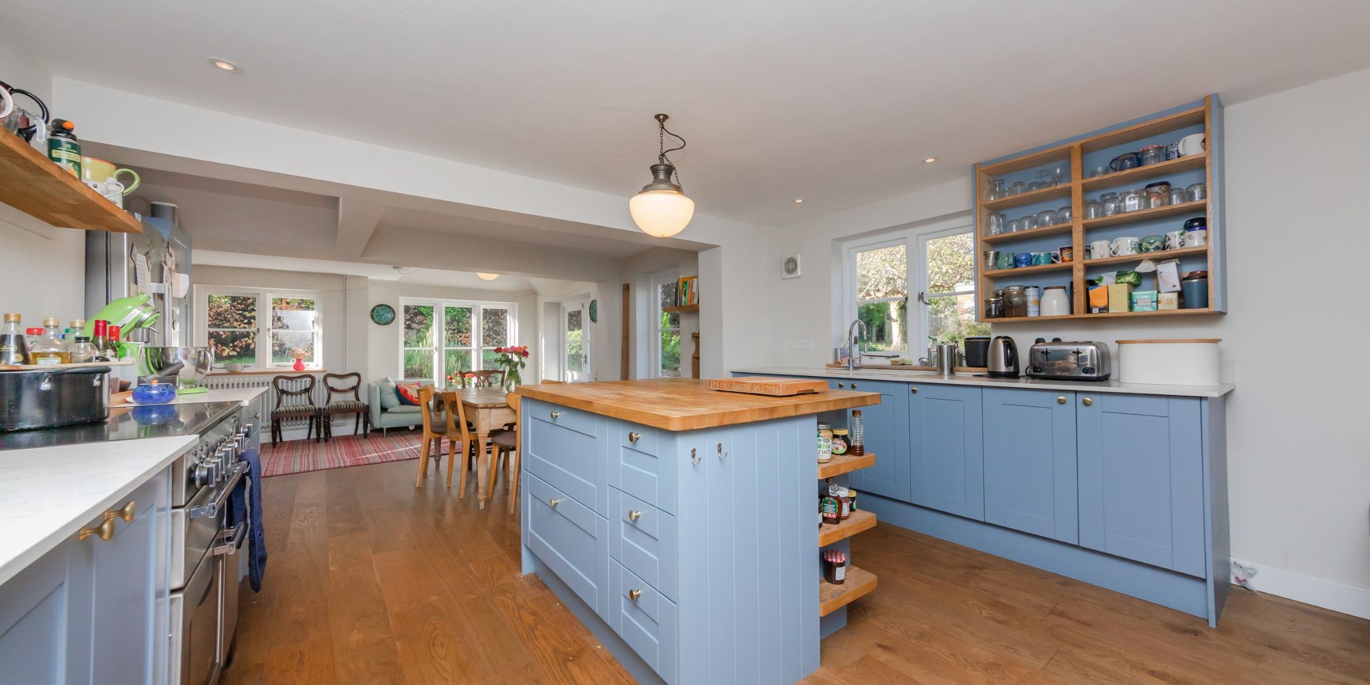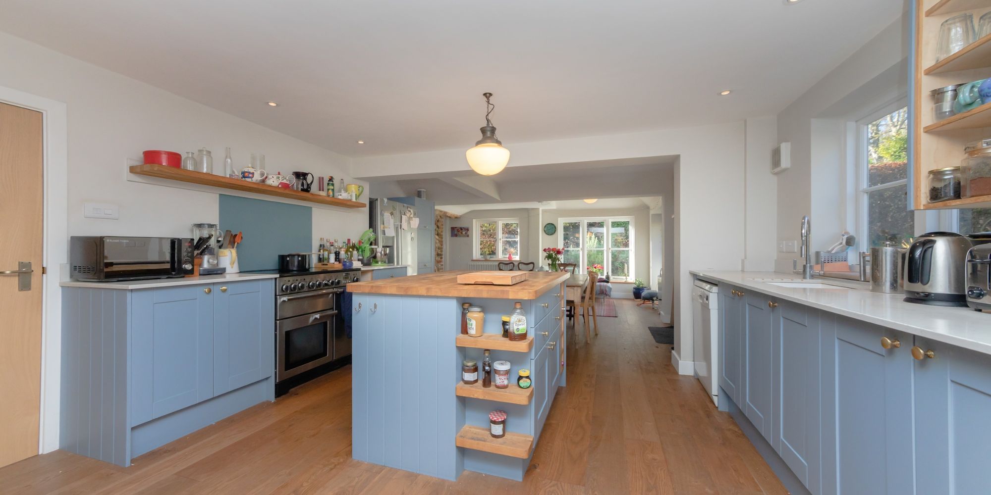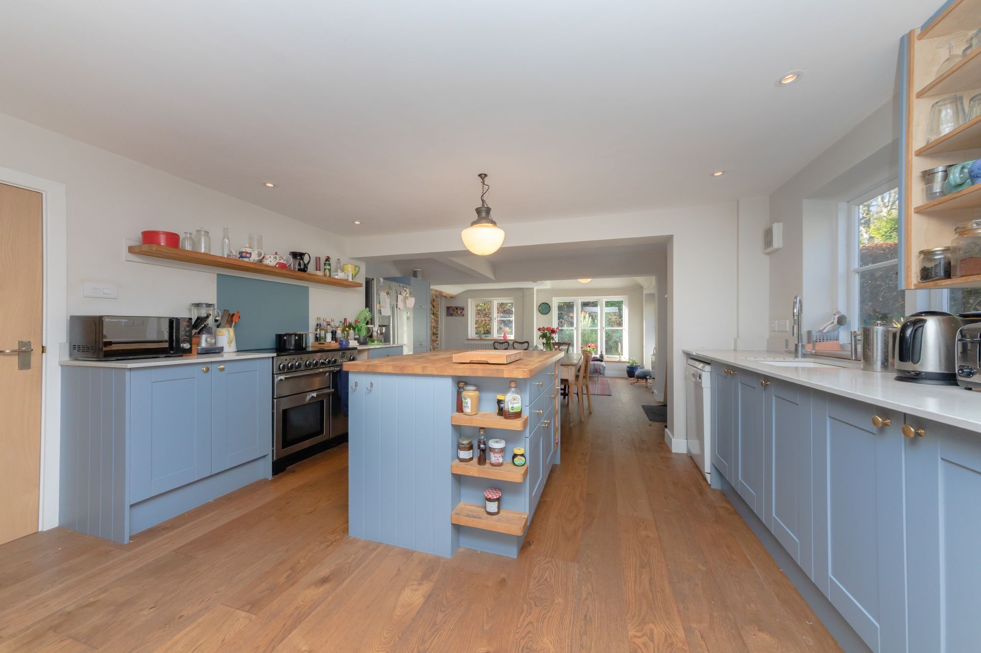 KITCHEN DAY ROOM- Measuring an enviable 35ft this wonderful triple aspect room provides a high quality kitchen, dining area and further lounge area. The kitchen is finished in a modern blue complimented by both wooden worksurfaces and white stone. The kitchen is centrally positioned between the dining and lounge areas and enjoys views over the pretty garden. The Lounge area enjoys views to the garden and of the neighbouring church and a door leads into the garden. The dual aspect Dining area is immersed in natural sun light with a partially vaulted ceiling with roof window and double doors which lead into the garden. Double doors open to;