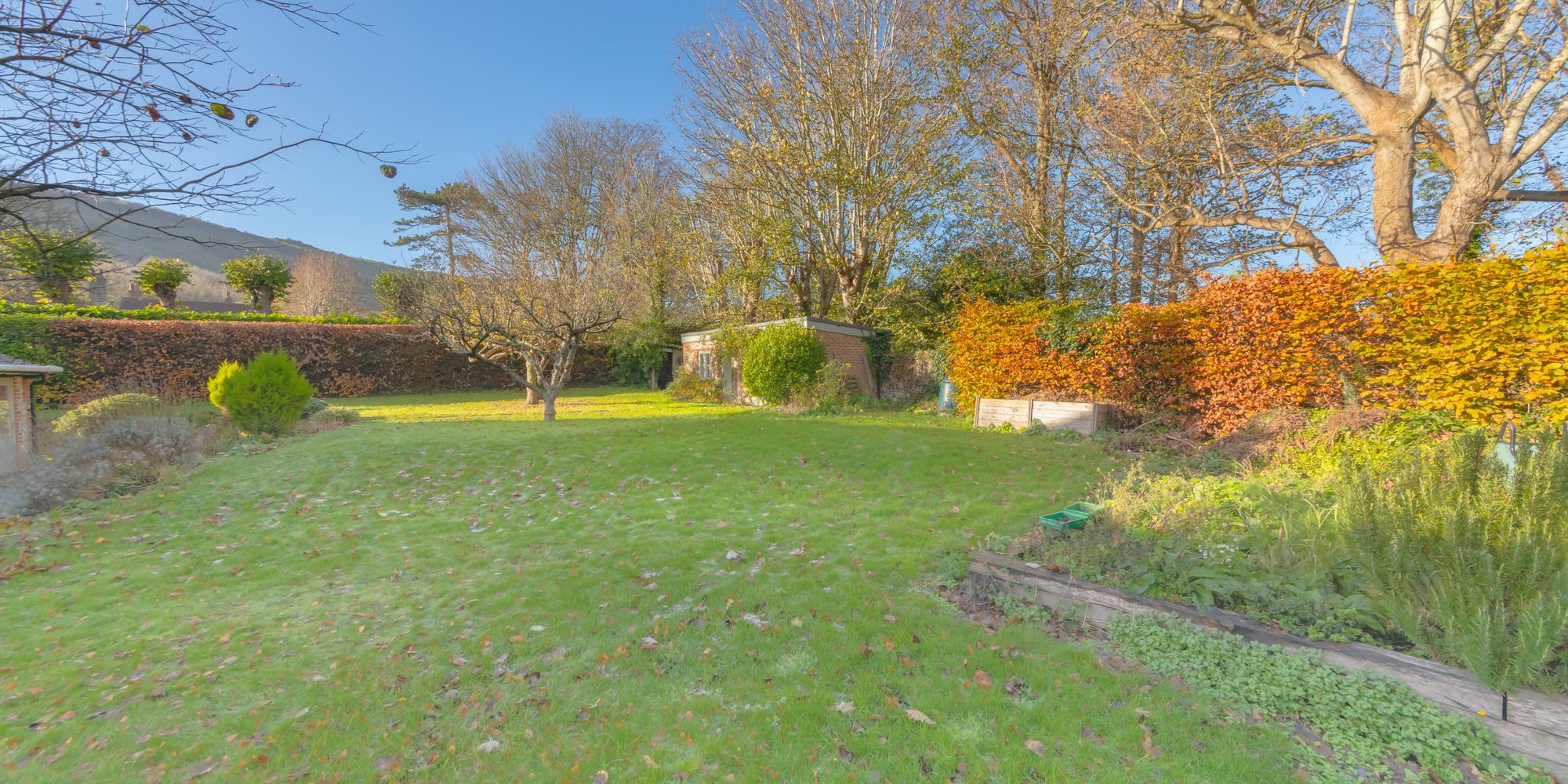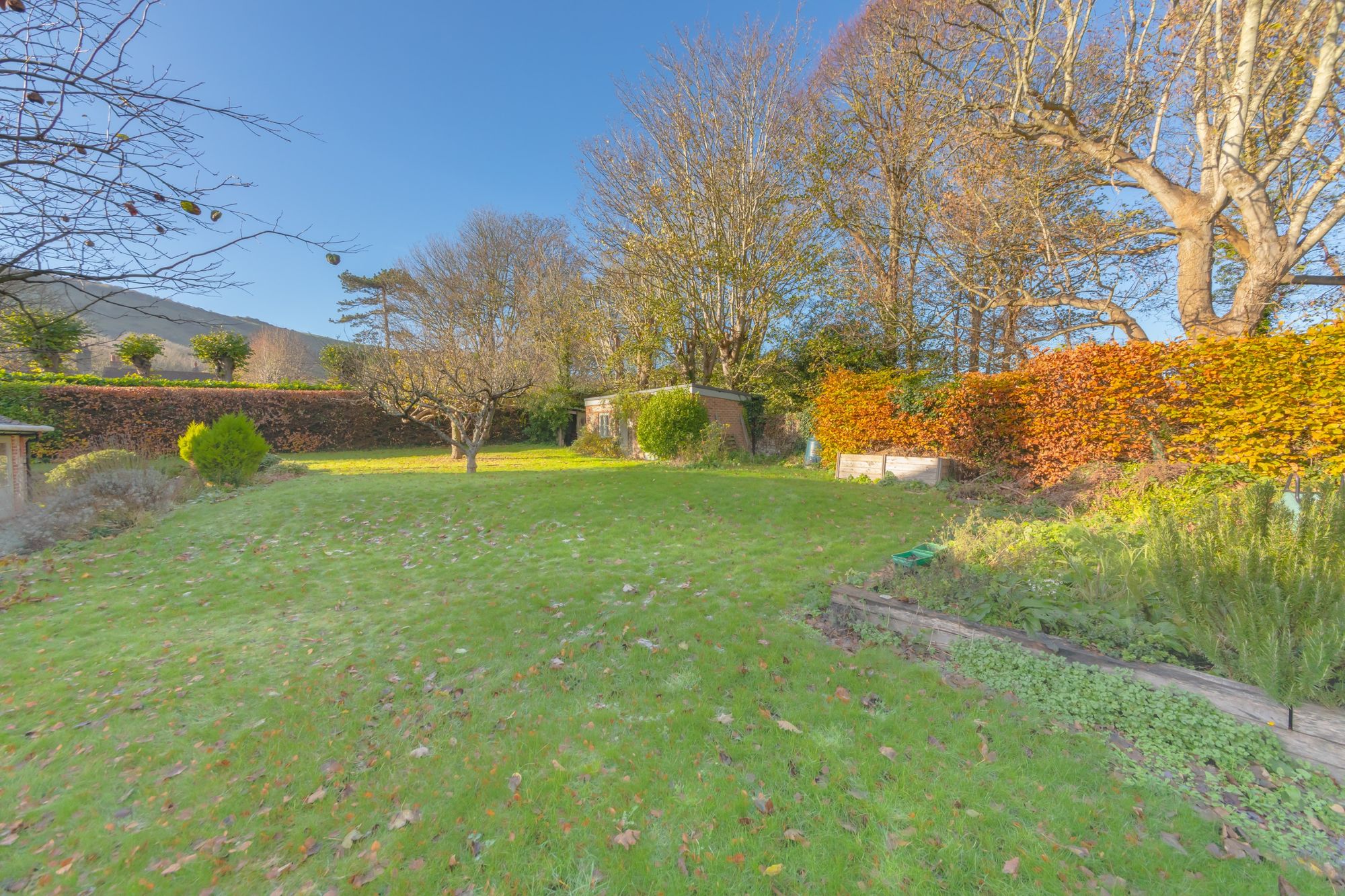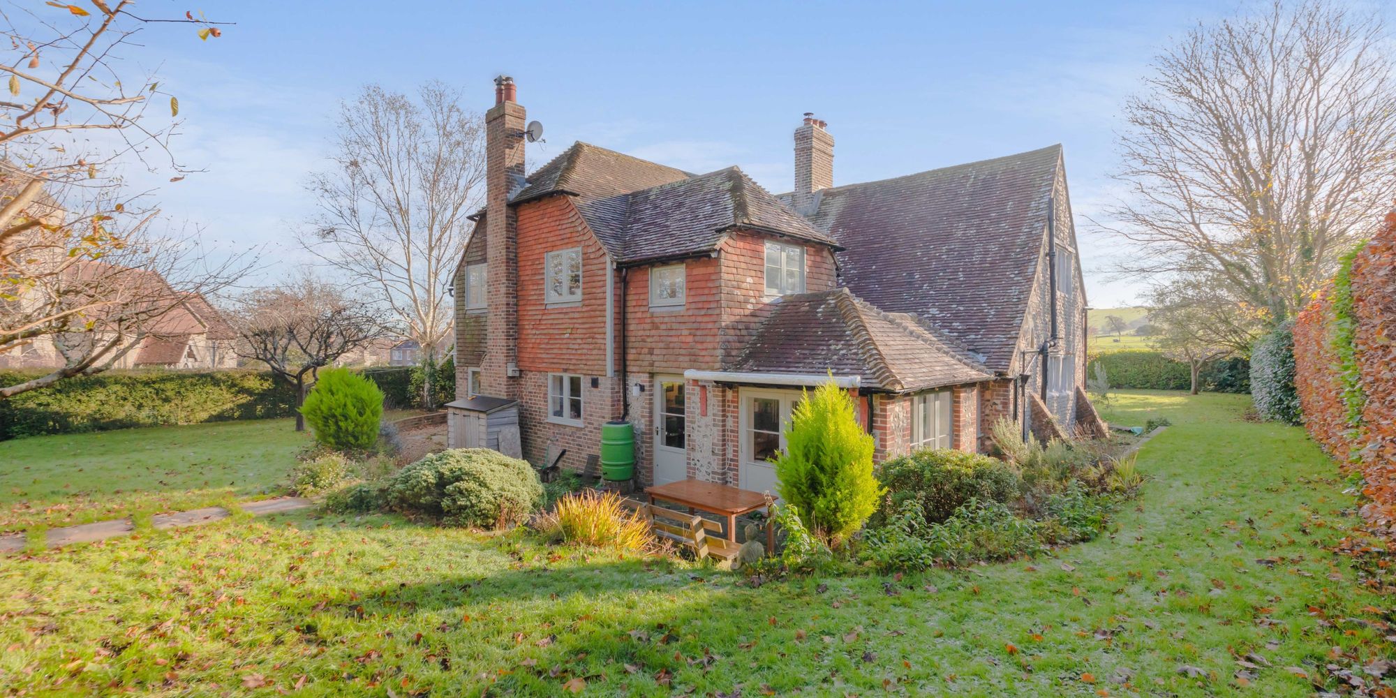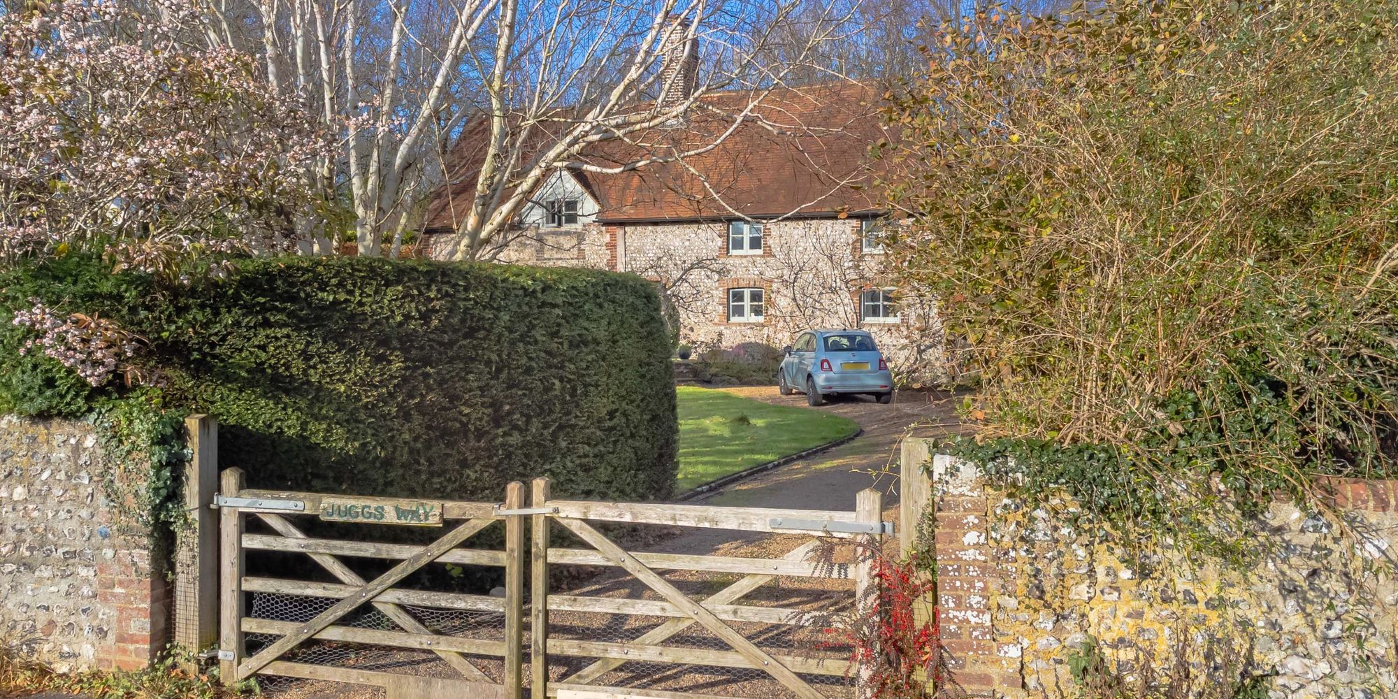 FRONT GARDEN- Juggs Way is set back from the road allowing for an extensive front garden which is well maintained and is mostly laid to lawn with established tees. There is a paved terrace to the front of the property and the garden is enclosed by a flint wall and hedged boundary.