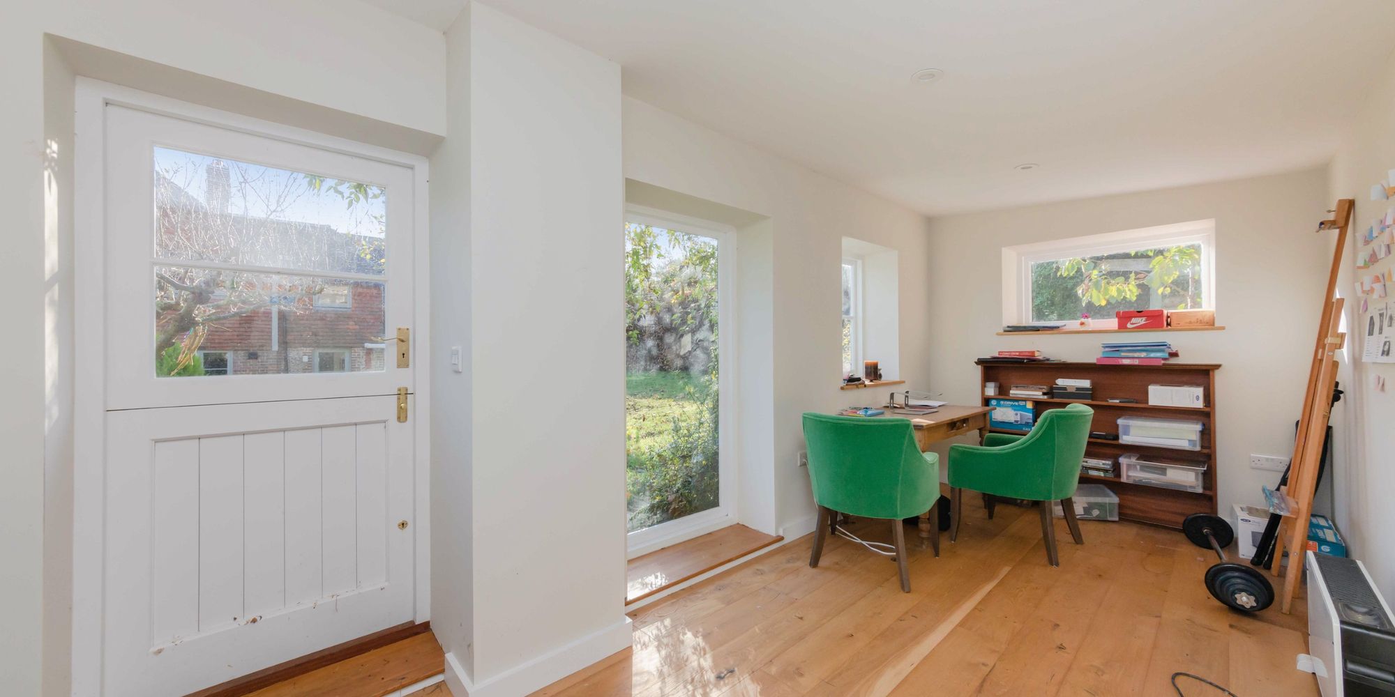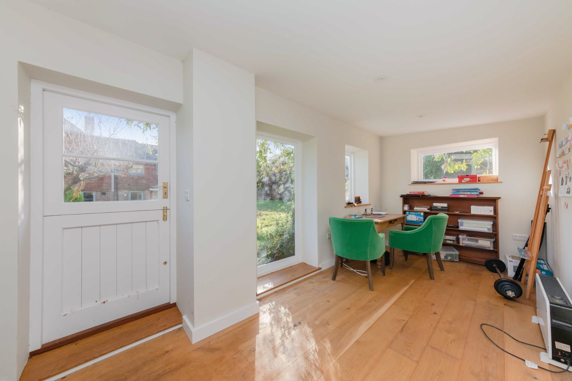 BOOT ROOM- Bespoke made oak front door, dual aspect windows with views overlooking the garden and church. Tiled floor and door to;