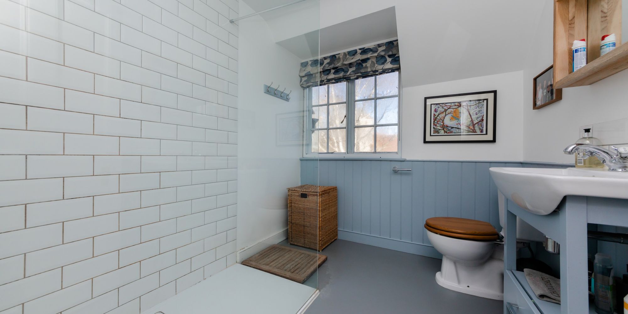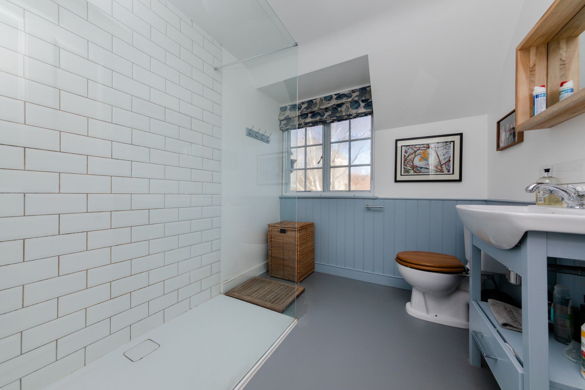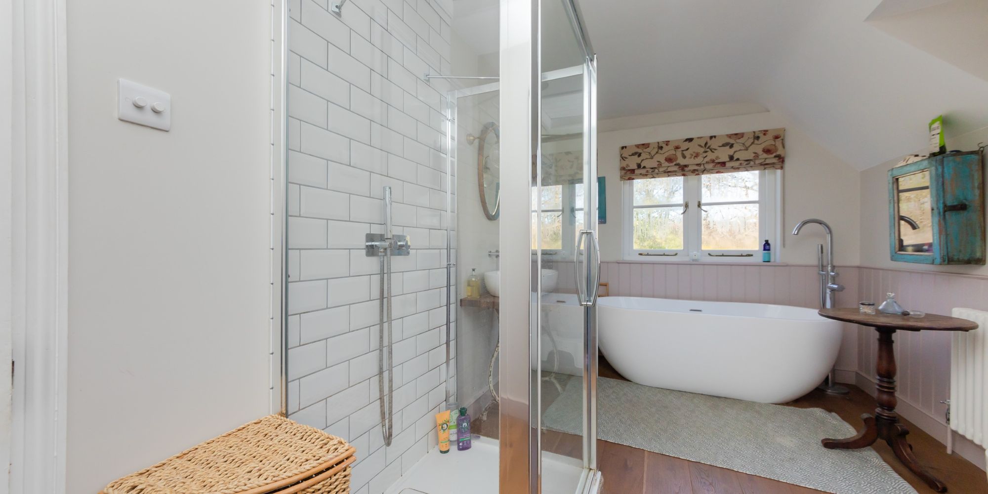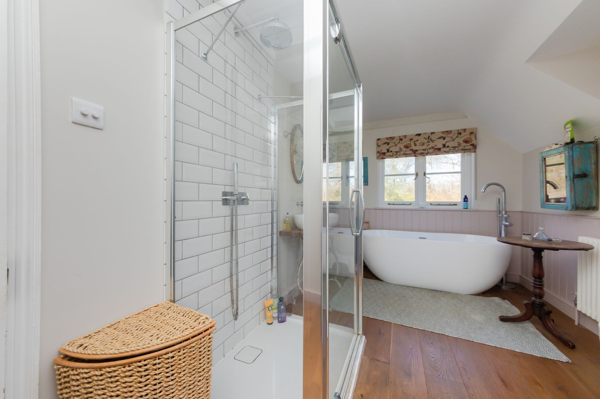 BATHROOM- An exceptional bathroom with contemporary freestanding bath, generously sized shower enclosure with rainfall shower head and metro tiled surrounds. Wash hand basin of a bowl design and wc. The dual aspect views and linen cupboard.