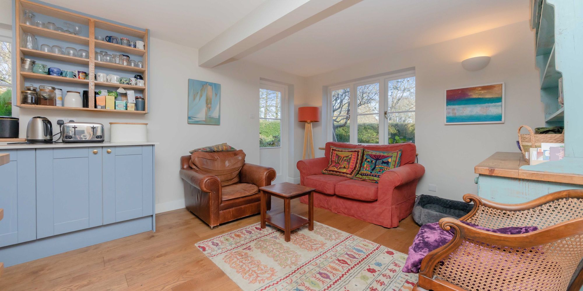 GUEST SUITE- Providing a Ground Floor Bedroom with kitchenette or serving as a Utility Room for the property if preferred. The Bedroom area features exposed beams and enjoys views over the front garden and the Kitchenette is finished in a modern blue and complemented by wooden worksurfaces. Space for kitchen appliances.