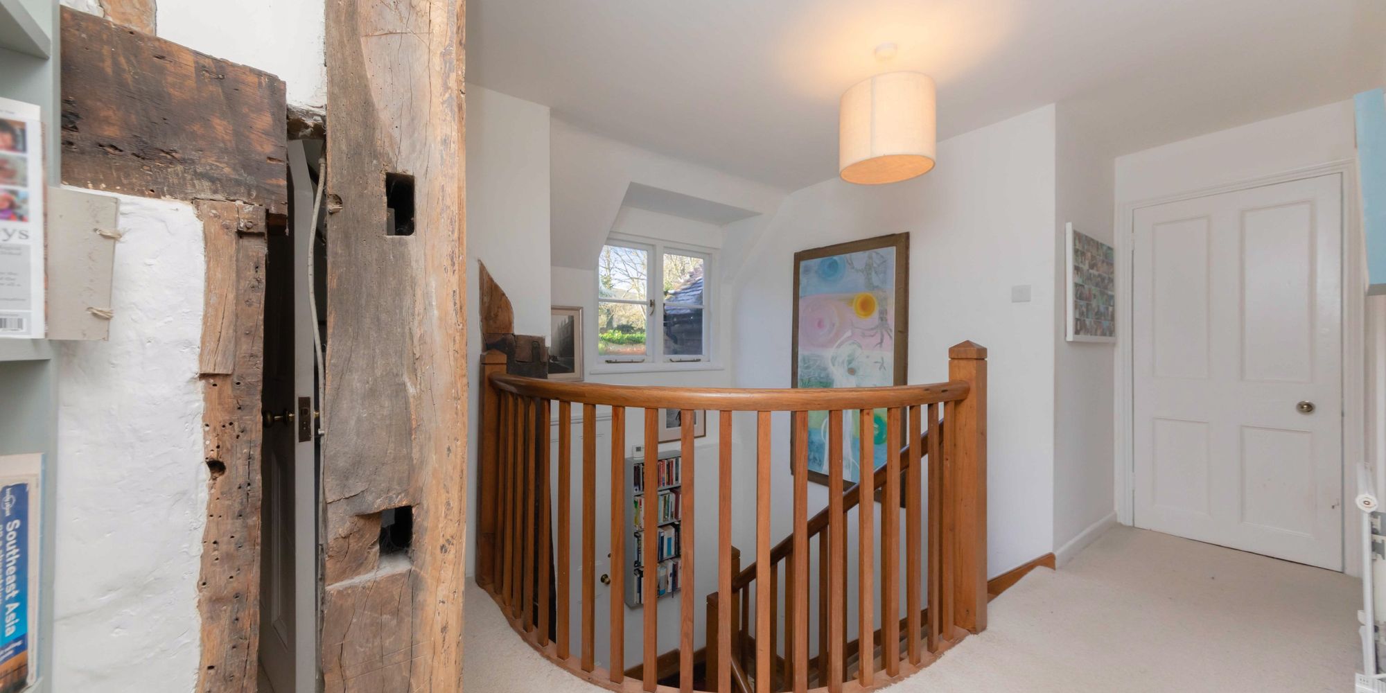 FIRST FLOOR LANDING- A beautiful staircase with sweeping handrail and delicate balustrade. White painted panelled doors to principal rooms, window to the side.