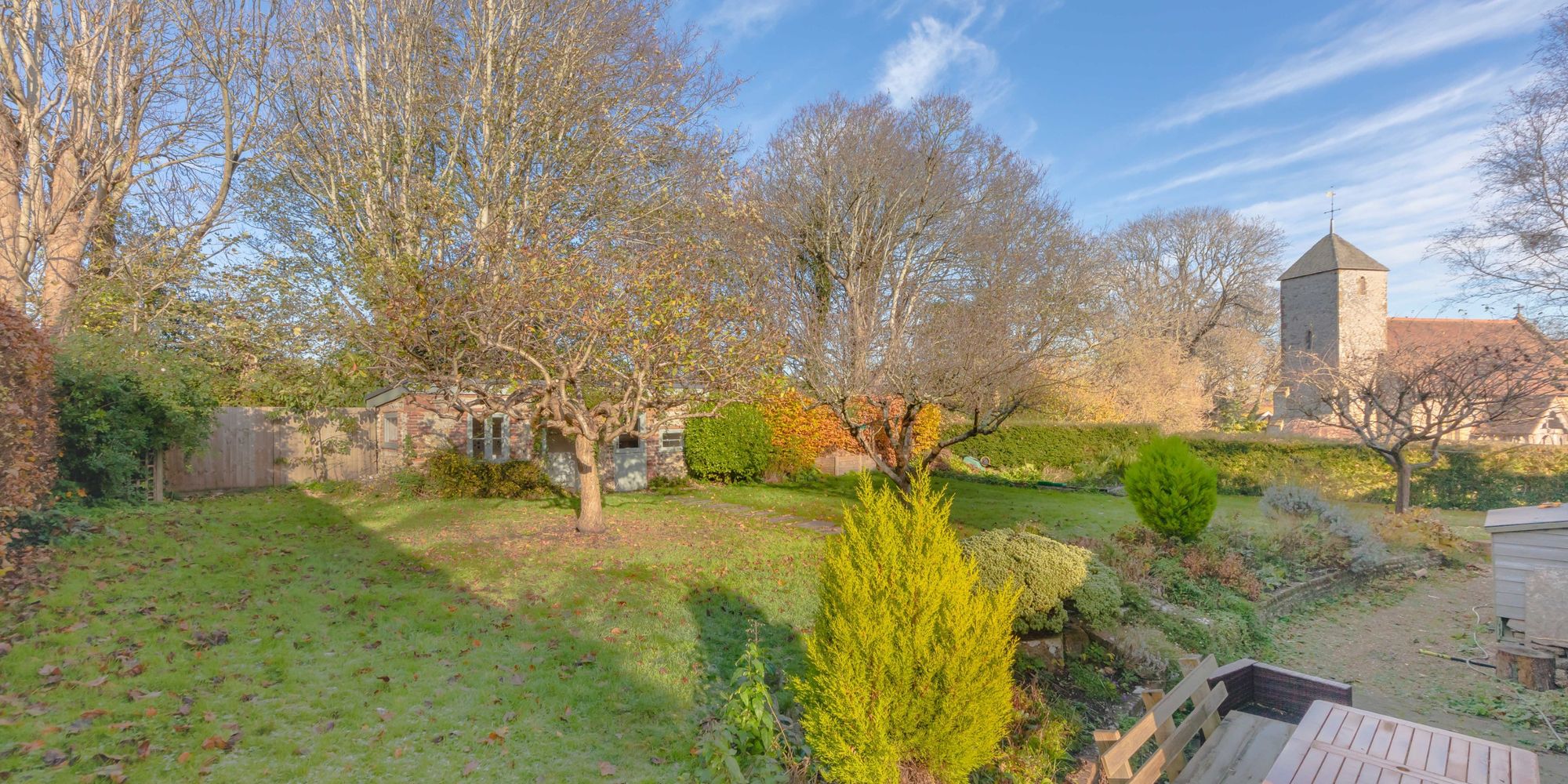 REAR GARDEN- A generously sized and relatively level garden. The garden feels particularly private and is mostly laid to lawn with a brick laid terrace adjacent to the Kitchen Day Room. The garden features established trees, and flower beds. The garden wraps around the property to all sides allowing you to follow the sun but also to find shade. There are exceptional views of the local countryside and the neighbouring church. Within the garden we also find the Garden Studio.