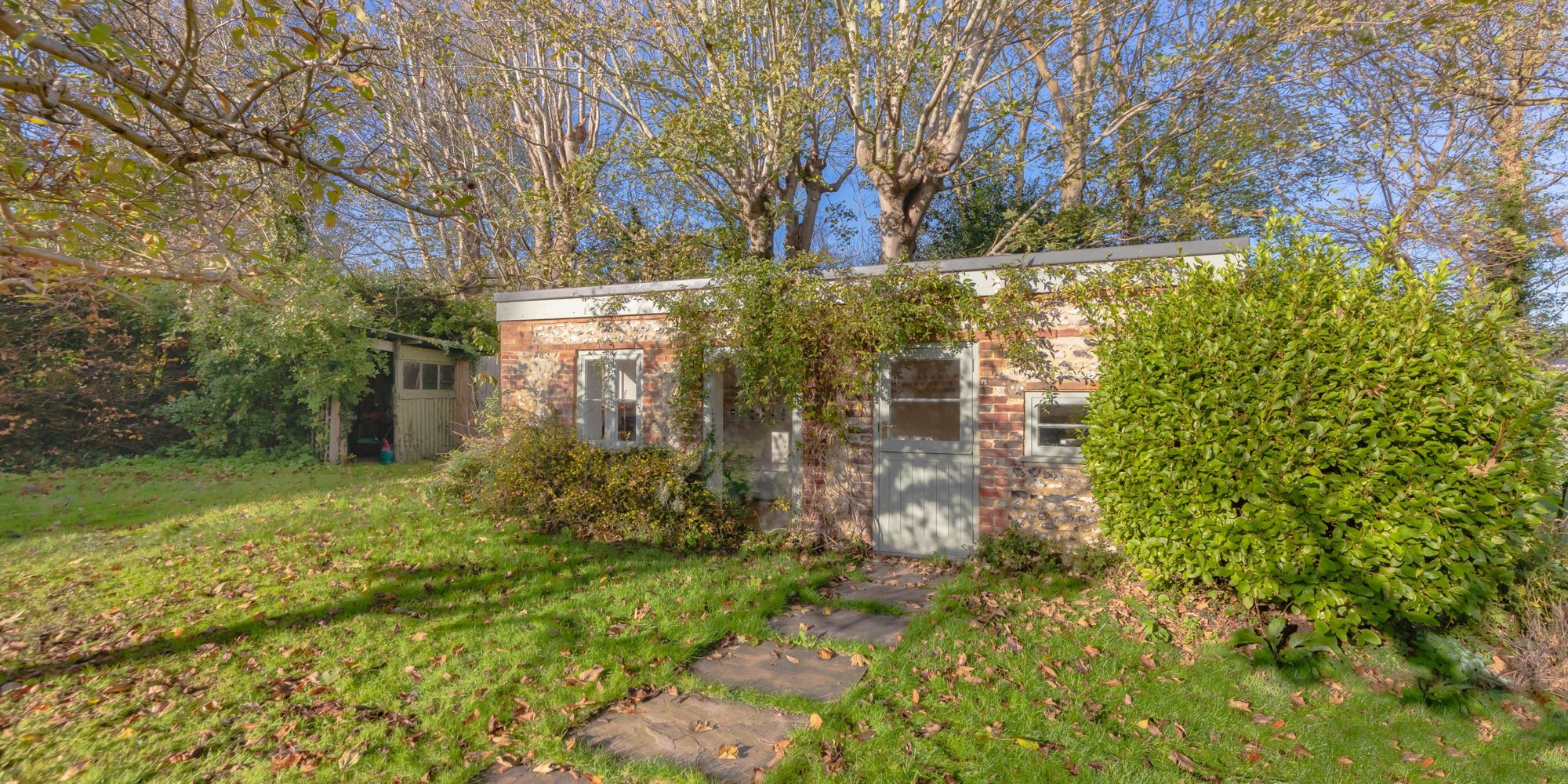 GARDEN STUDIO- Measuring 20ft x 7’5 the detached flint built studio is decorated and insulated with power points and lights, making a wonderful Studio or Home Office.