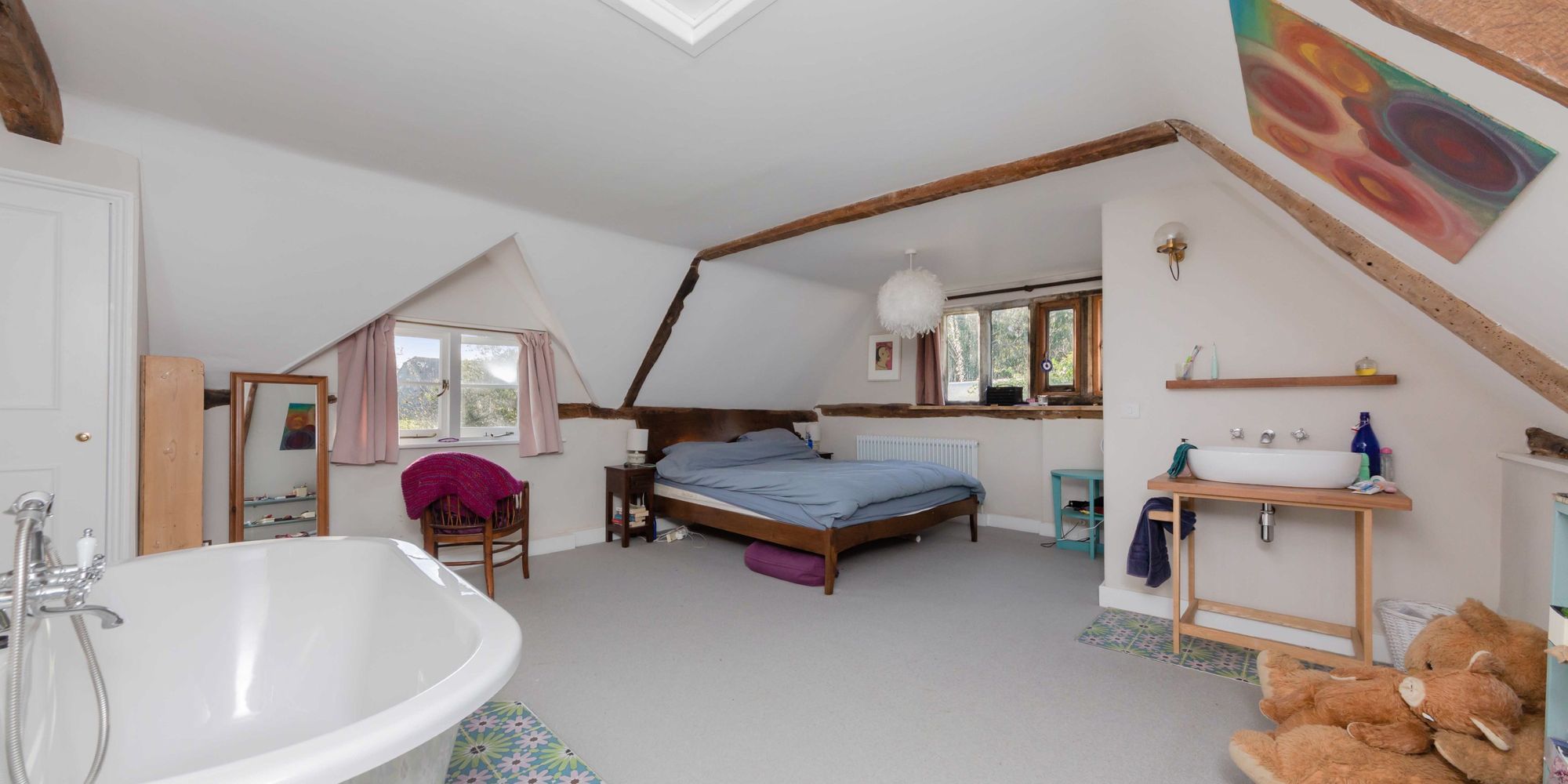 BEDROOM 1- Measuring an impressive 19ft the principal bedroom boasts exceptional views of the South Downs and benefits from ensuite facilities which includes a gorgeous freestanding rolltop bath with claw feet, and a door opens to a cloakroom. The dual aspect bedroom features exposed beams and mullion windows to the side.