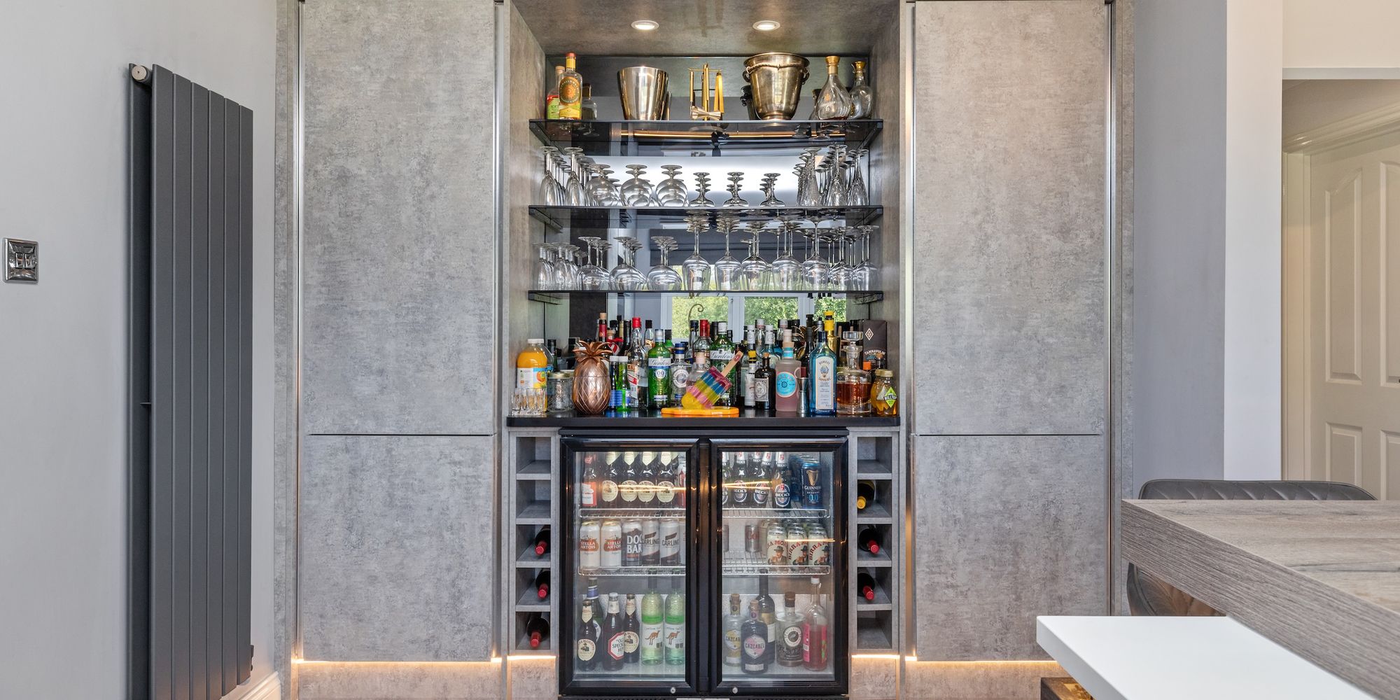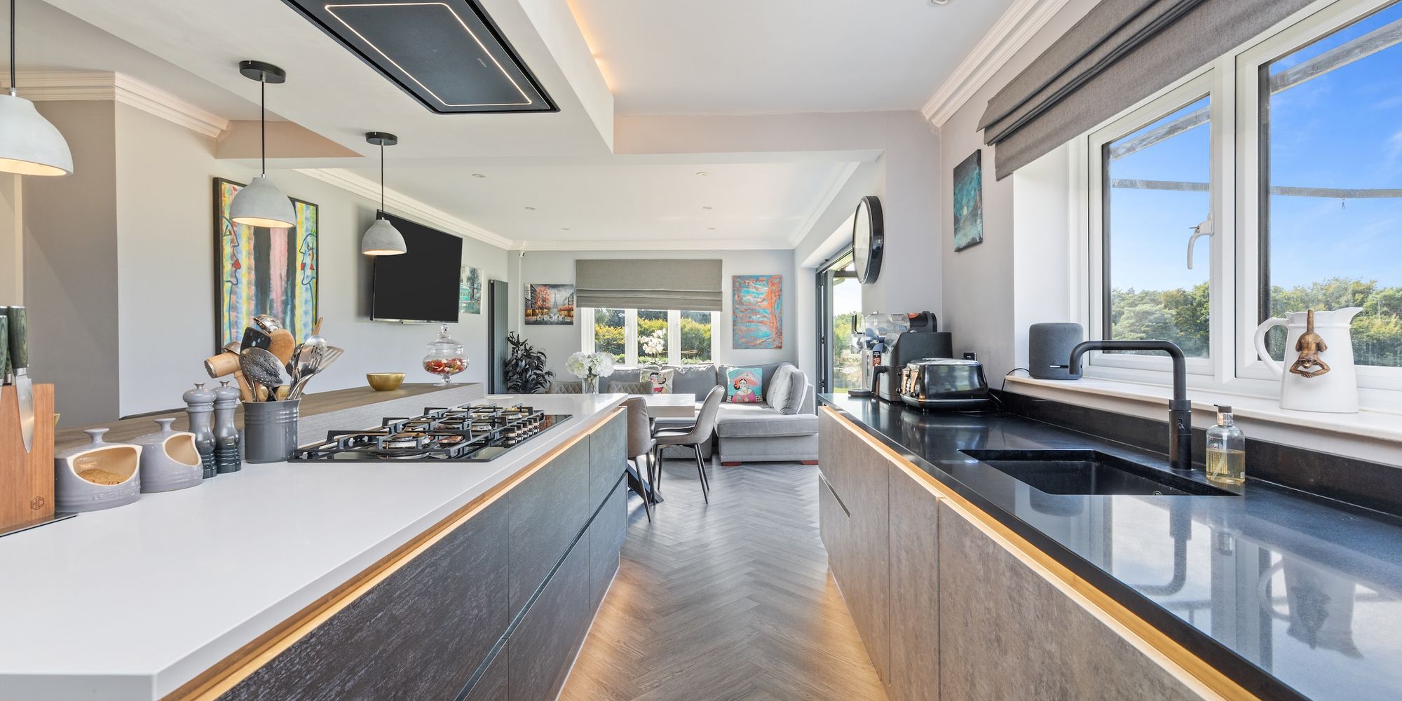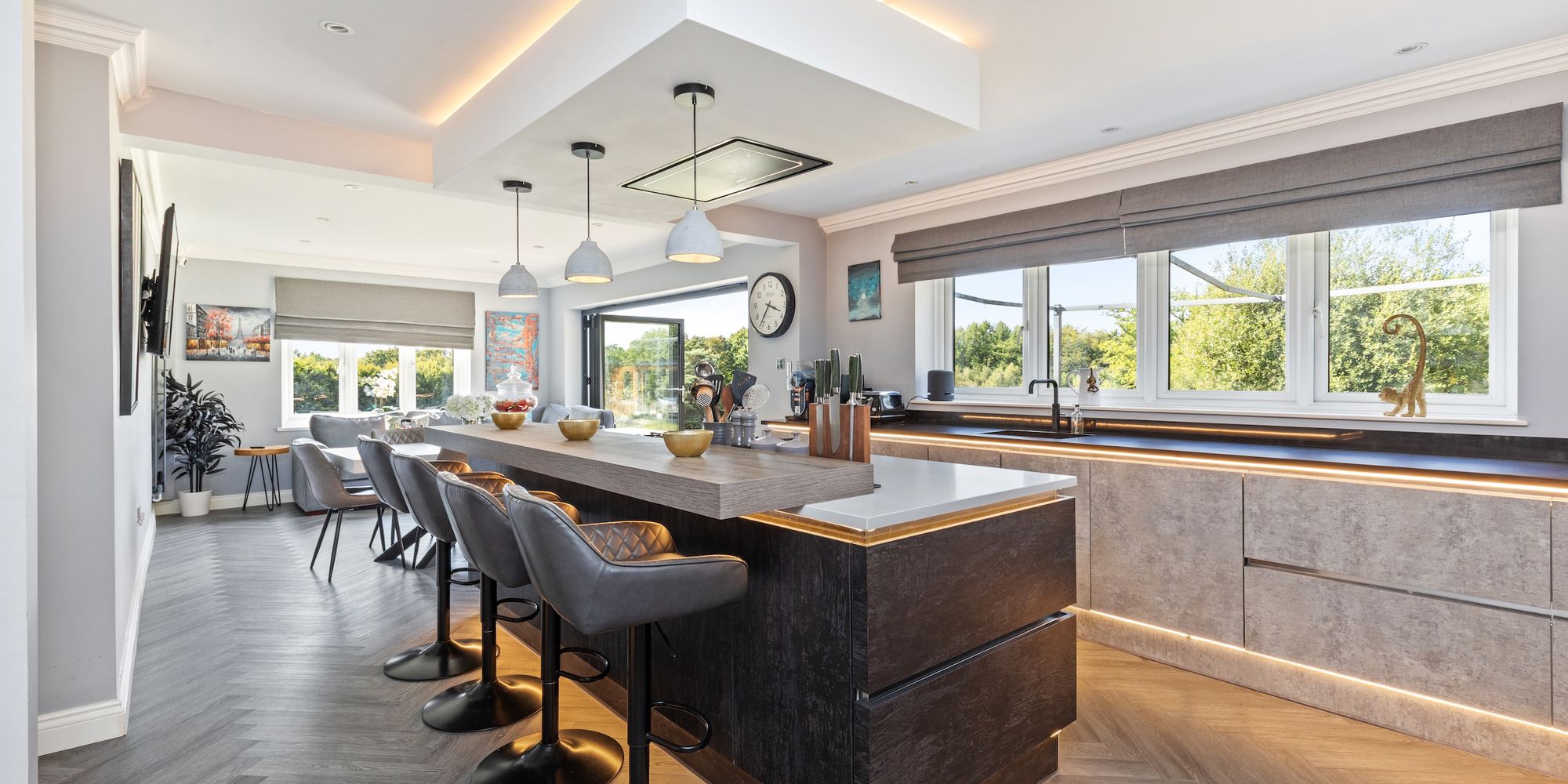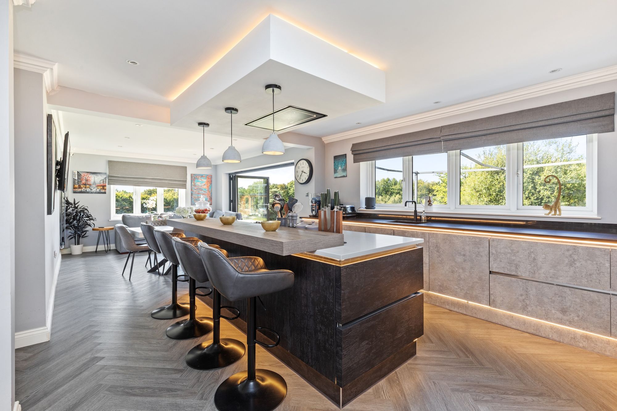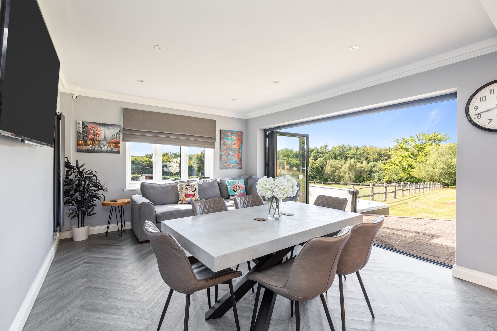 The 29’8 × 16’8 kitchen/dining/family room has been refitted with a beautiful selection of Wren units, Quartz work surfaces, breakfast bar that seats 4 and a bar with refrigeration is perfect for those parties. The integrated AEG appliances include 5 gas ring burner hob, remote controlled extractor, ovens, combination oven/microwave, fridge, dishwasher, and Quooker boiling tap. The dining/family section provide instant access via a set of bi-folding doors onto the decked seating area.