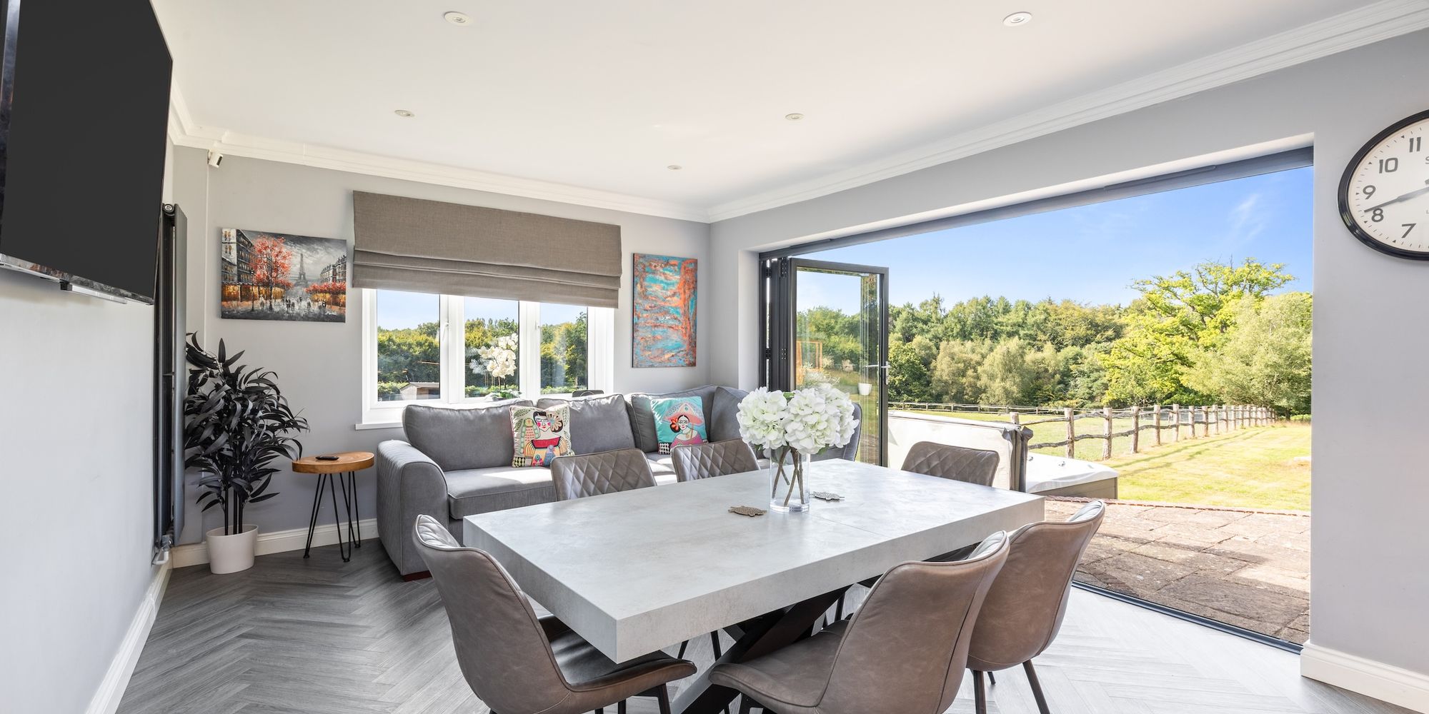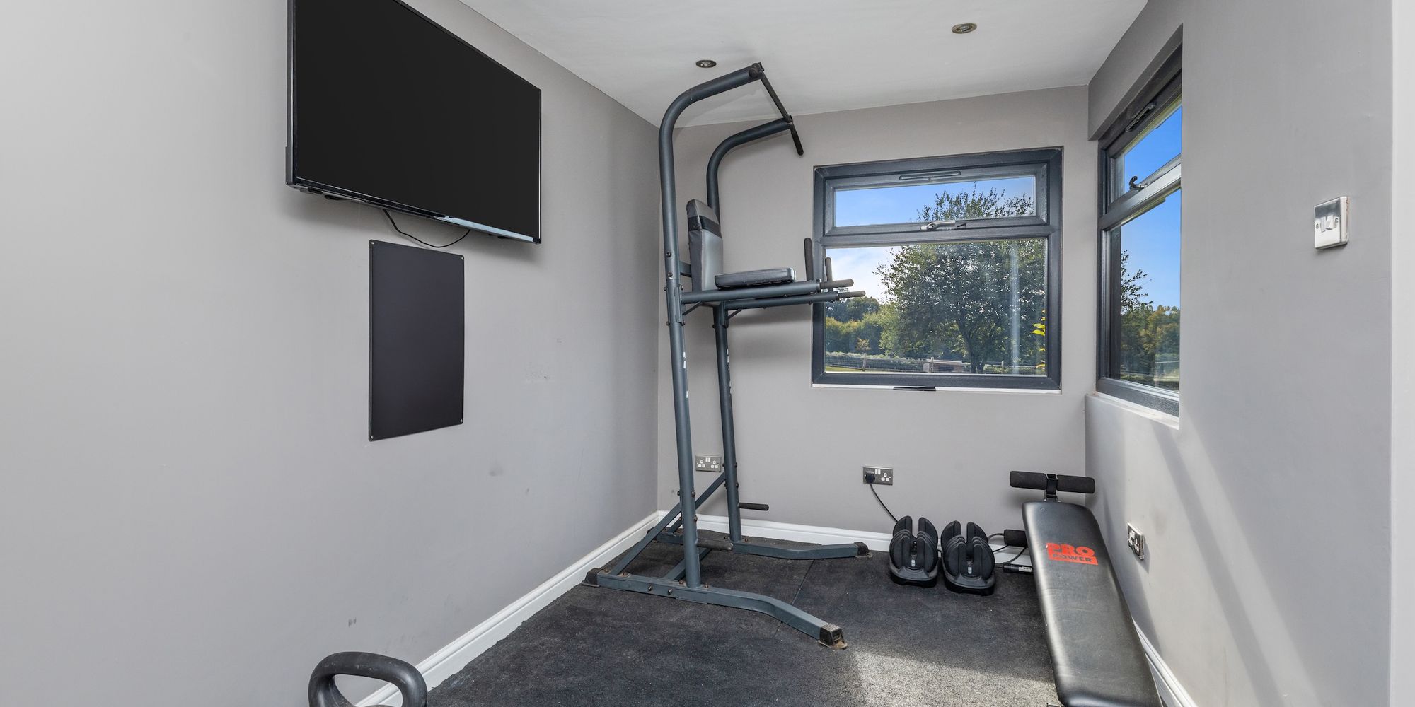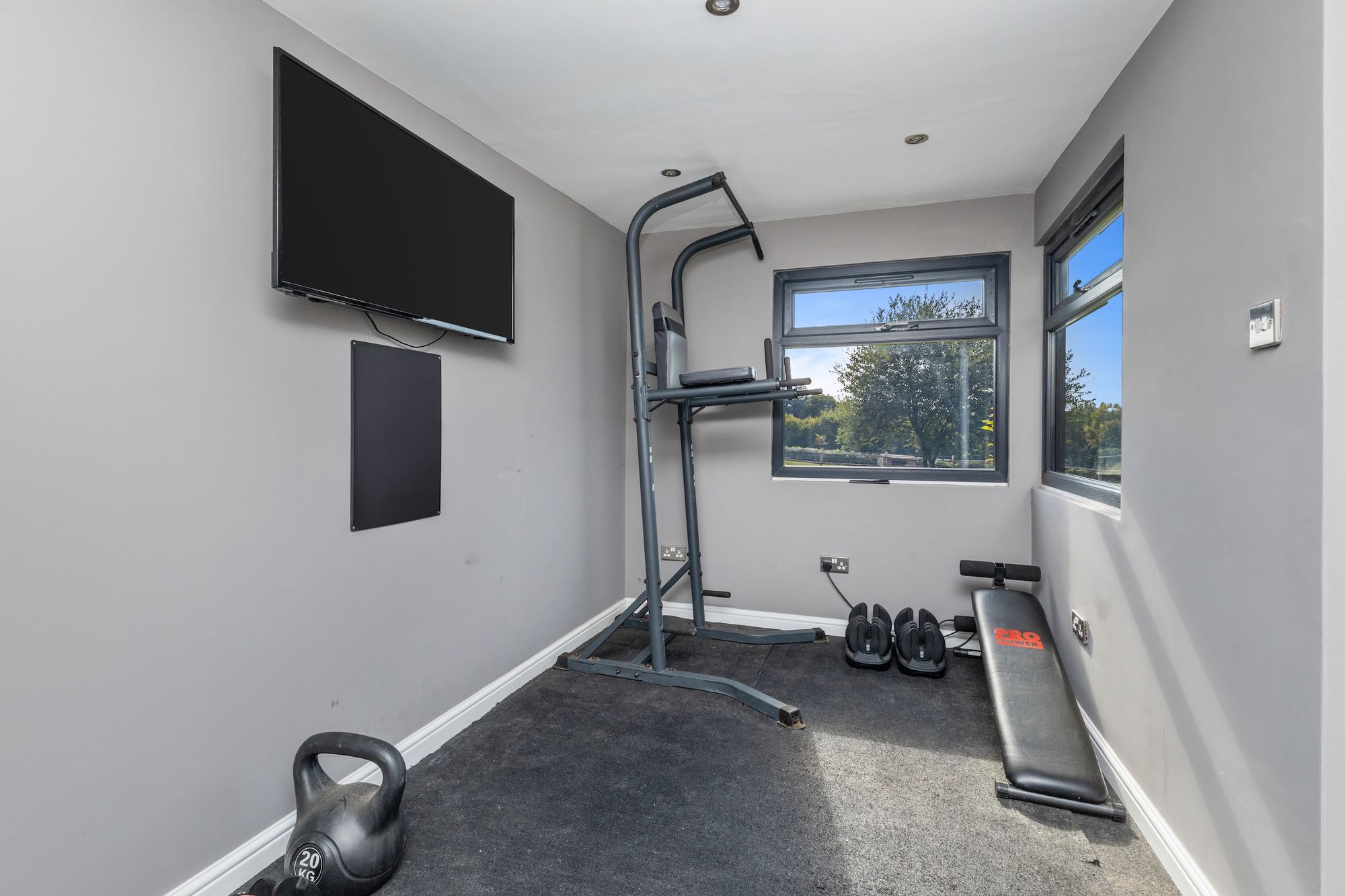 The 16’6 × 12’5 detached studio/garden room with bi-folding doors onto a deck and store room is simply perfect for further entertaining or workspace and has the benefit of an additional attached double aspect 12’6 × 7’ gym room.