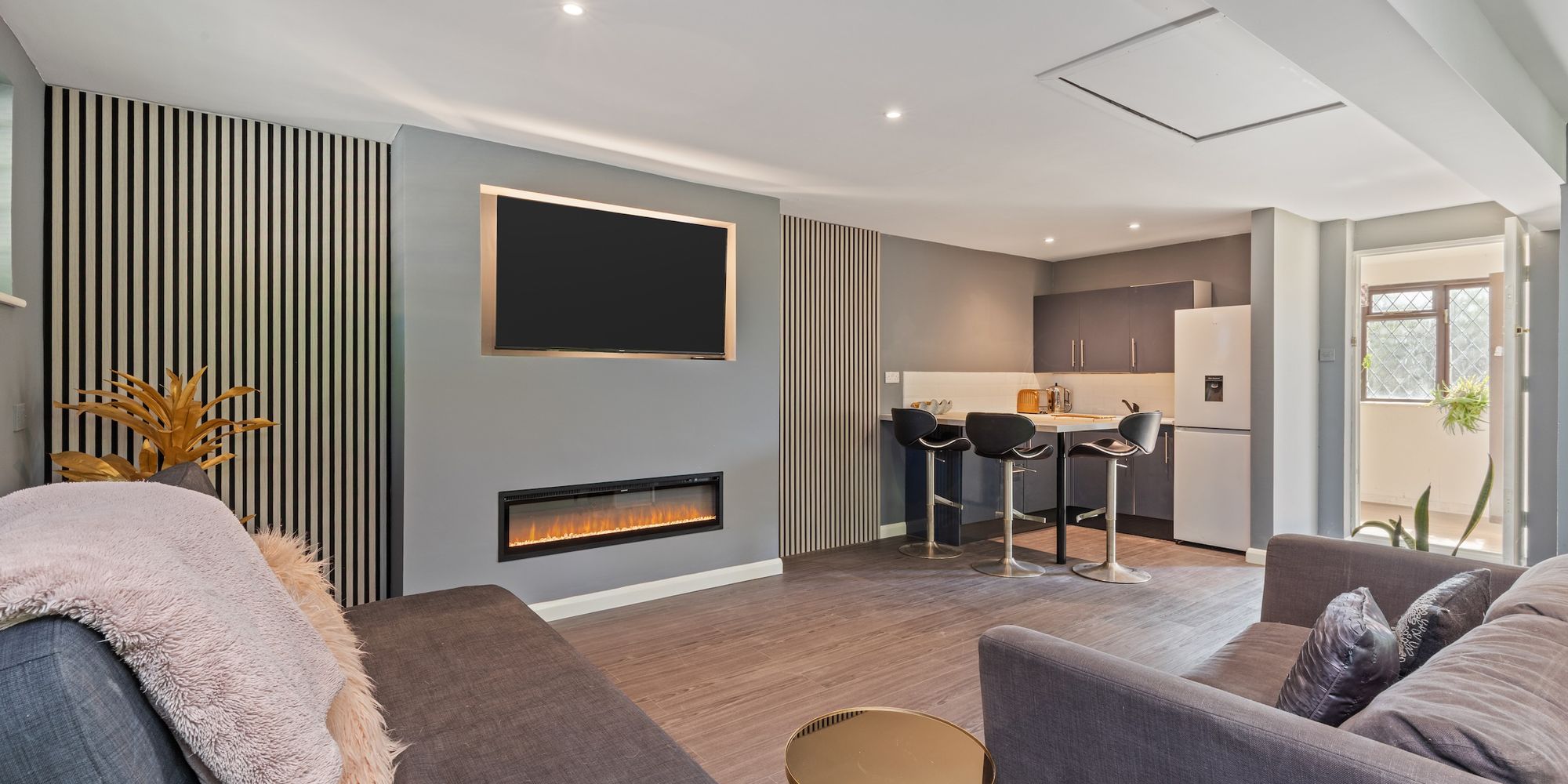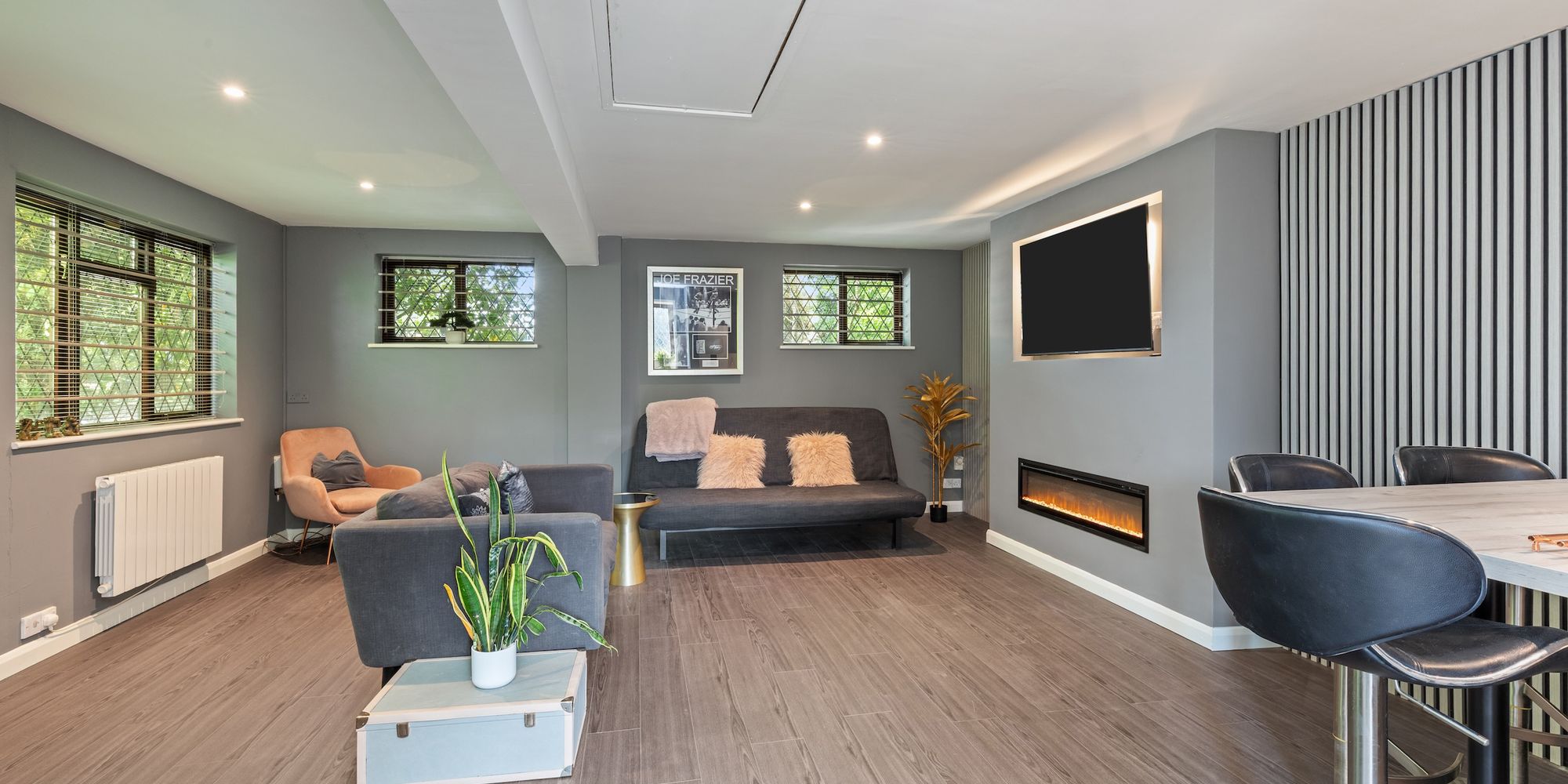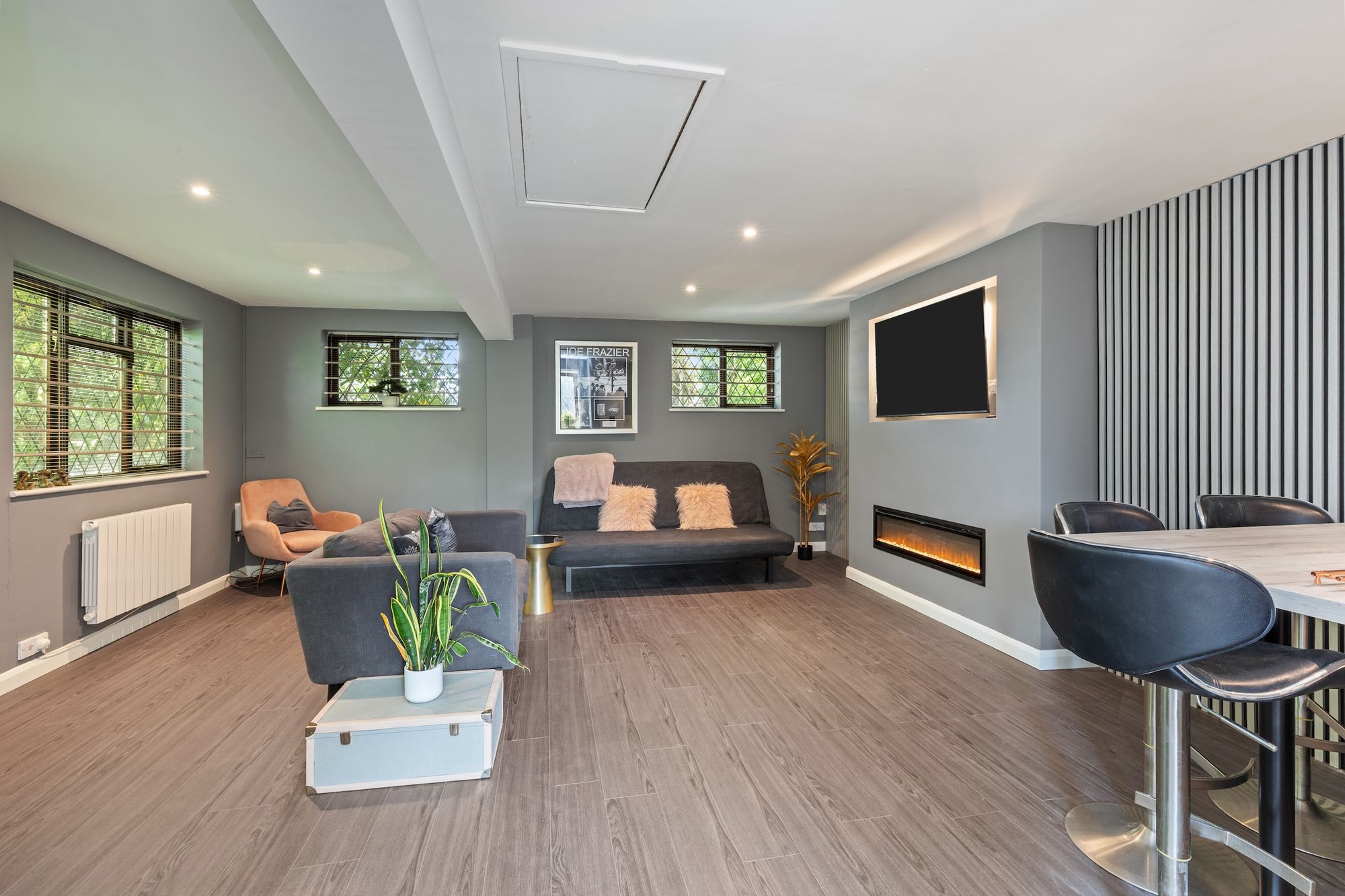 The 16’6 × 12’5 detached studio/garden room with bi-folding doors onto a deck and store room is simply perfect for further entertaining or workspace and has the benefit of an additional attached double aspect 12’6 × 7’ gym room.