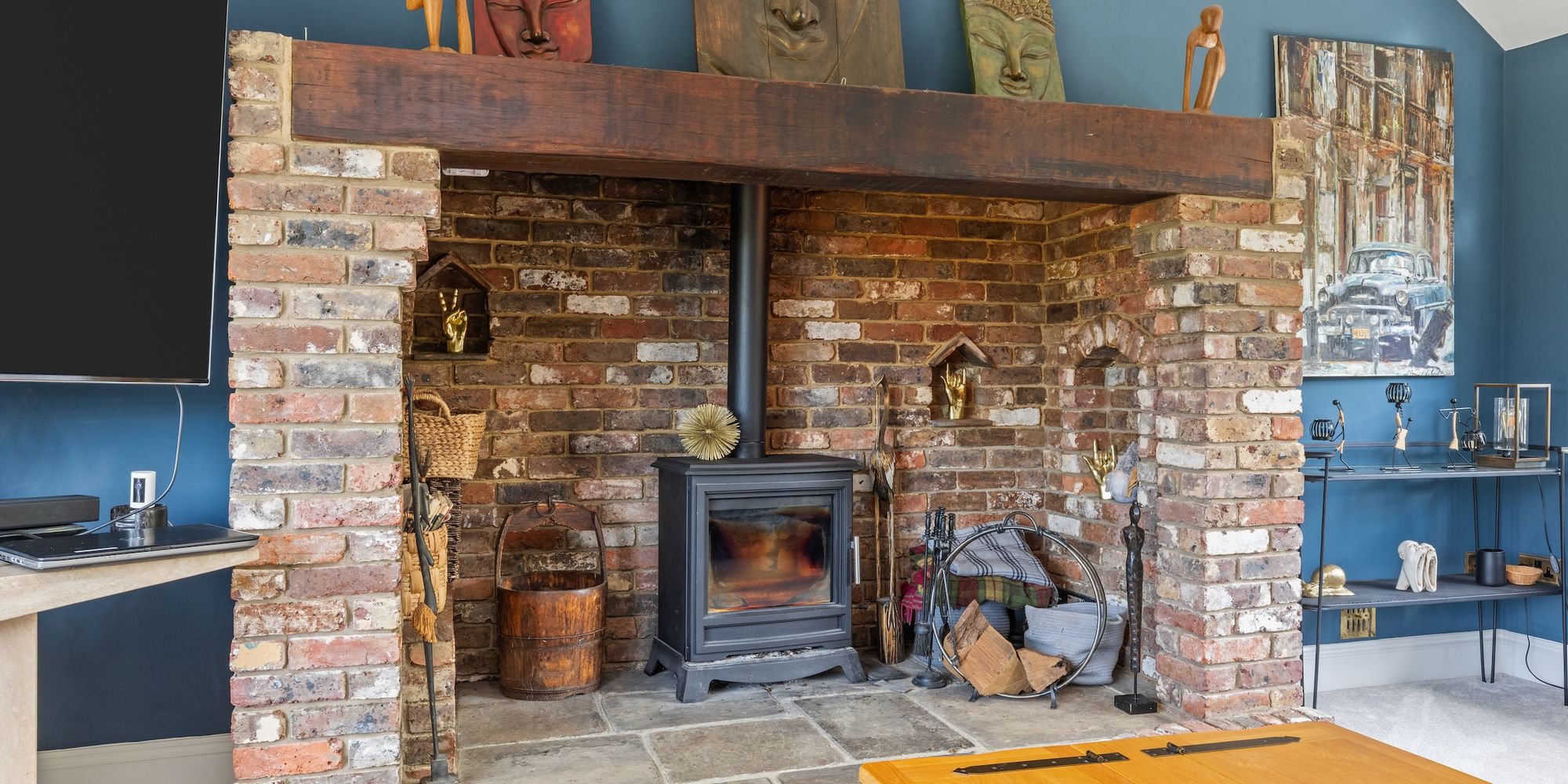 There is further covered parking in the 27’10 × 17’4 open carport with cabling for a EV charge point, attached workshop, sit-on mower store and log store.