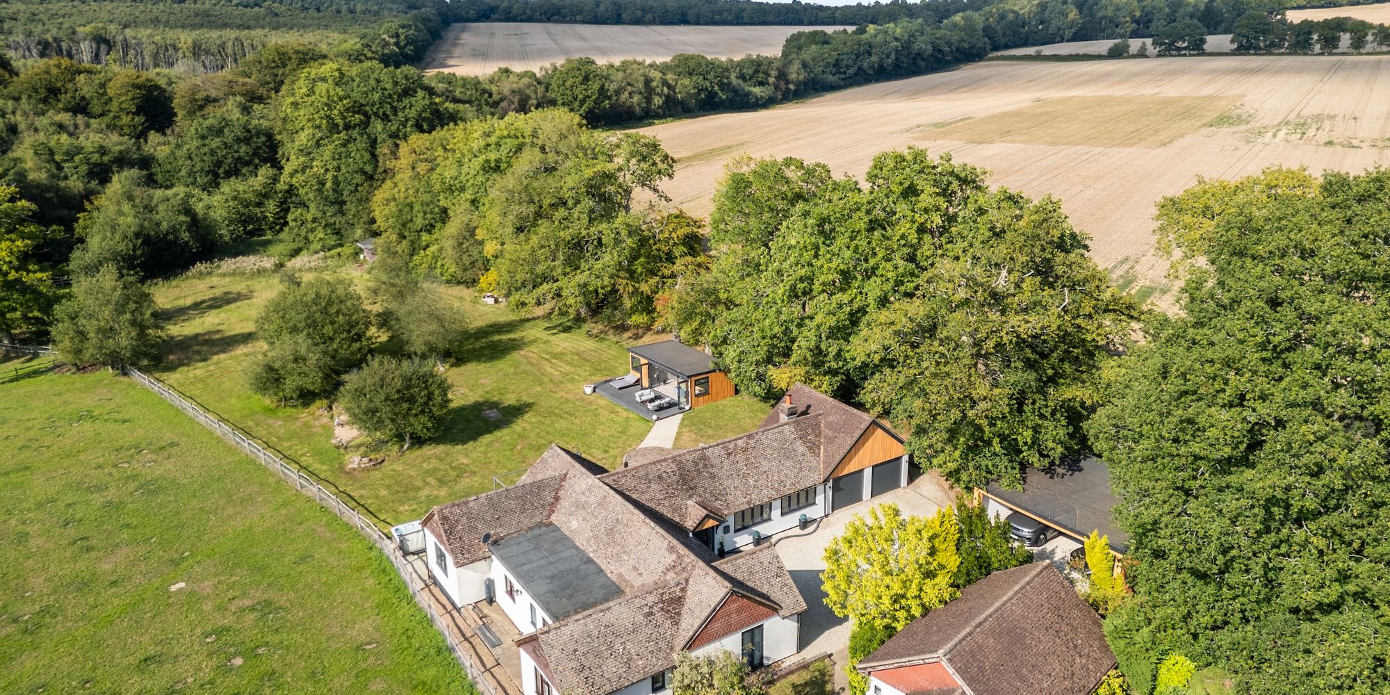 This unique residence occupies a secluded 1.57 acre west facing plot which enjoys a superb outlook towards woodland and benefits from a double garage, separate triple carport with workshop, detached annex and newly constructed studio.