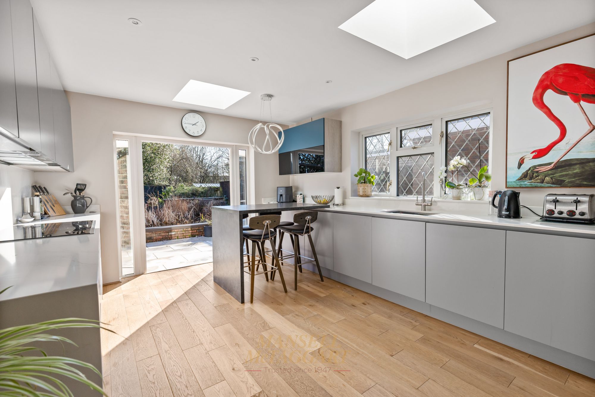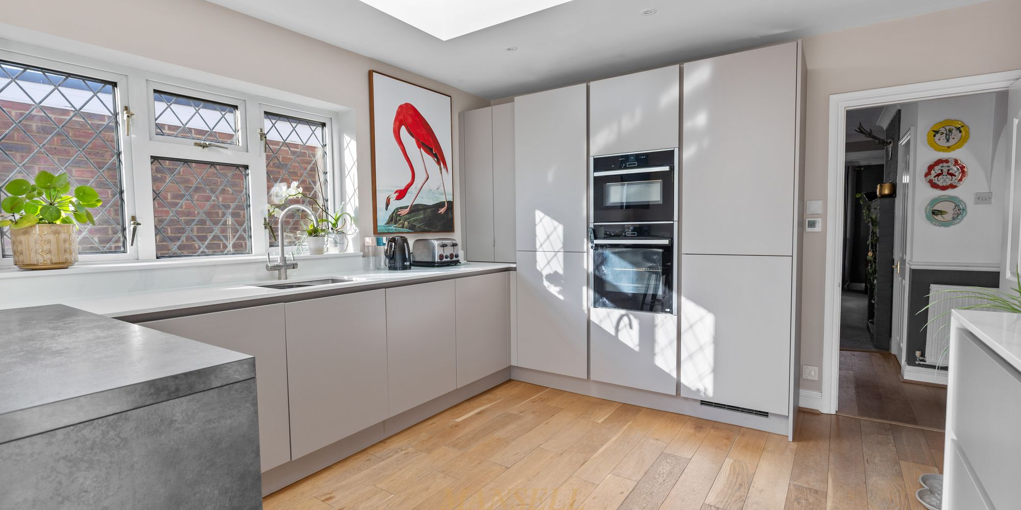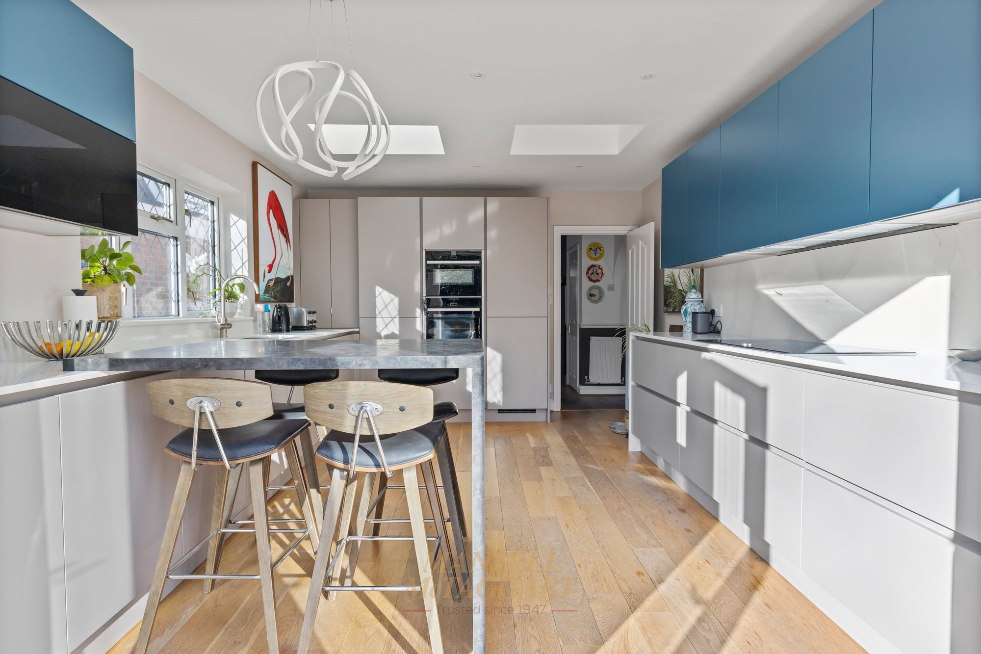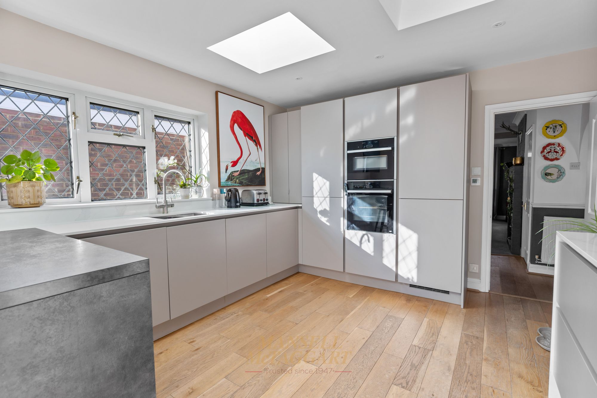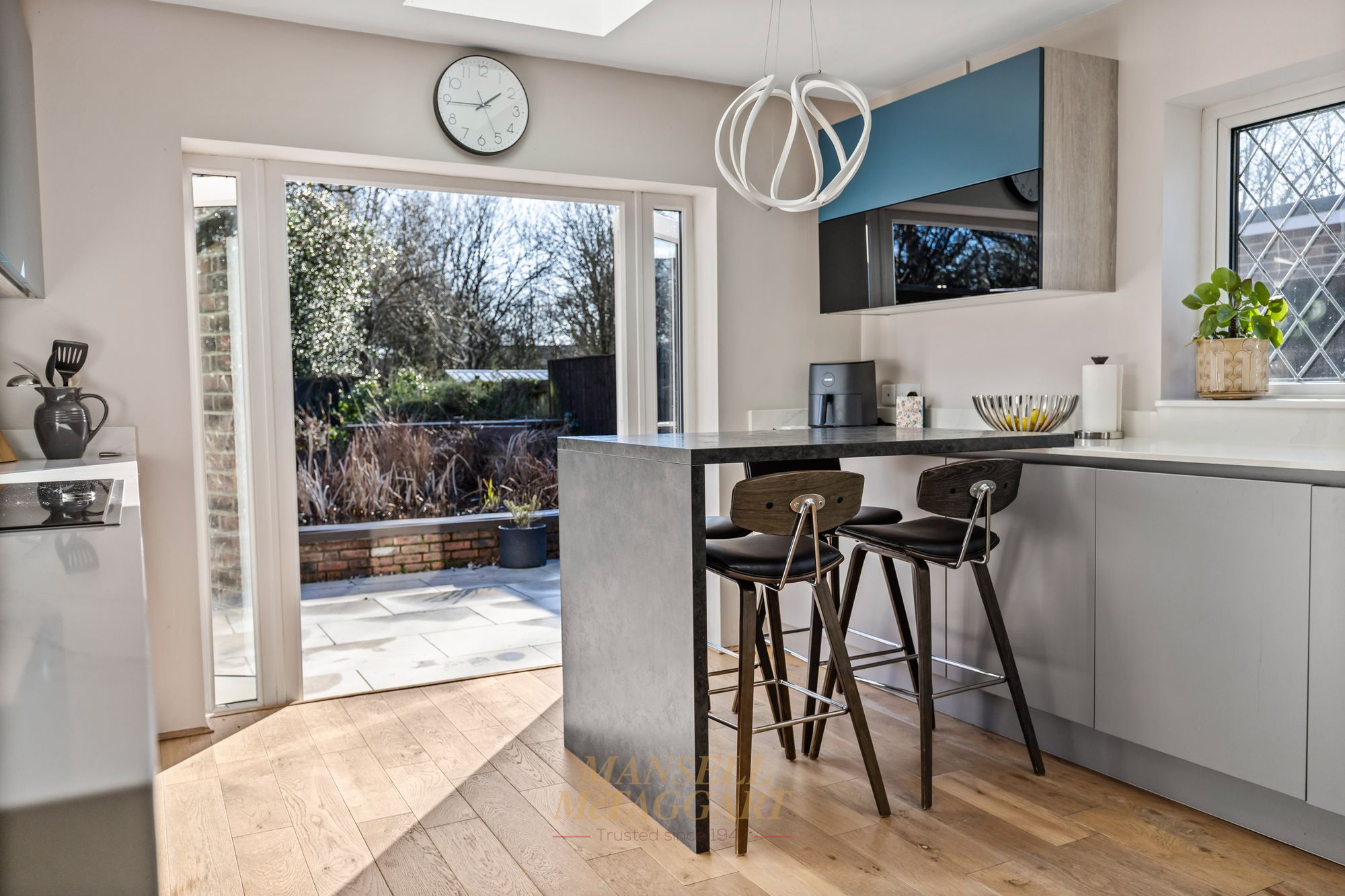 The sleek and stylish kitchen (designed by Schmidt Kitchens) is also positioned to the rear of the house, again benefitting from direct access to the rear garden via French doors, as well as a window to the side and skylights creating a bright and inviting space. The kitchen is fitted with attractive soft close cupboards and drawers with plenty of work surface space over and the addition of a breakfast bar, which can seat four persons. Further benefits include integrated appliances and hardwearing wooden floor underfoot. There is a utility room to further compliment the kitchen, which also has a door to side.