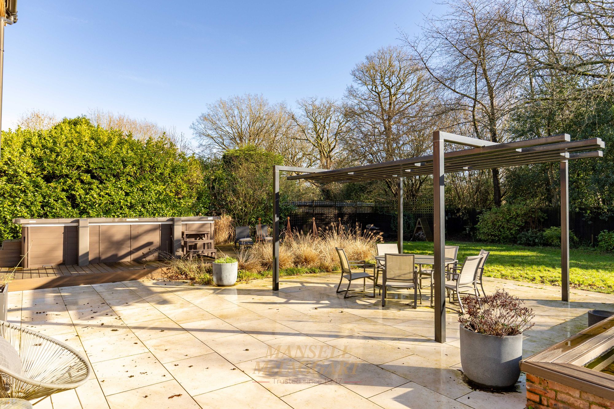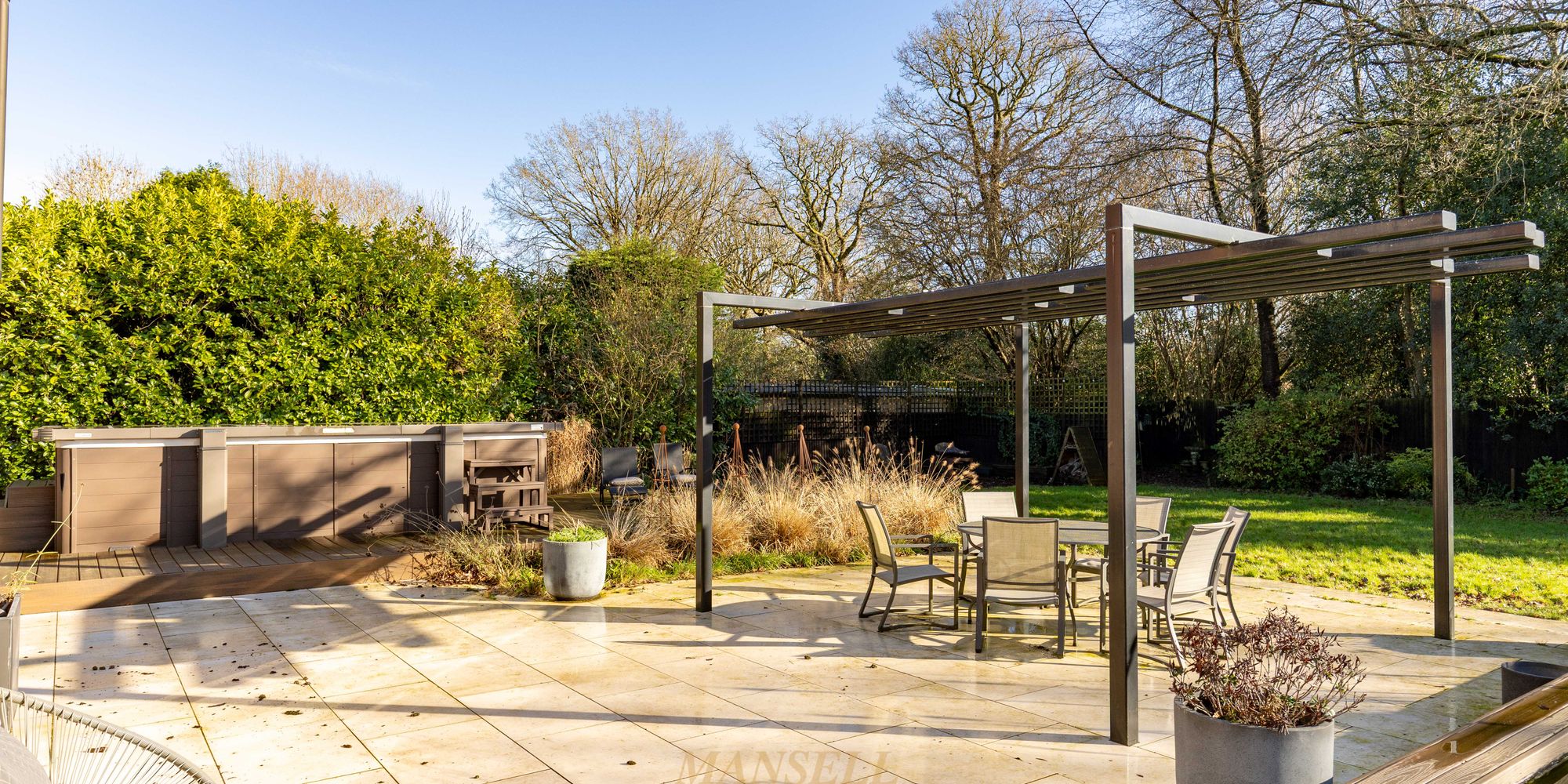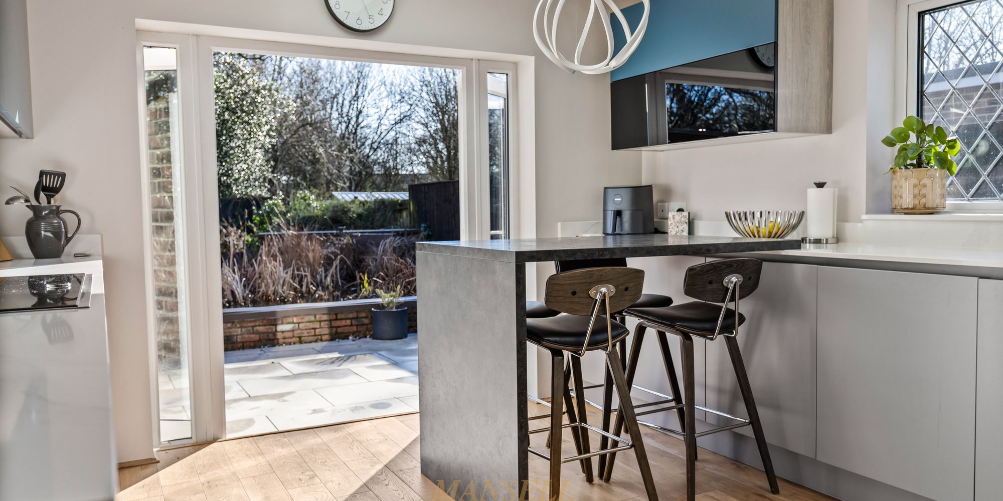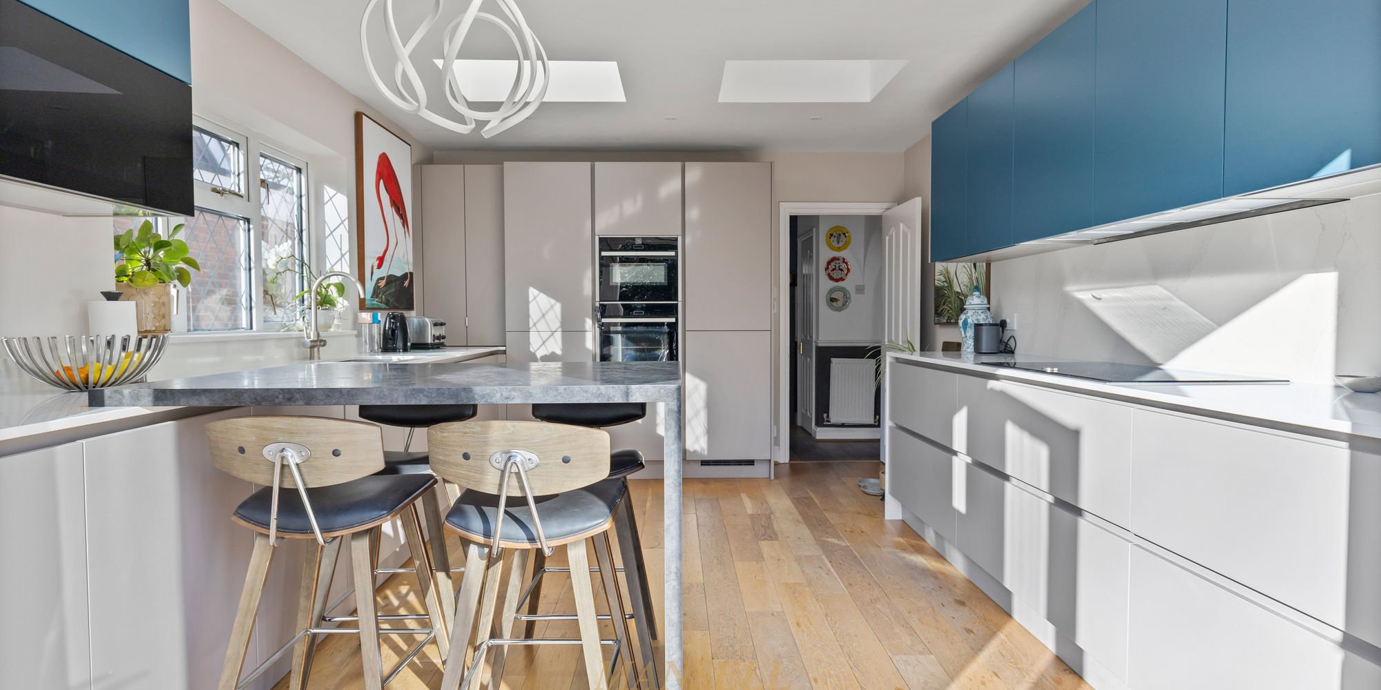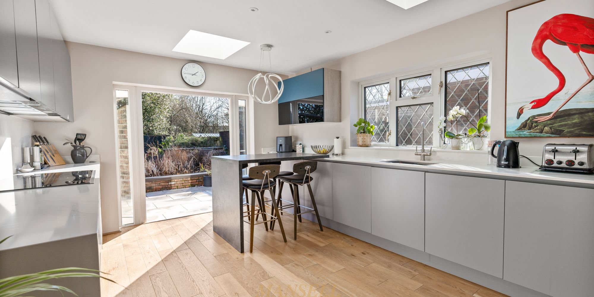 The sleek and stylish kitchen (designed by Schmidt Kitchens) is also positioned to the rear of the house, again benefitting from direct access to the rear garden via French doors, as well as a window to the side and skylights creating a bright and inviting space. The kitchen is fitted with attractive soft close cupboards and drawers with plenty of work surface space over and the addition of a breakfast bar, which can seat four persons. Further benefits include integrated appliances and hardwearing wooden floor underfoot. There is a utility room to further compliment the kitchen, which also has a door to side.