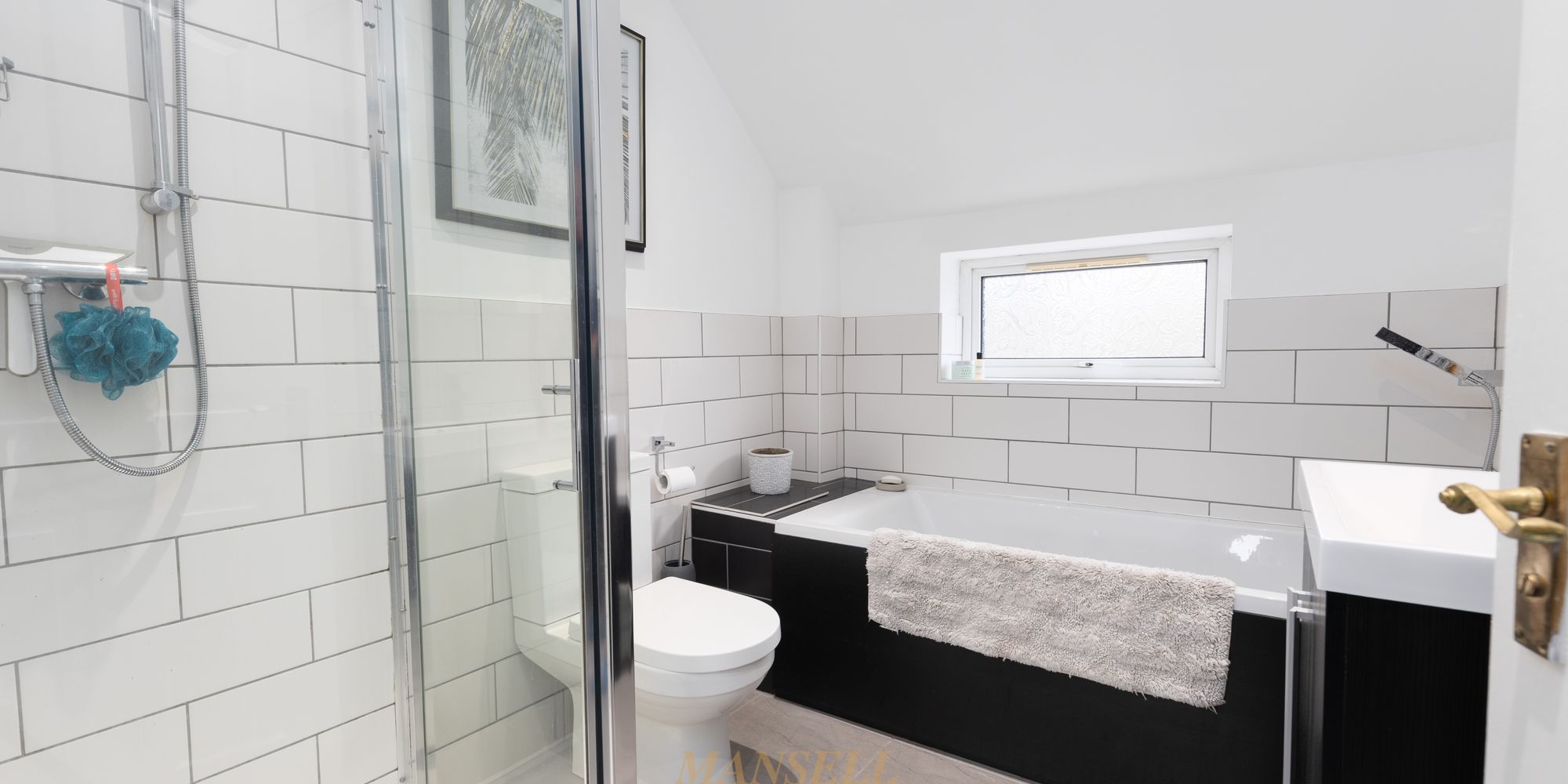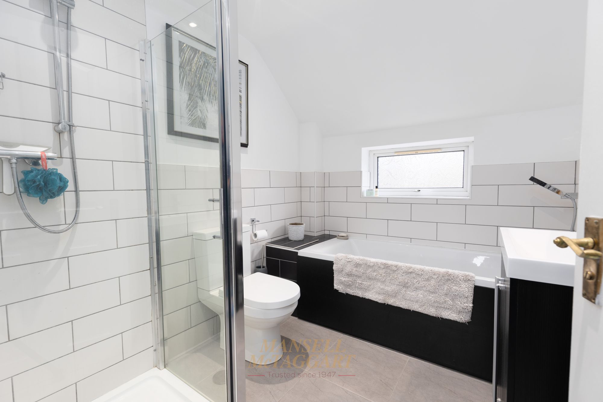 Finally, the family bathroom is fitted in a modern and contemporary white suite comprising of a panelled bathtub with attached shower unit, separate shower cubicle, WC, wash hand basin with storage beneath and opaque window.