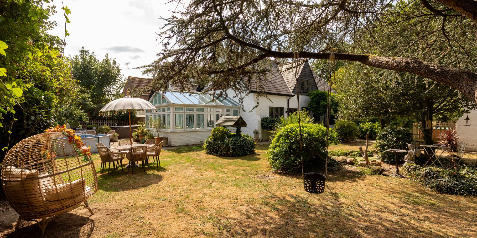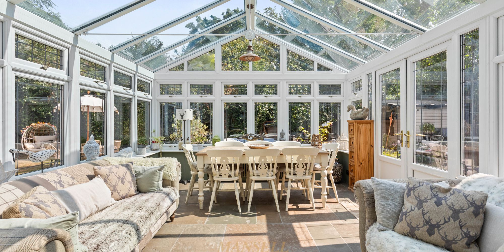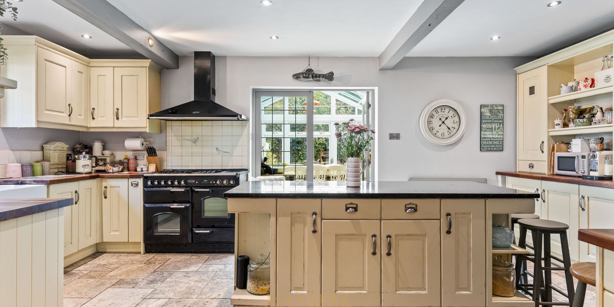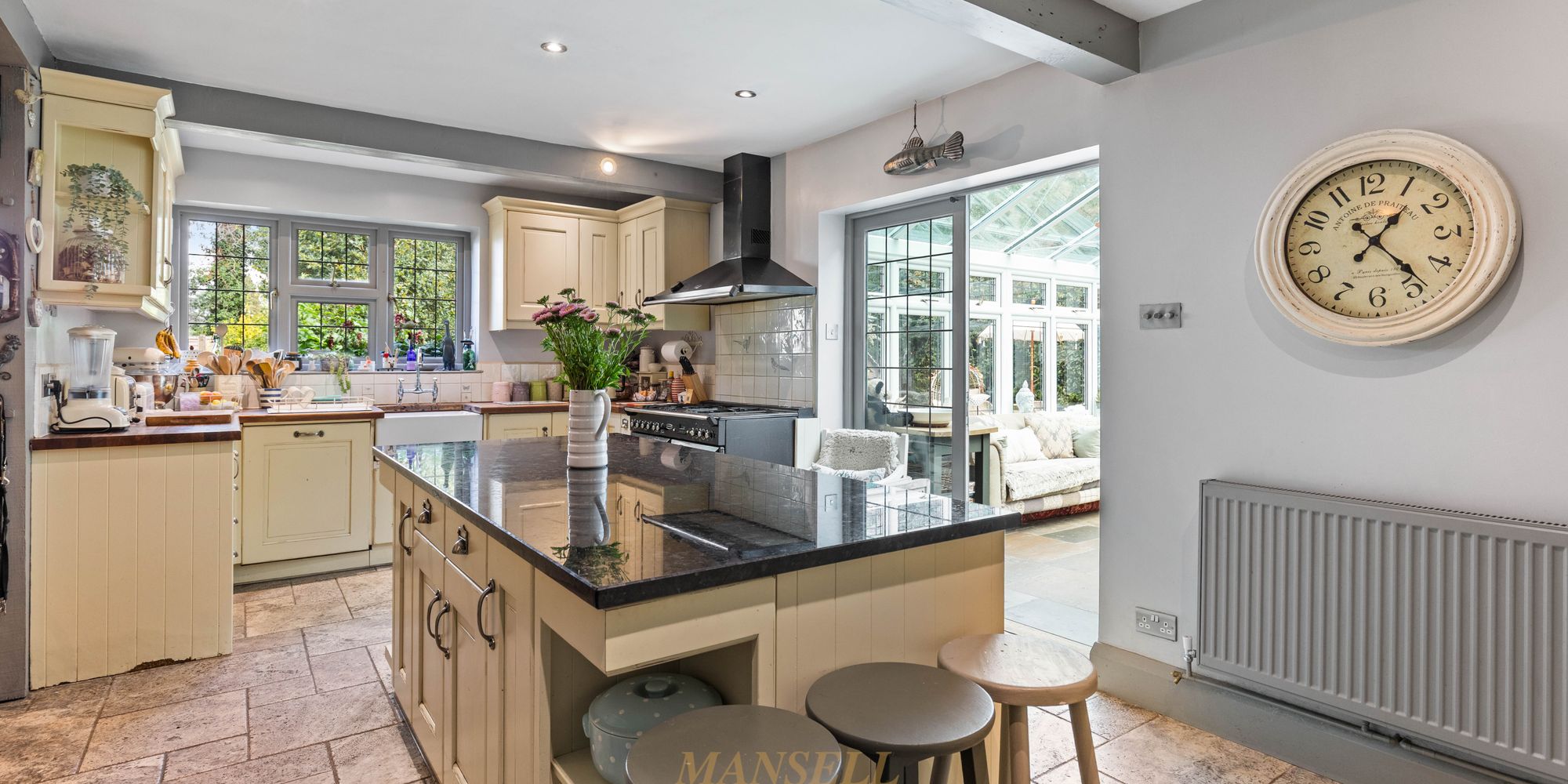The living space briefly encompasses a generous living room, with dual aspect windows and feature fireplace, and a separate kitchen/dining area. here there is a grand dining space easily accommodating an 8+ person dining table, and a kitchen/breakfast area with tasteful wall and base units, a large blue/black granite island with other worktops being iroko wood and a host of fitted and freestanding appliances with the flooring laid with silver travertine flagstones. Doors also lead to the conservatory with triple aspect windows and doors to garden laid with Old London sandstone flagstones, and a utility room with butler sink and further appliances along with plumbing for 2 washing machines with a separate tumble dryer, plus extra fridge freezer, oak worktop and cupboards above with a convenient pantry also available. Completing the downstairs, there is a well proportioned double bedroom with an en-suite.