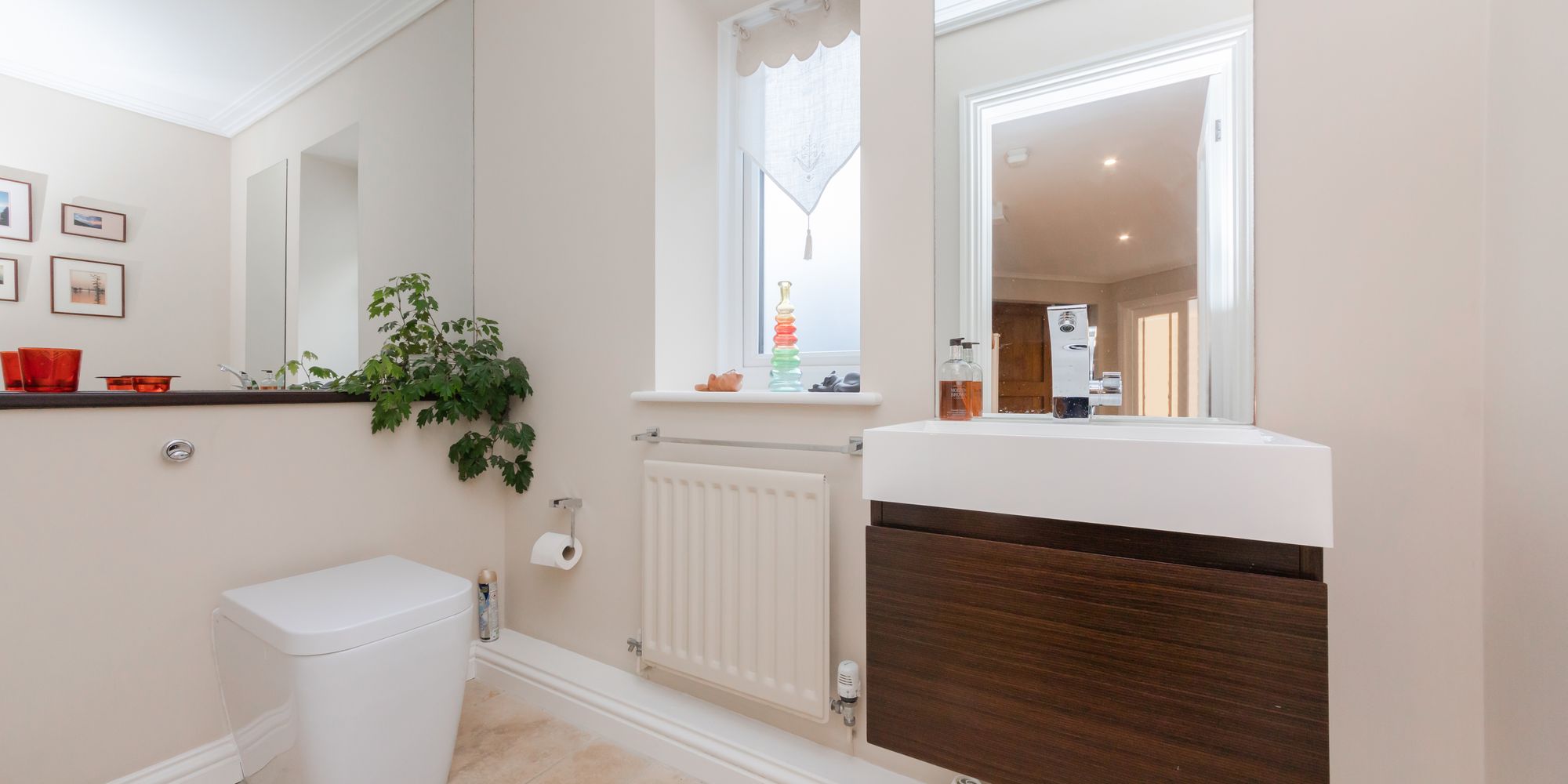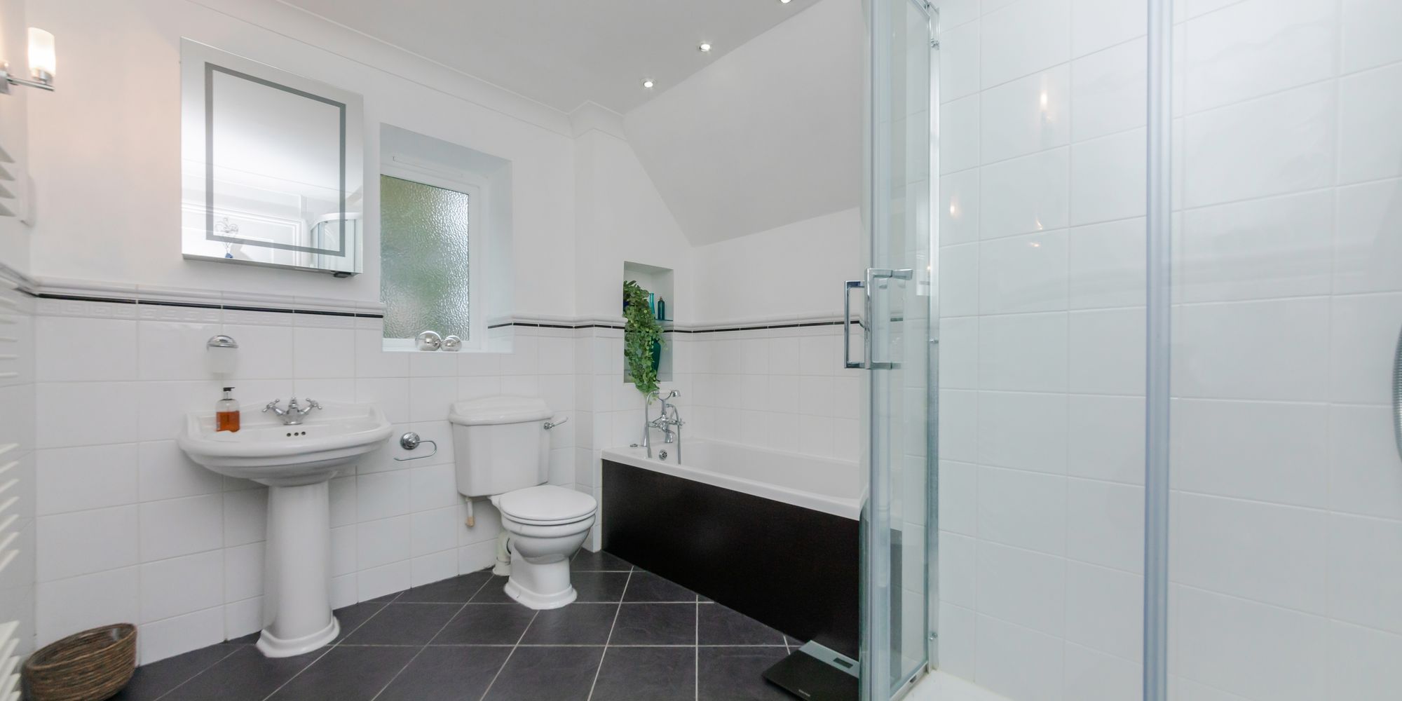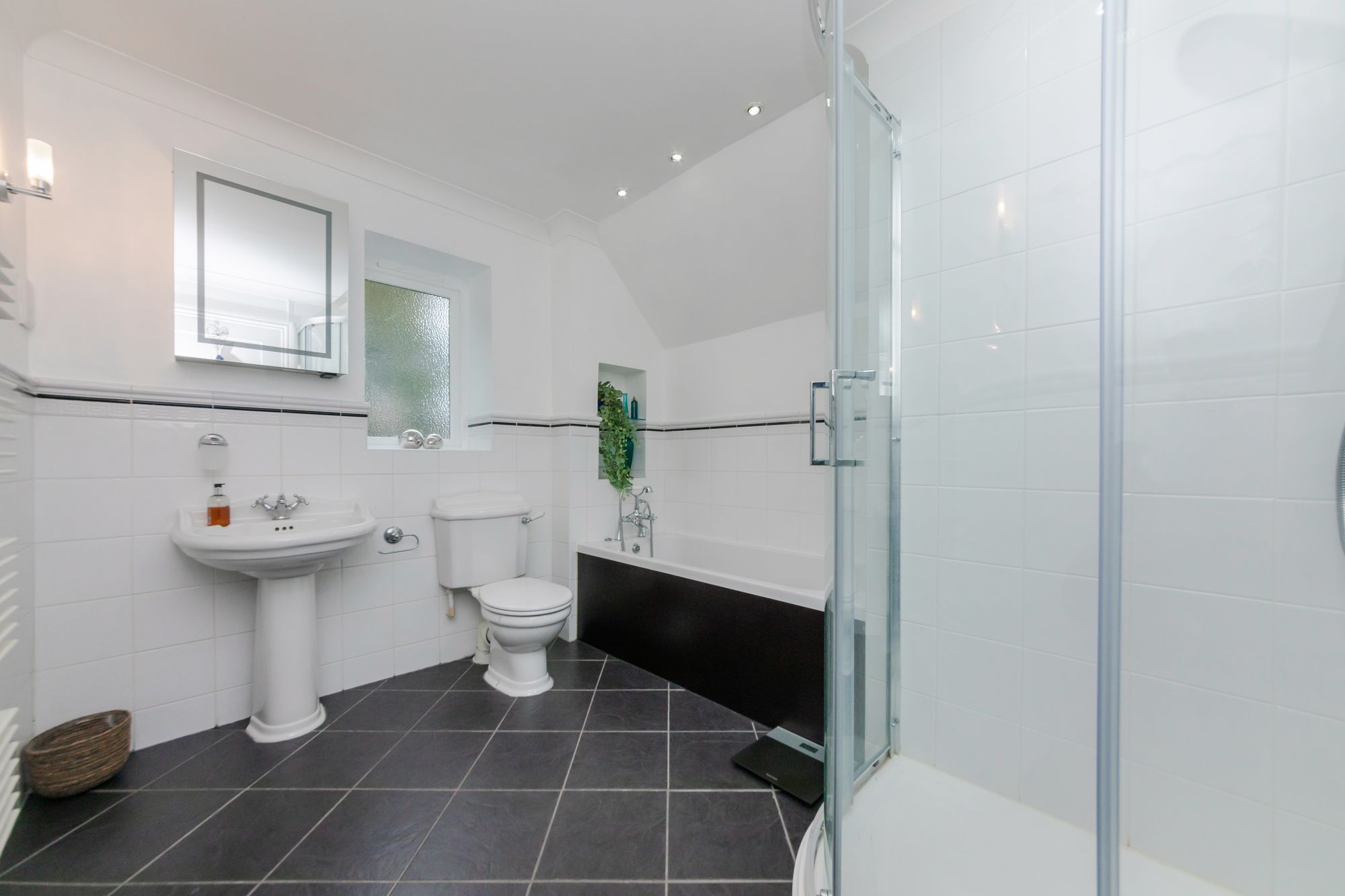 FAMILY BATHROOM- Fitted white suite comprising a panel enclosed bath with chrome mixer tap and hand-held shower attachment, corner shower cubicle with glass door and tiled enclosure, pedestal wash hand basin with chrome mixer tap, low level W.C. matching part tiled walls, heated towel rail, obscured window, tiled floor.