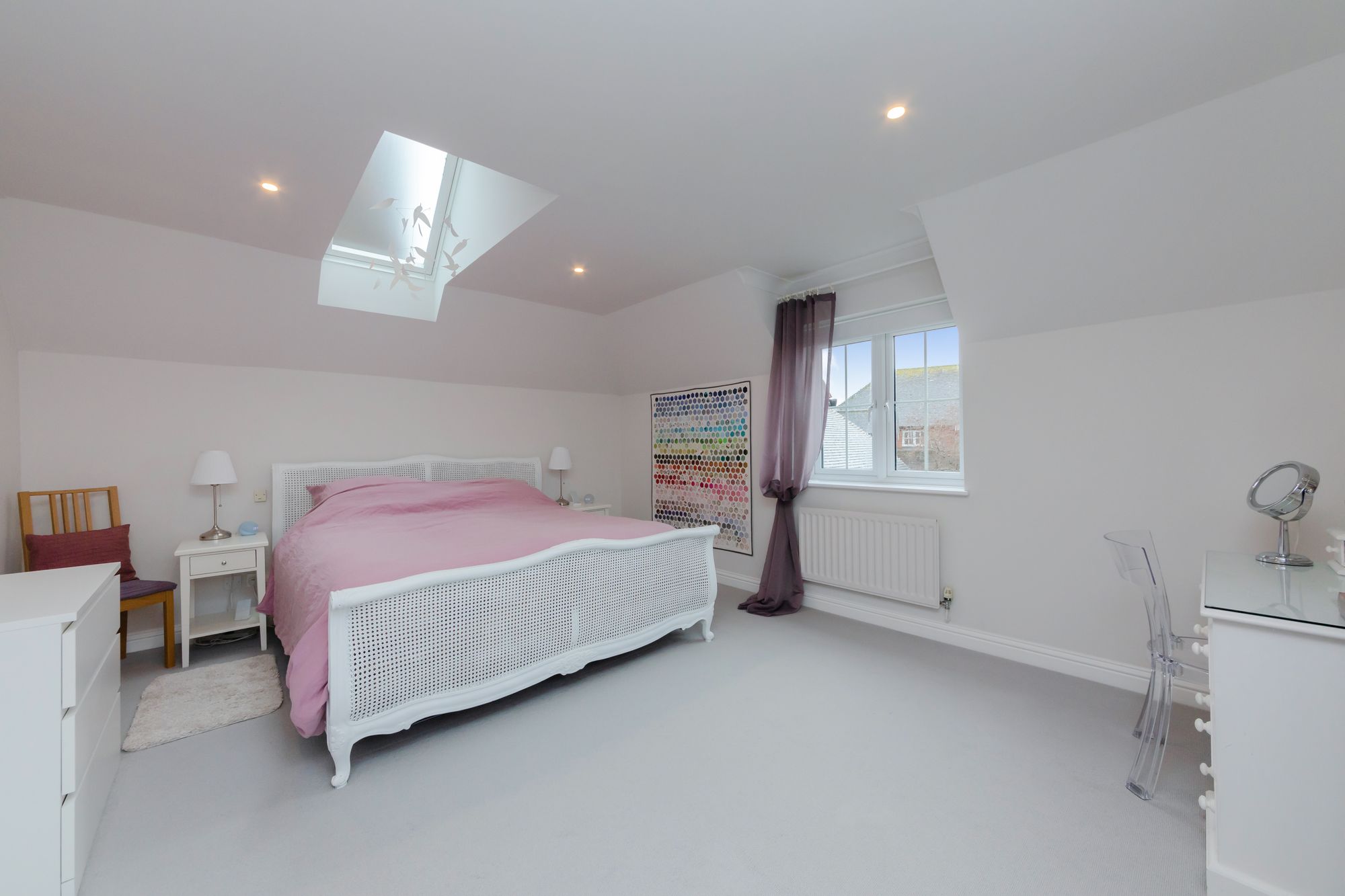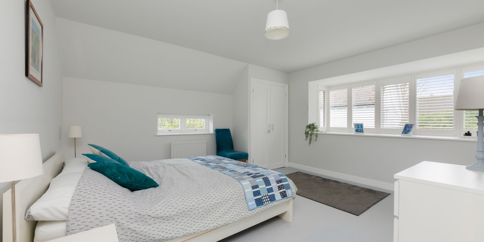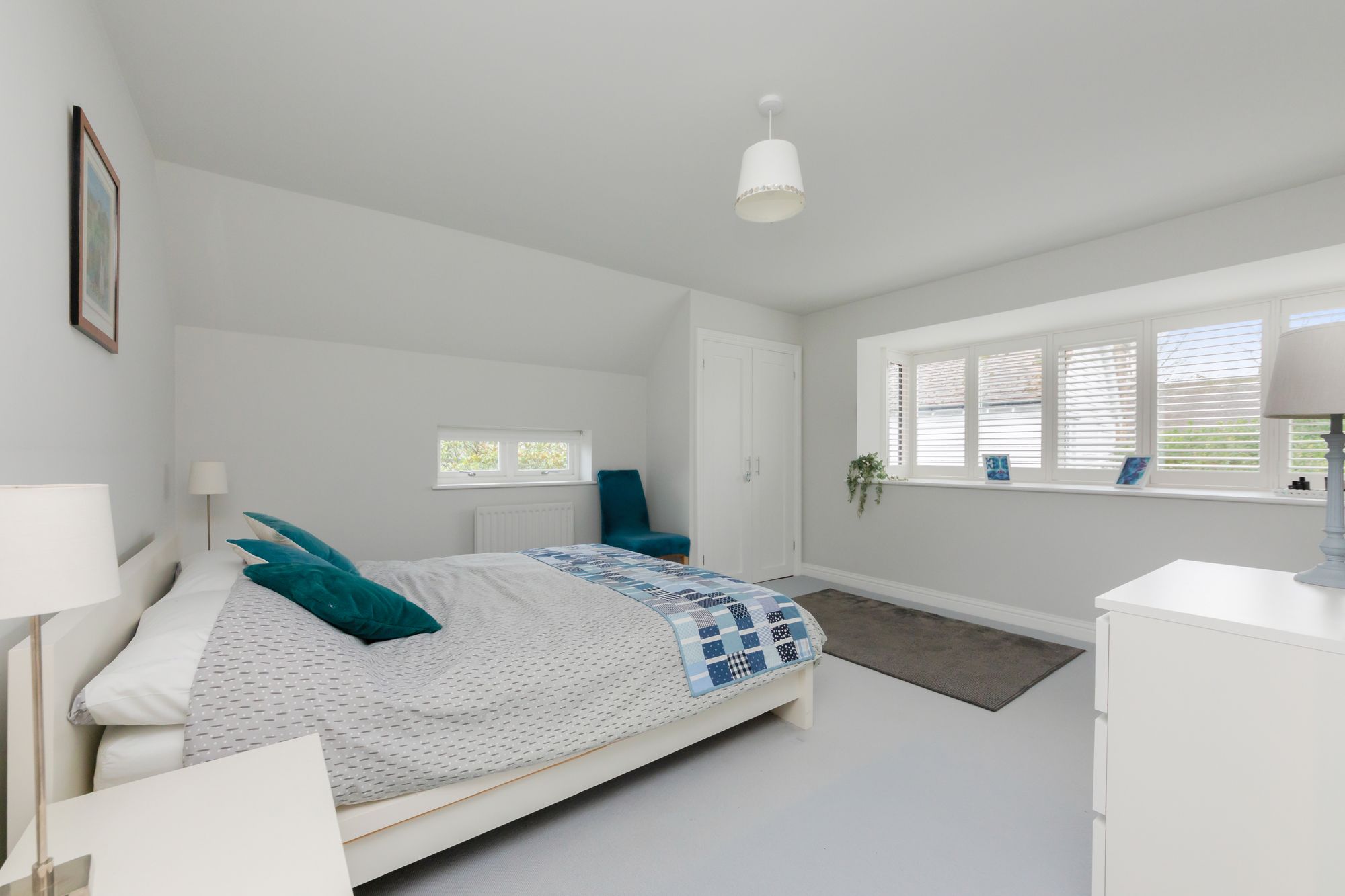 MASTER BEDROOM- A wonderful triple aspect generous room flooded with natural light through windows offering views over the garden to the South Downs in the distance, range of fitted wardrobes.