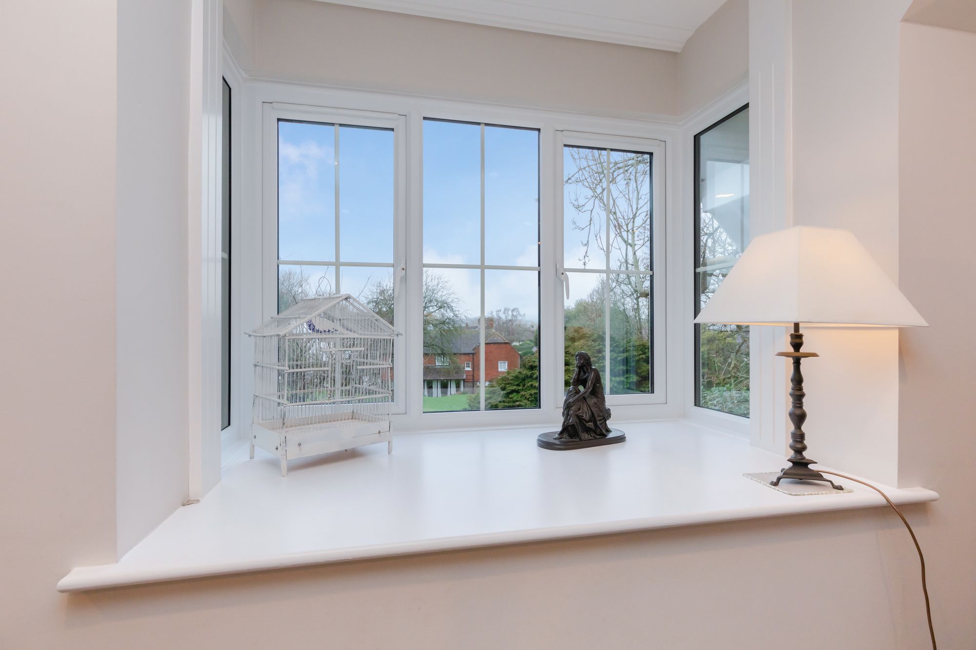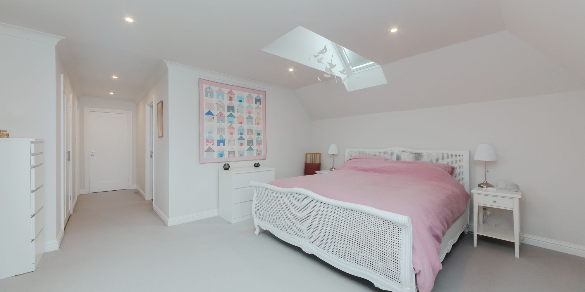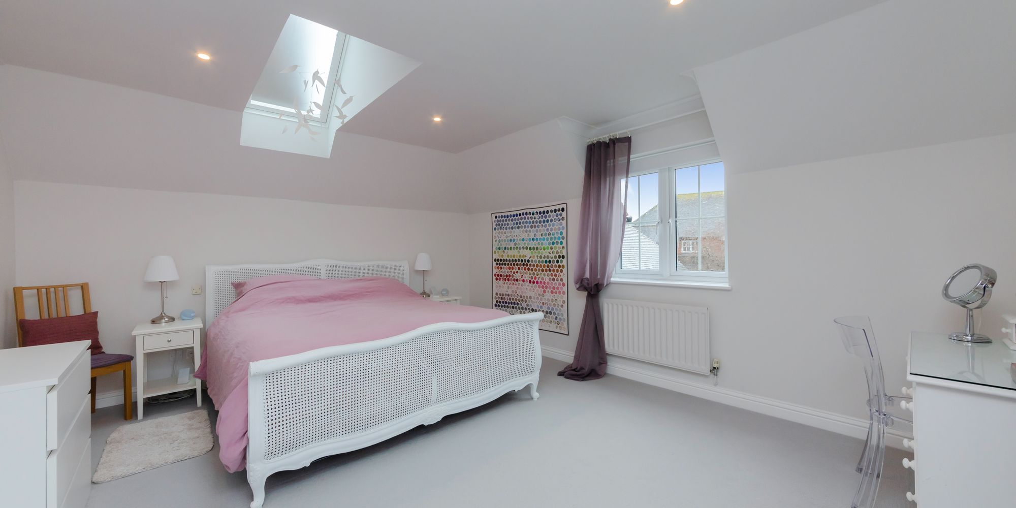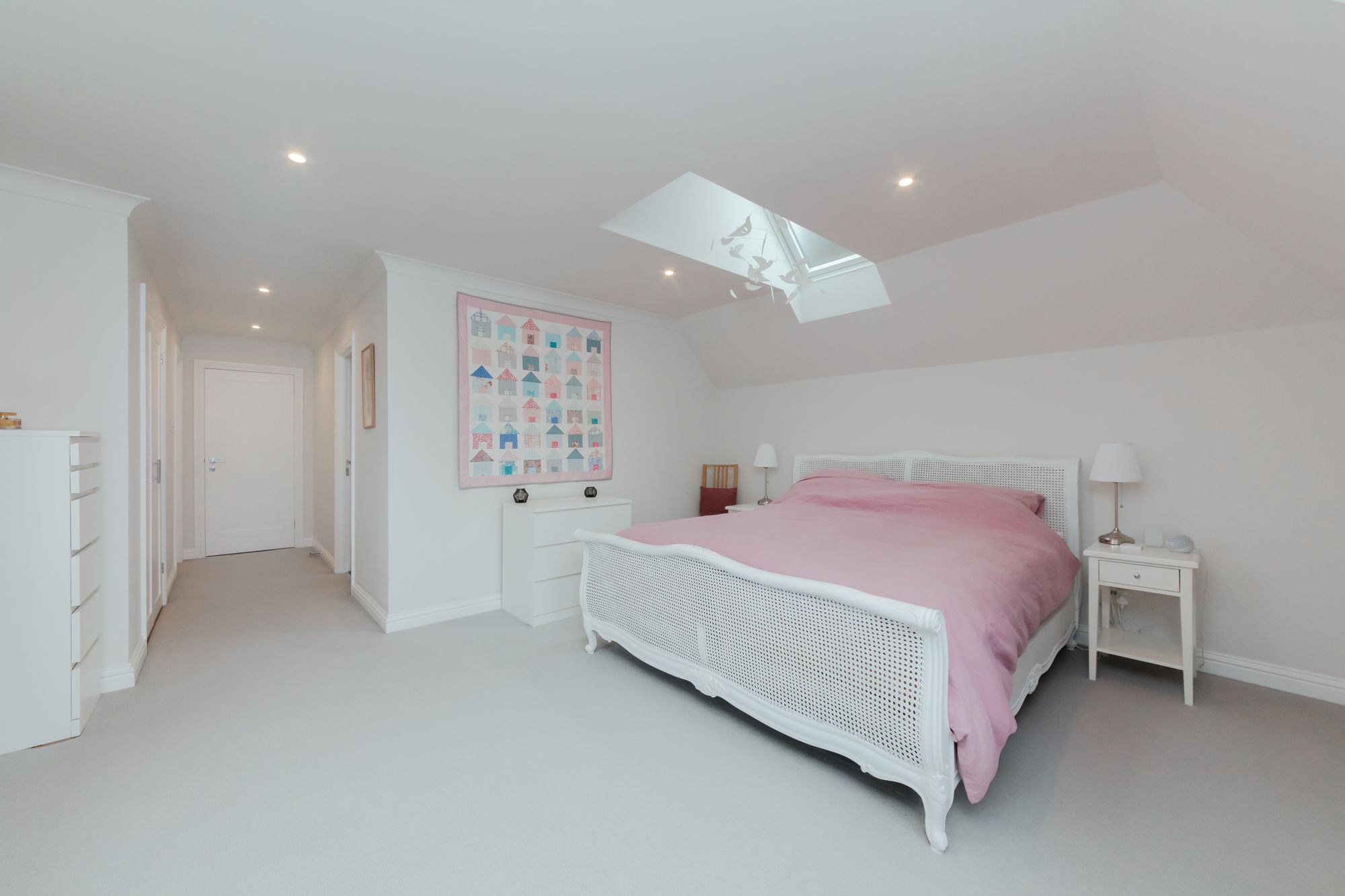 MASTER BEDROOM- A wonderful triple aspect generous room flooded with natural light through windows offering views over the garden to the South Downs in the distance, range of fitted wardrobes.