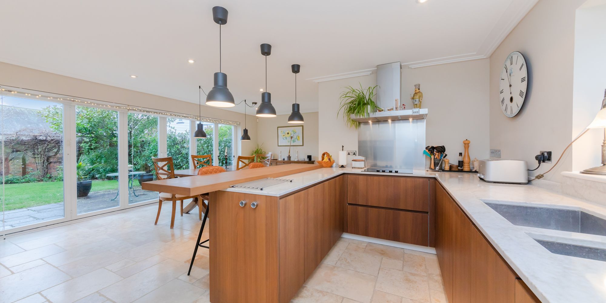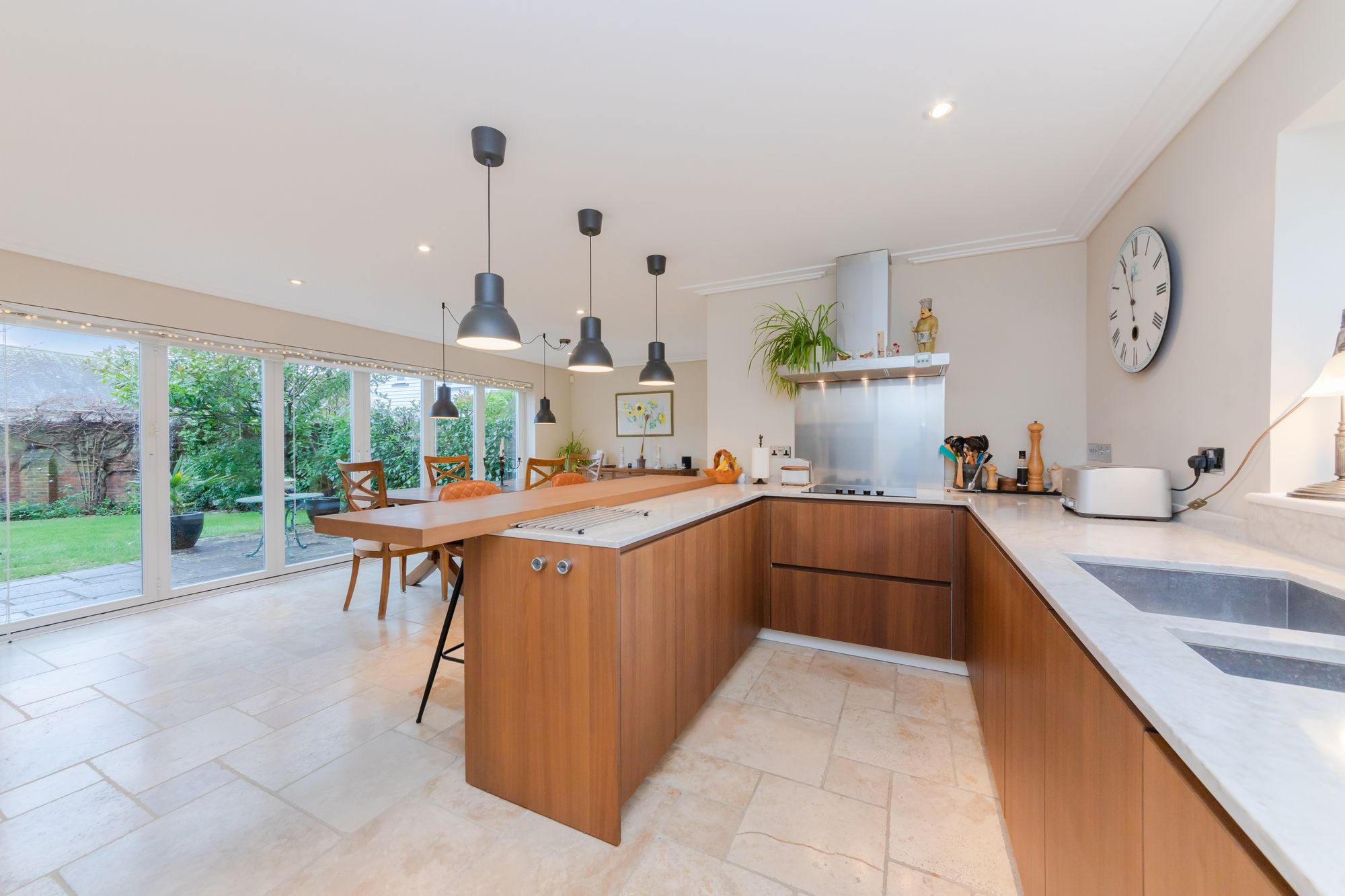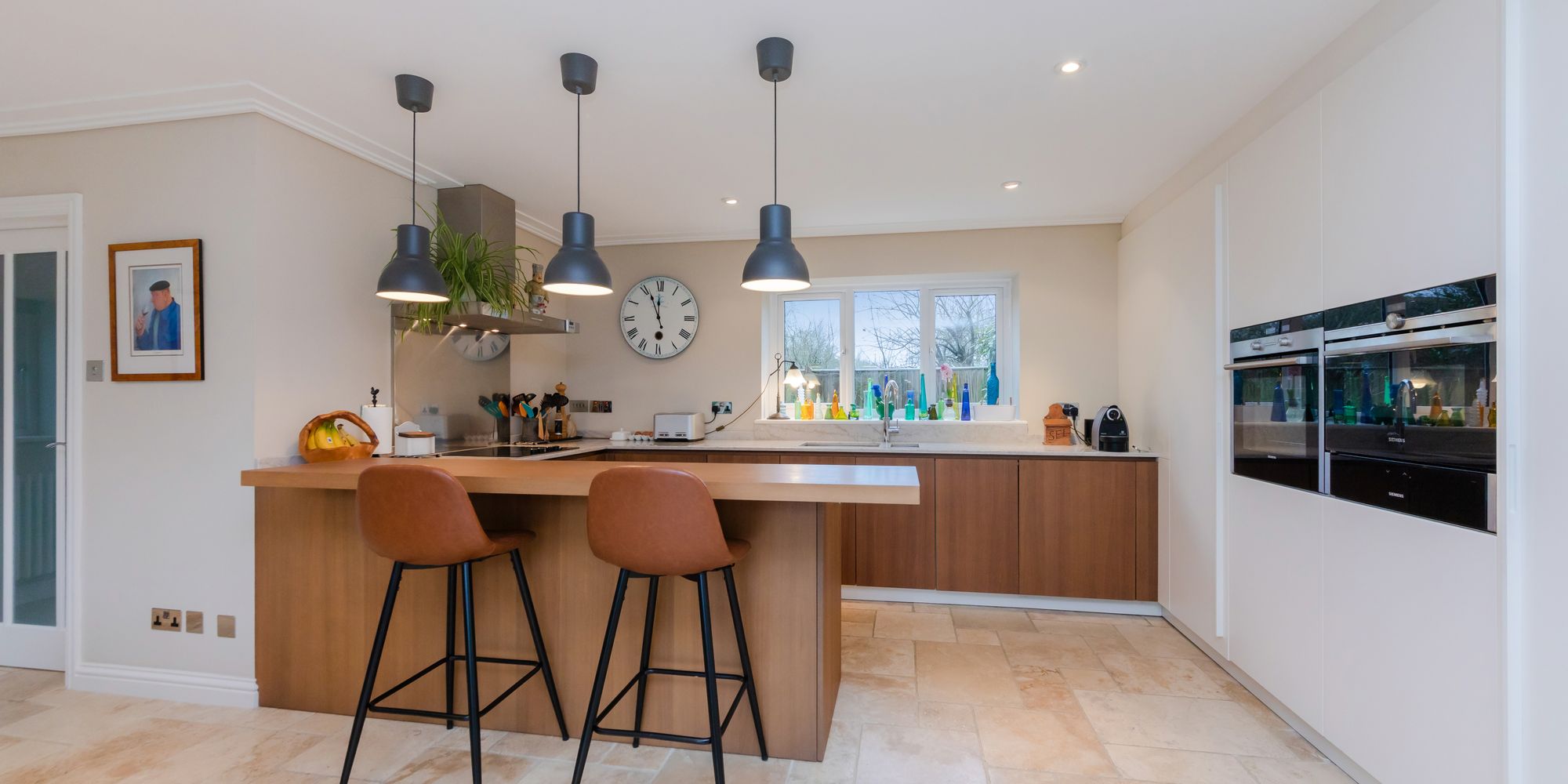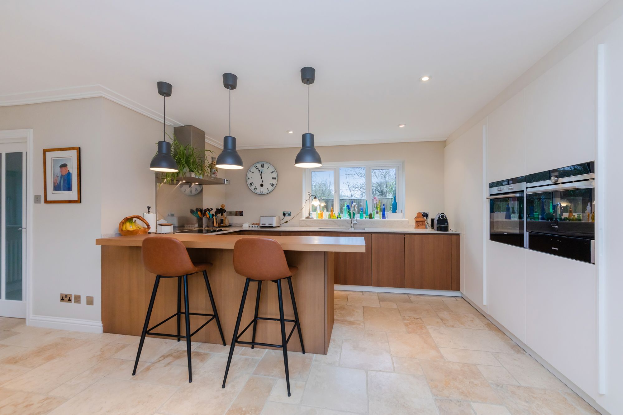KITCHEN AREA- Attractive slimline “Poliform” kitchen with handleless doors and smooth Quartz surfaces, integrated Siemens appliances including an electric hob under a stainless-steel cooker hood, combi and fan ovens, breakfast bar, rear aspect window and matching stone flooring.