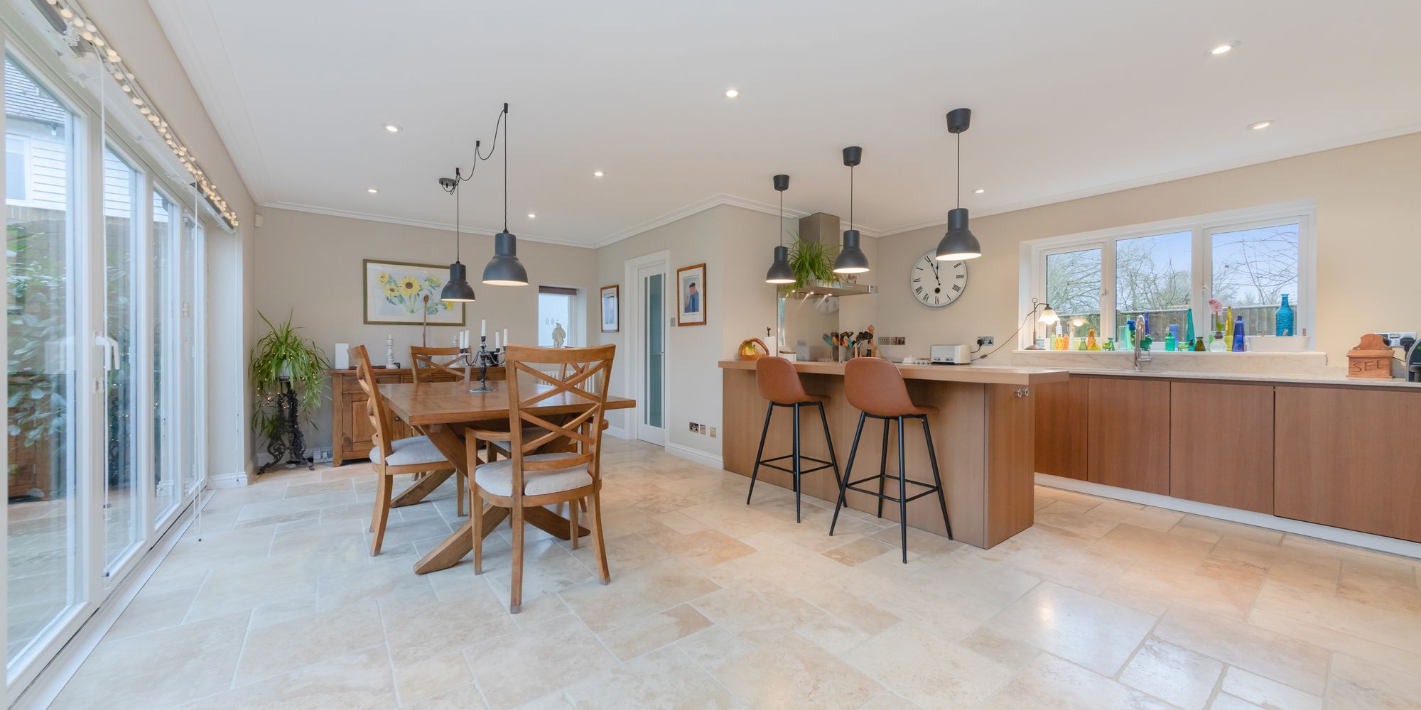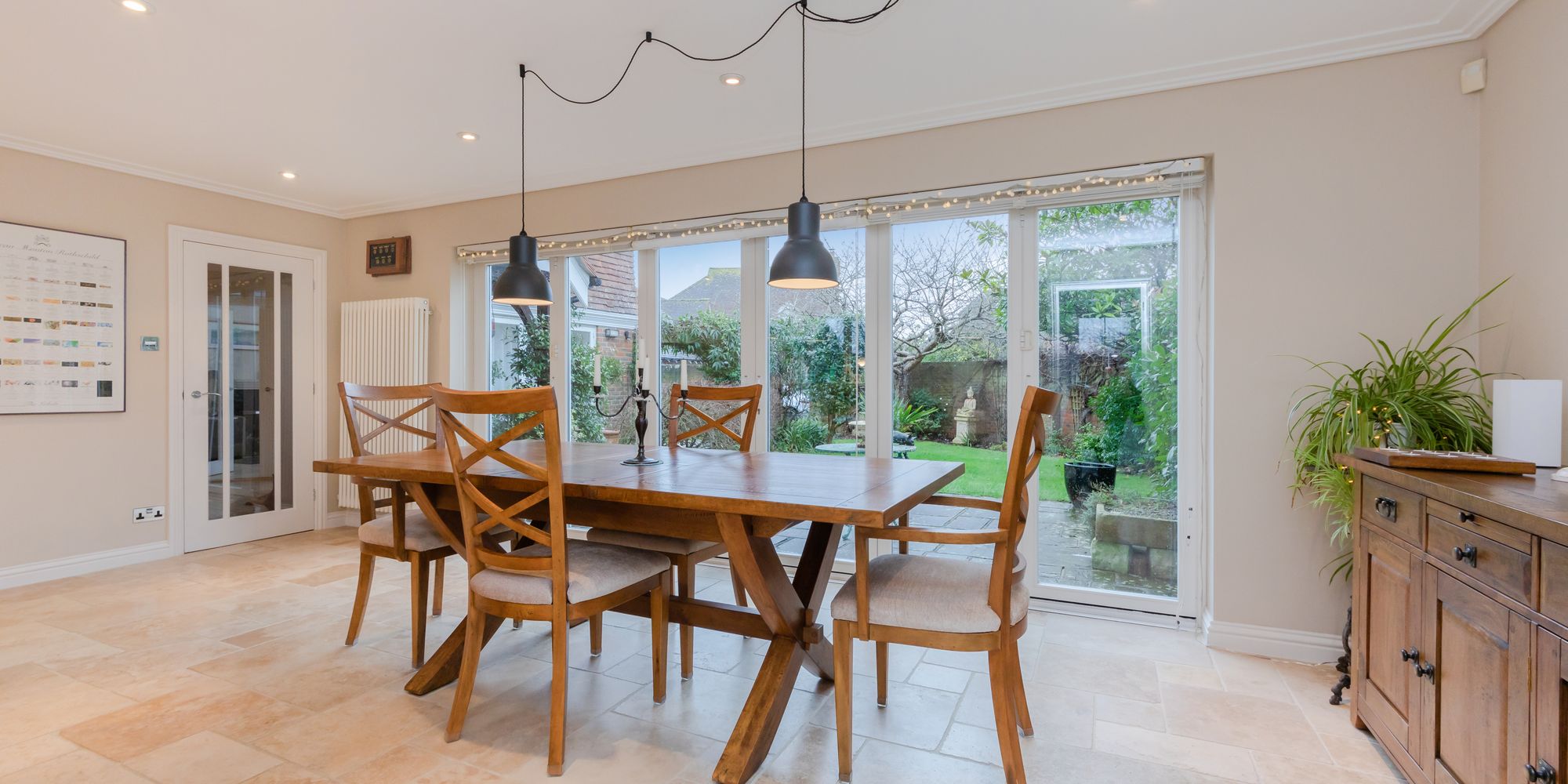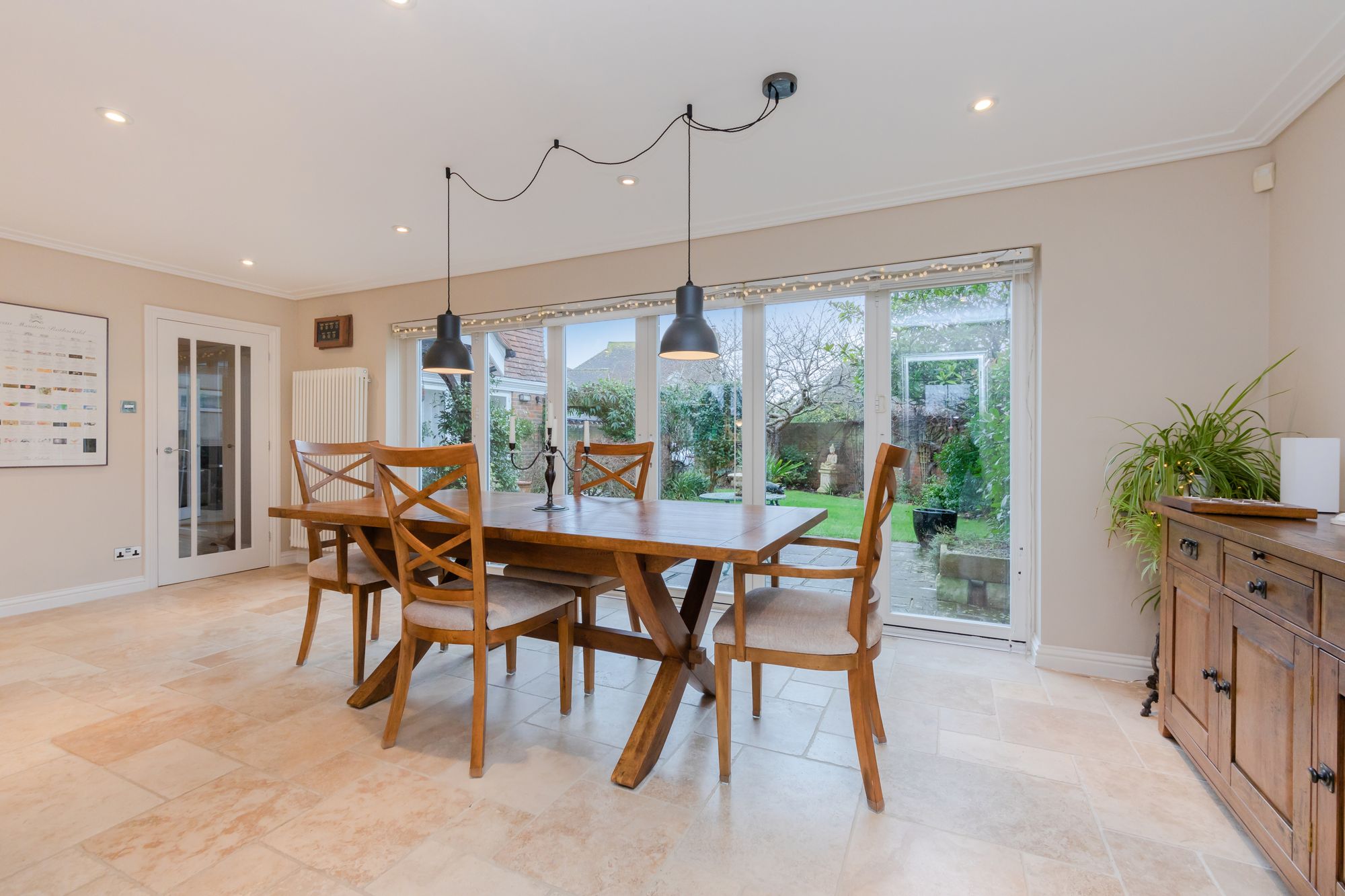 DINING AREA- Overlooking the patio area with a wide expanse of bi-fold doors offering direct access, stone flooring opening to-
