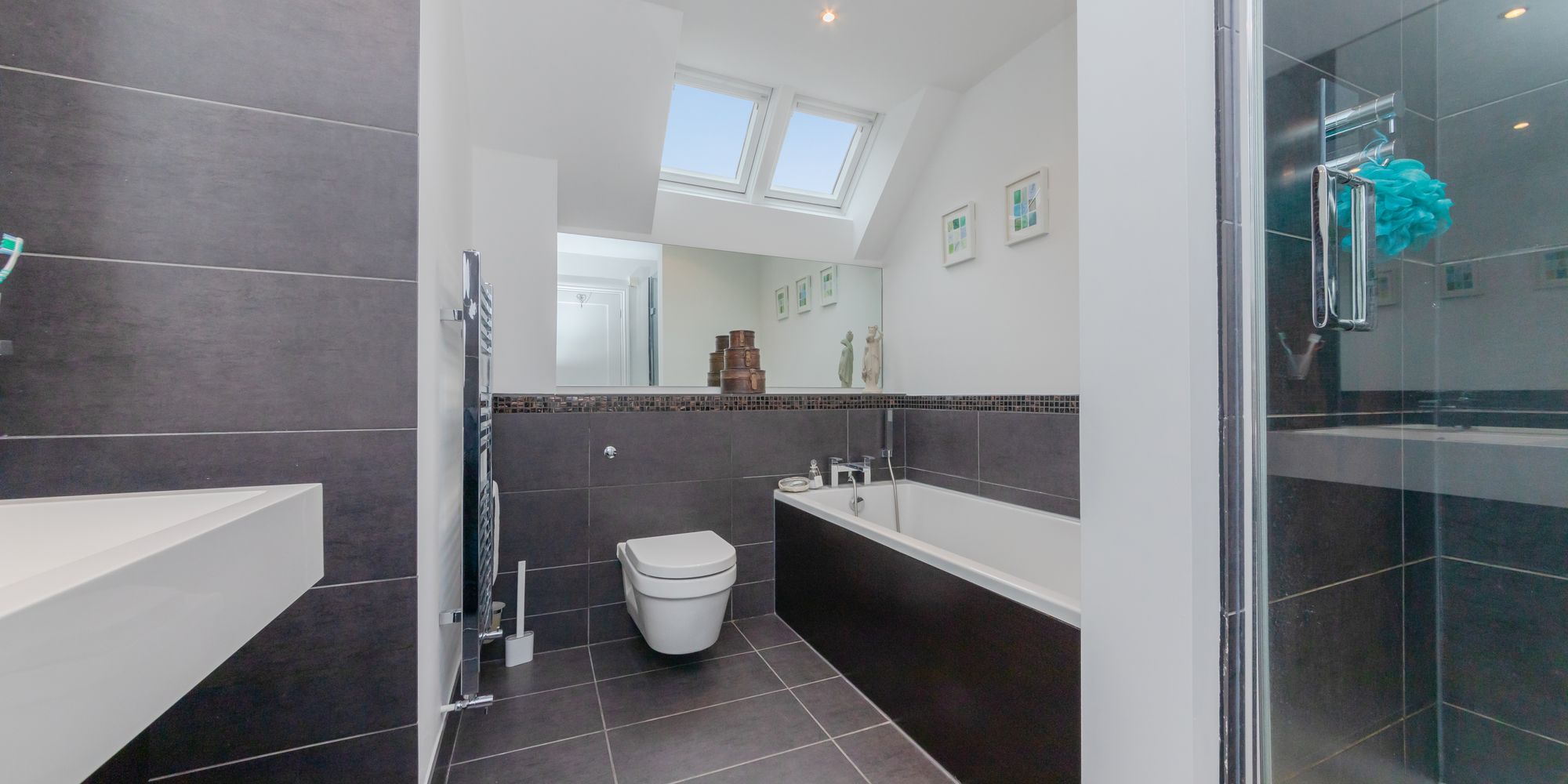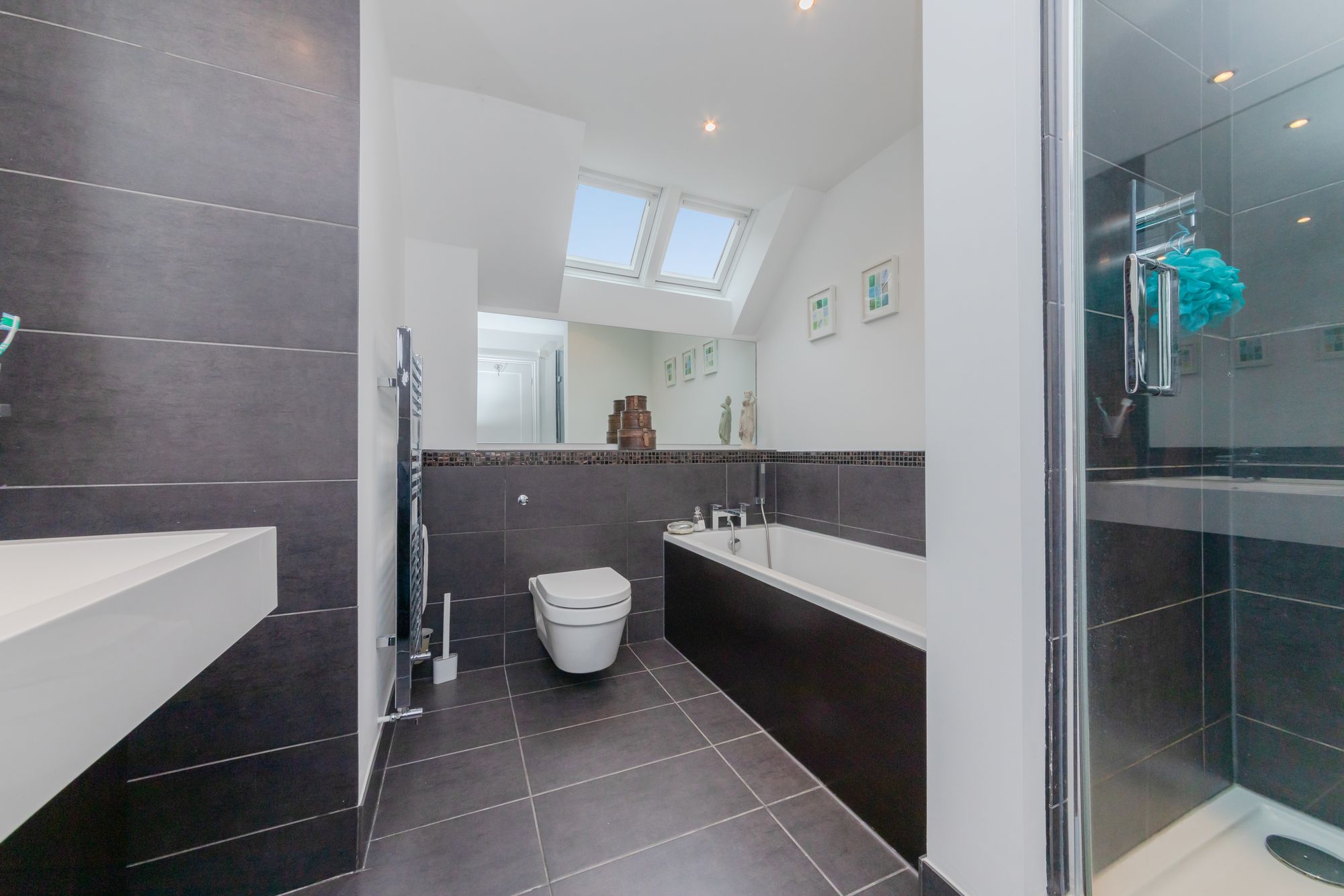 ENSUITE BATHROOM- Contemporary white suite comprising a panel enclosed bath with chrome mixer tap and hand-held shower attachment, walk-in shower cubicle with glass door and tiled surround, twin wash basins with matching chrome mixer taps, attractive tiled walls and floor, chrome heated towel rail, twin roof windows.
