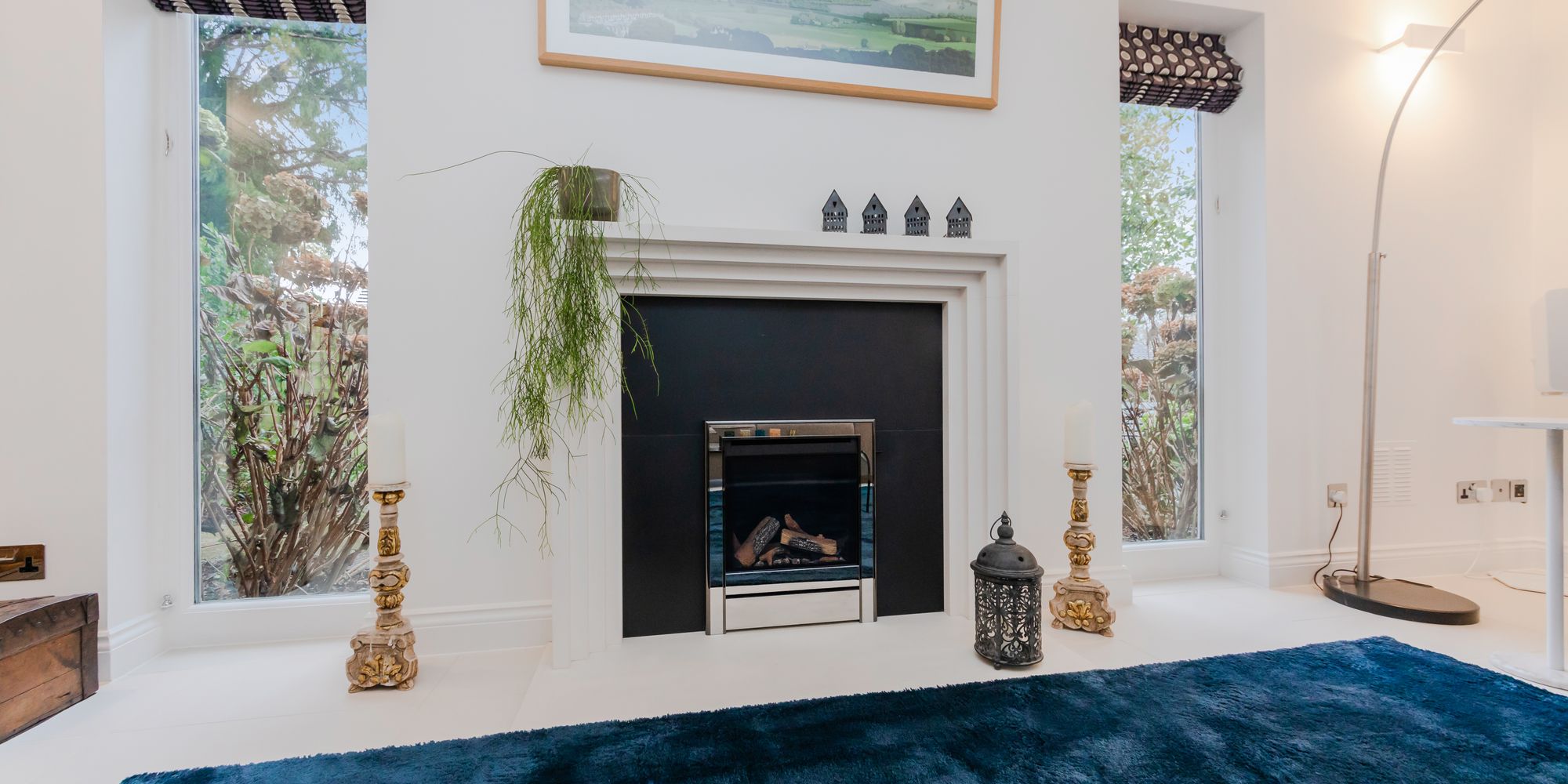 SITTING ROOM- A stunning bright and spacious room flooded with natural light through the triple aspect windows and bi-fold doors opening onto the garden, stone fireplace housing a contemporary living flame LPG fire, stone flooring with underfloor heating.