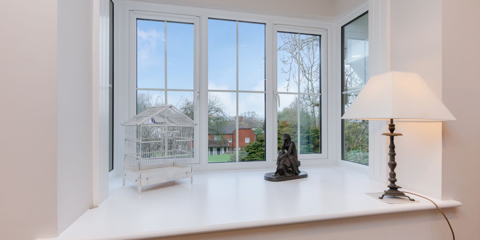 GUEST BEDROOM- A large triple aspect room with large box bay window, fitted wardrobe, door to-