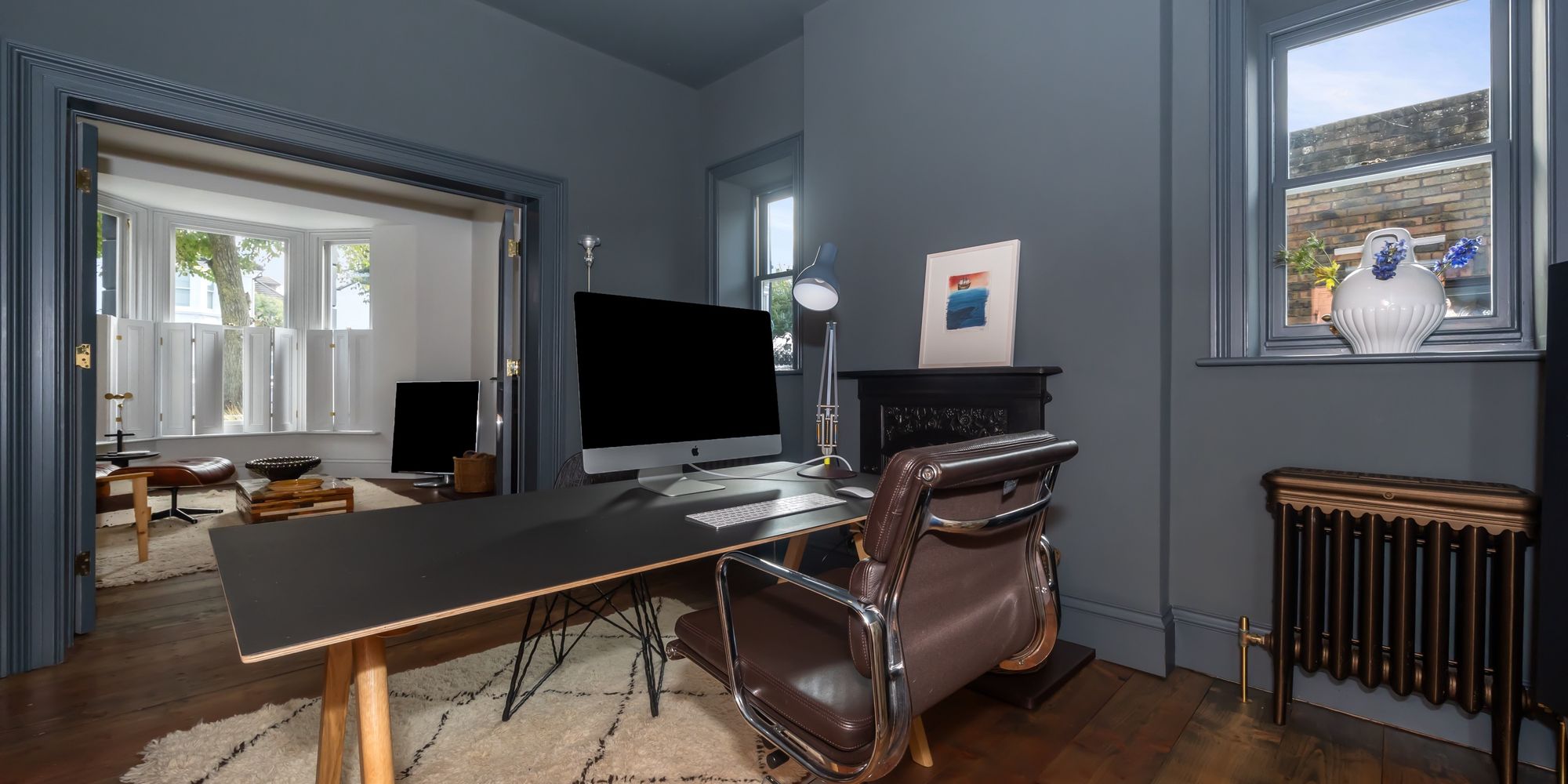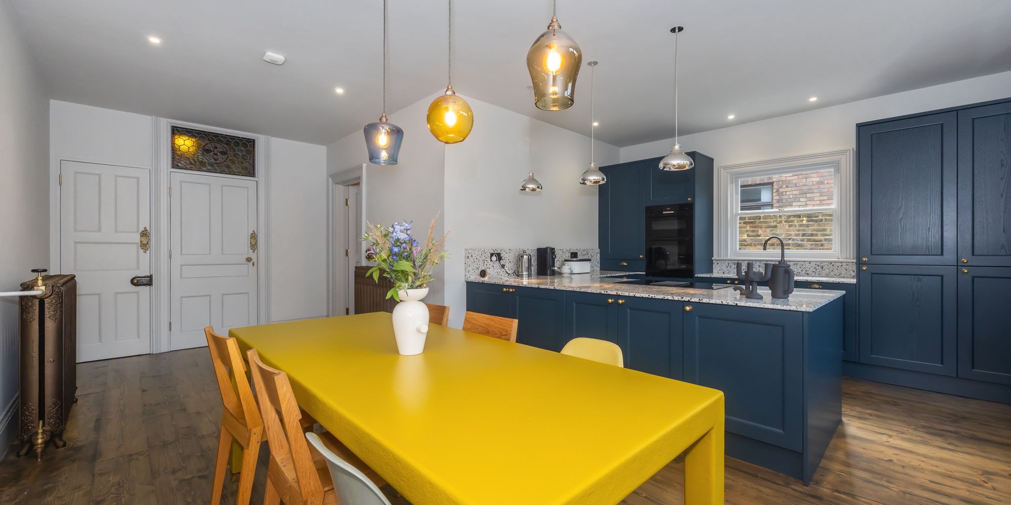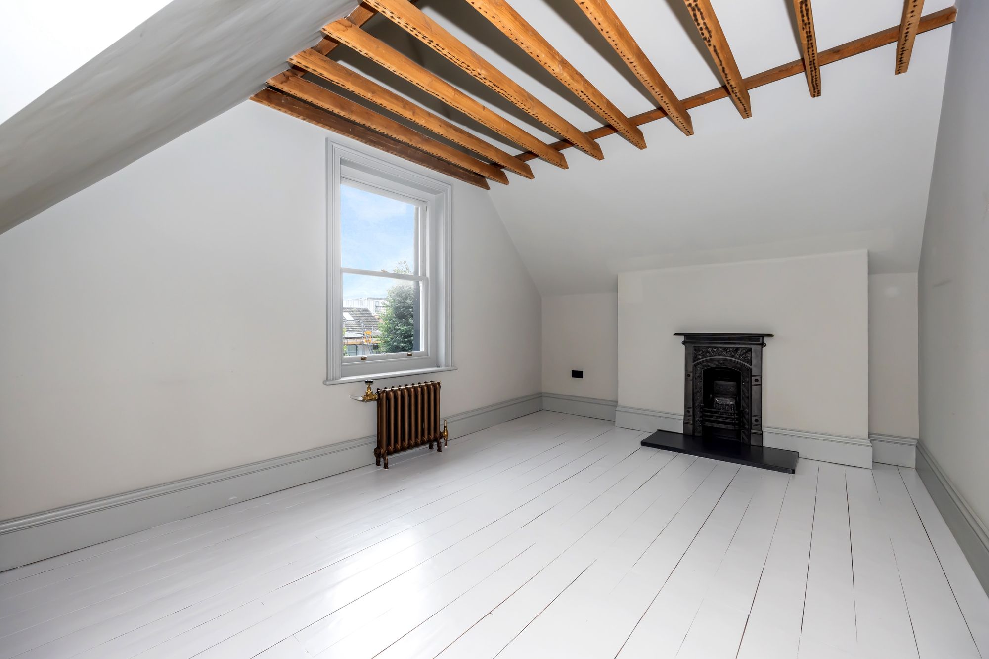 Character elements, such as the reinstated chimneys and six fireplaces, have been tastefully combined with modern touches, like the restored antique cast iron radiators and renovated sash windows fitted with double glazing.