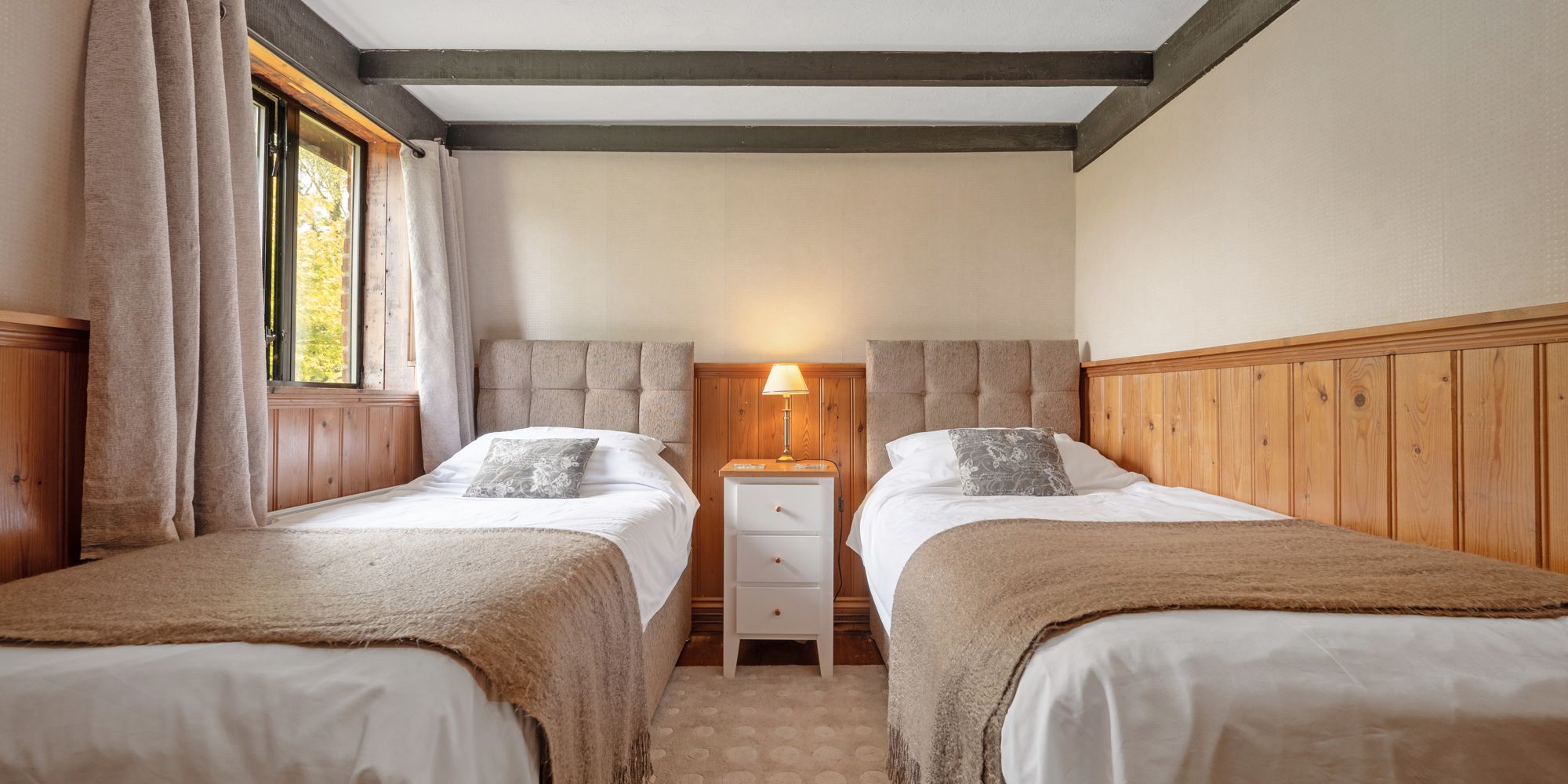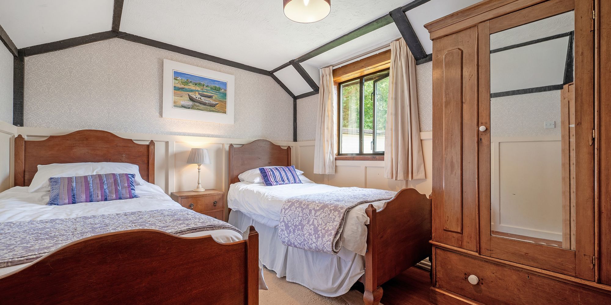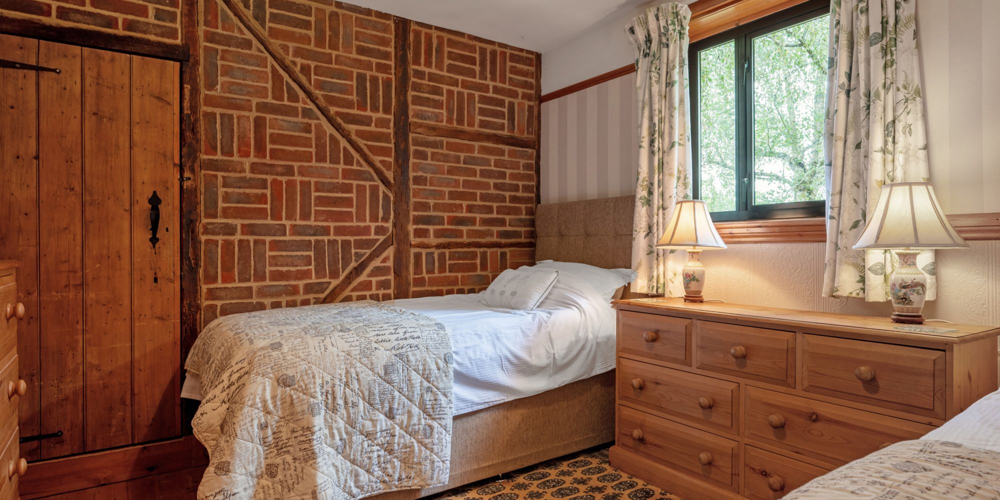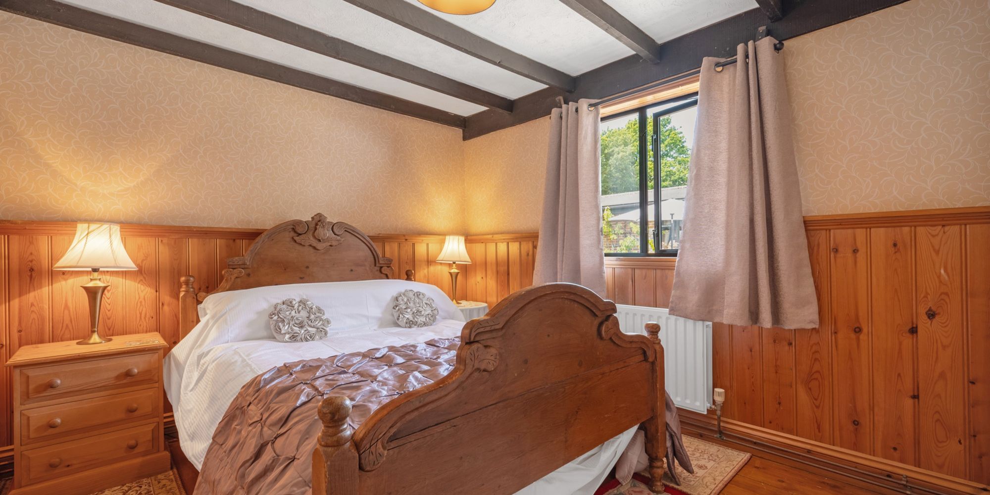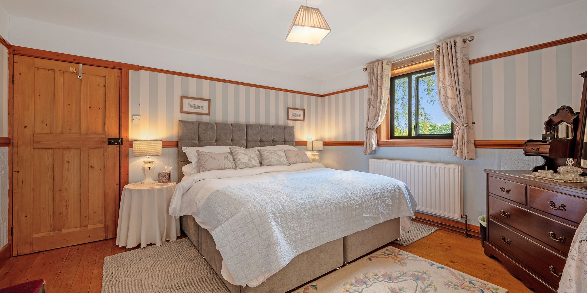 Bedroom- A comfortable double bedroom with views over the grounds. Exposed beams and floorboards.