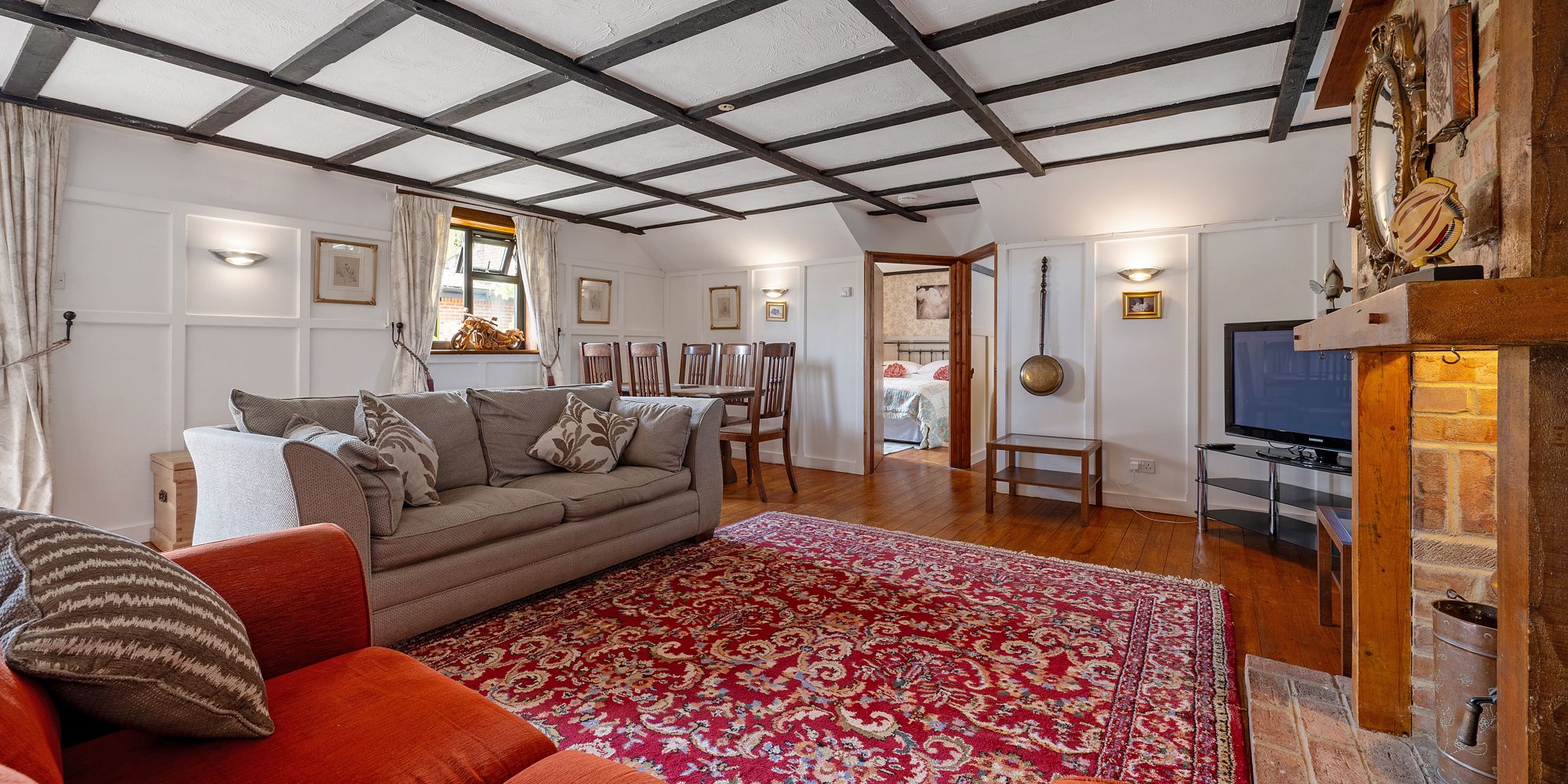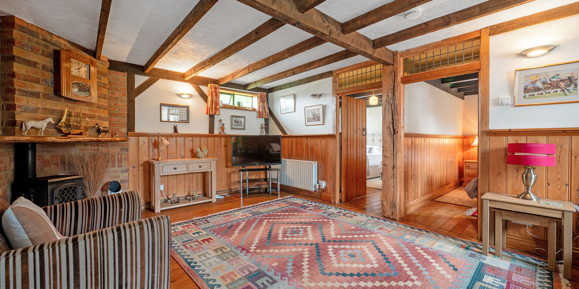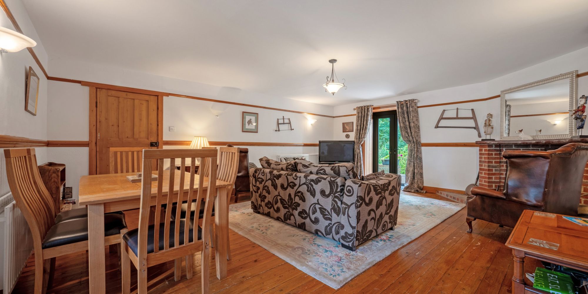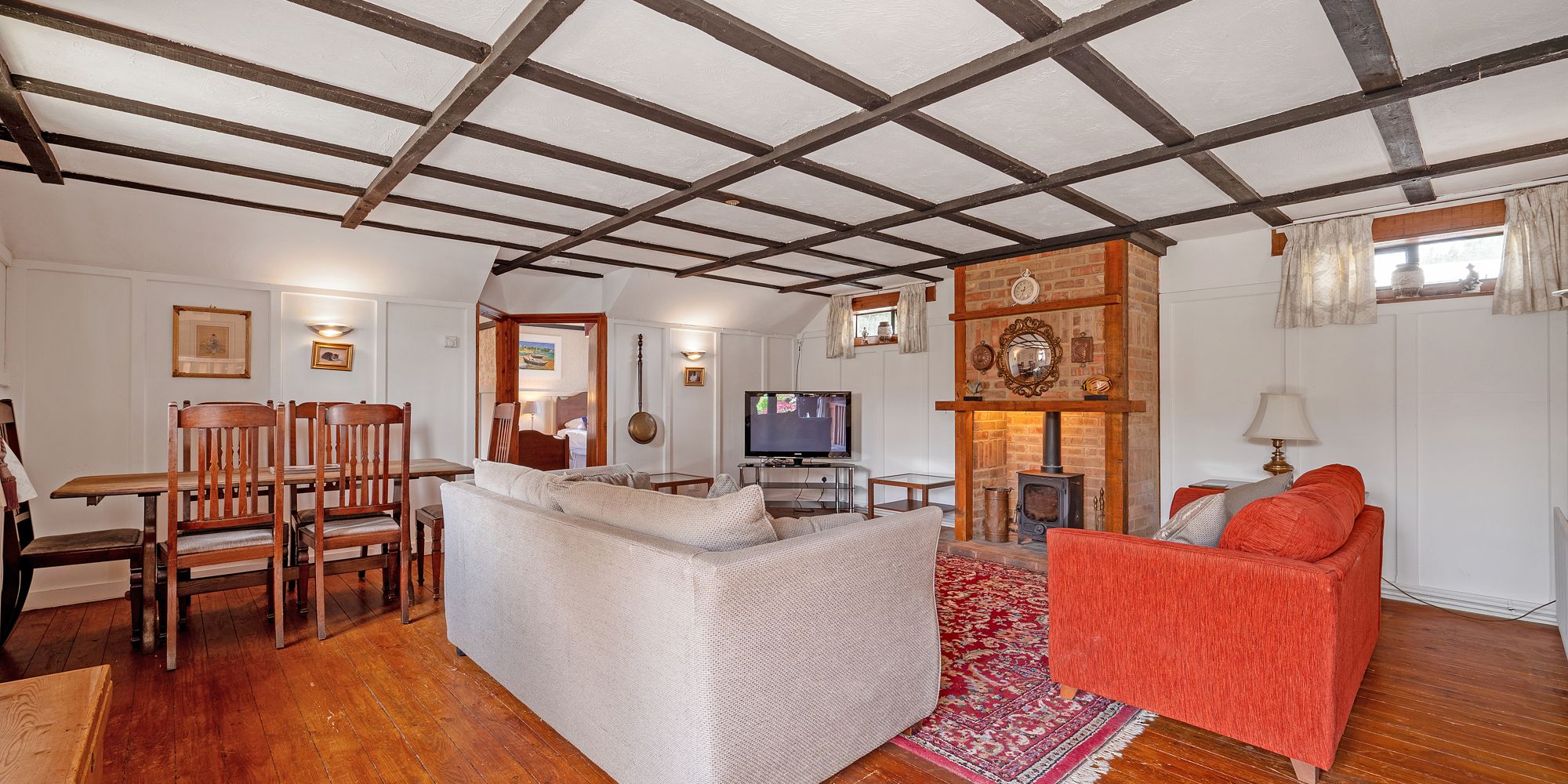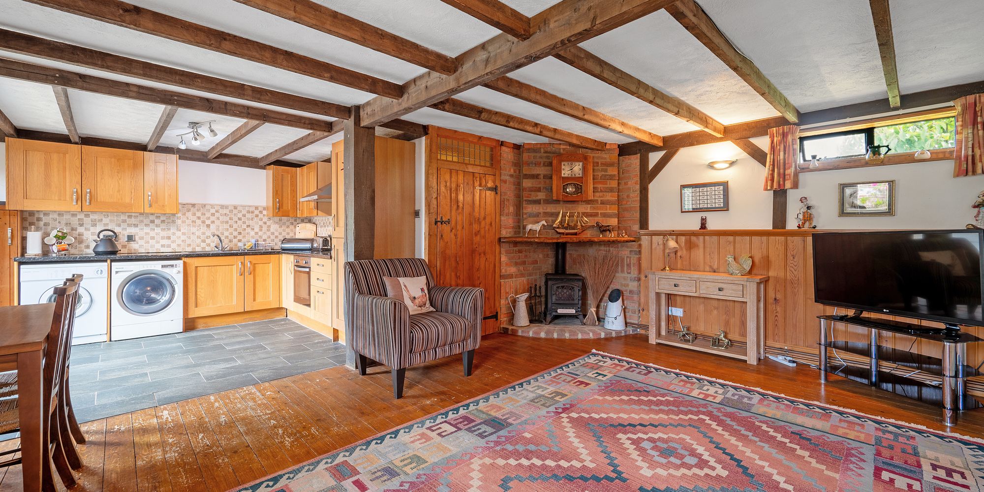 Open Plan Living Kitchen Dining Room- The more than generously sized room features exposed floor boards and beams and benefits from dual aspect natural light with views over the courtyard. The room further features a woodburning stove set into a chimney and painted panelled walls. Panelled doors with latches open to principal rooms.