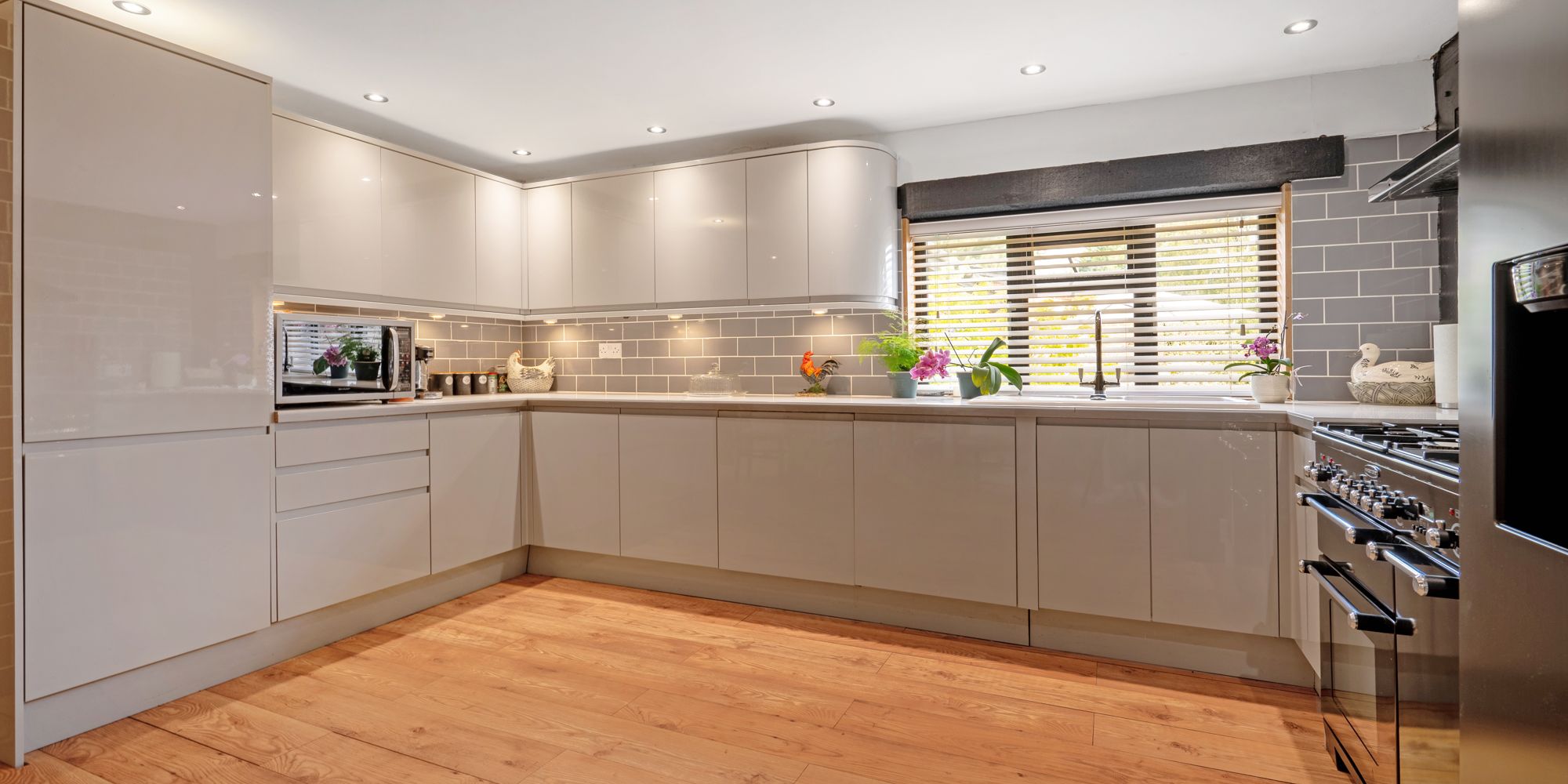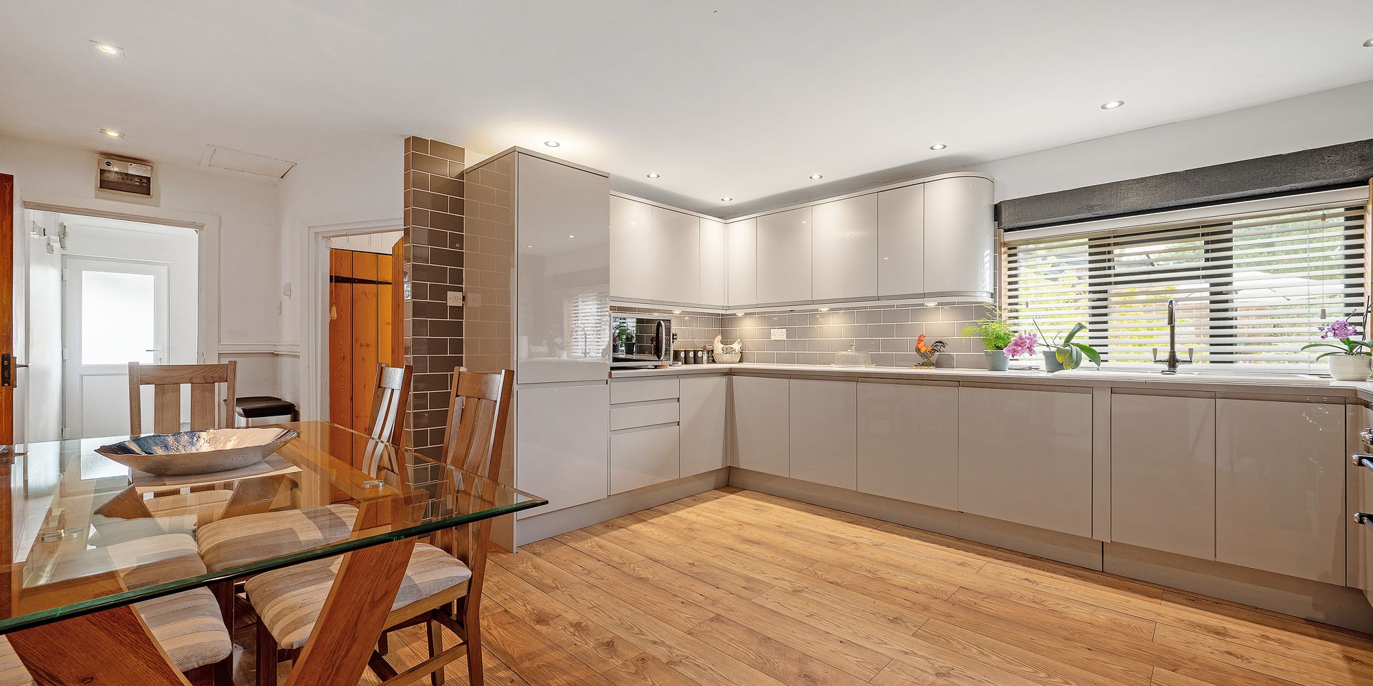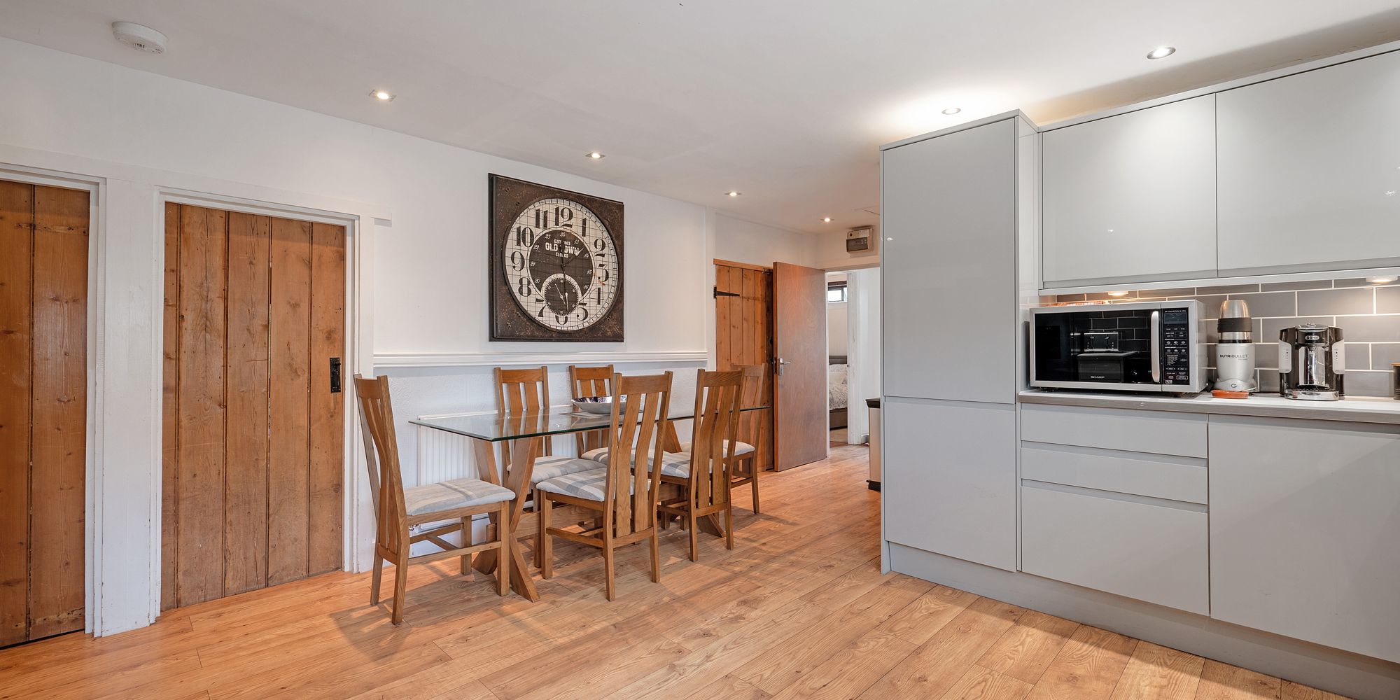 Kitchen Dining Room- A generously sized modern Kitchen Dining Room finished in a soft grey and complicated by stone worksurfaces. The kitchen enjoys views over the courtyard to the front and features engineered wood floors and characterful wood panelled doors with latches.