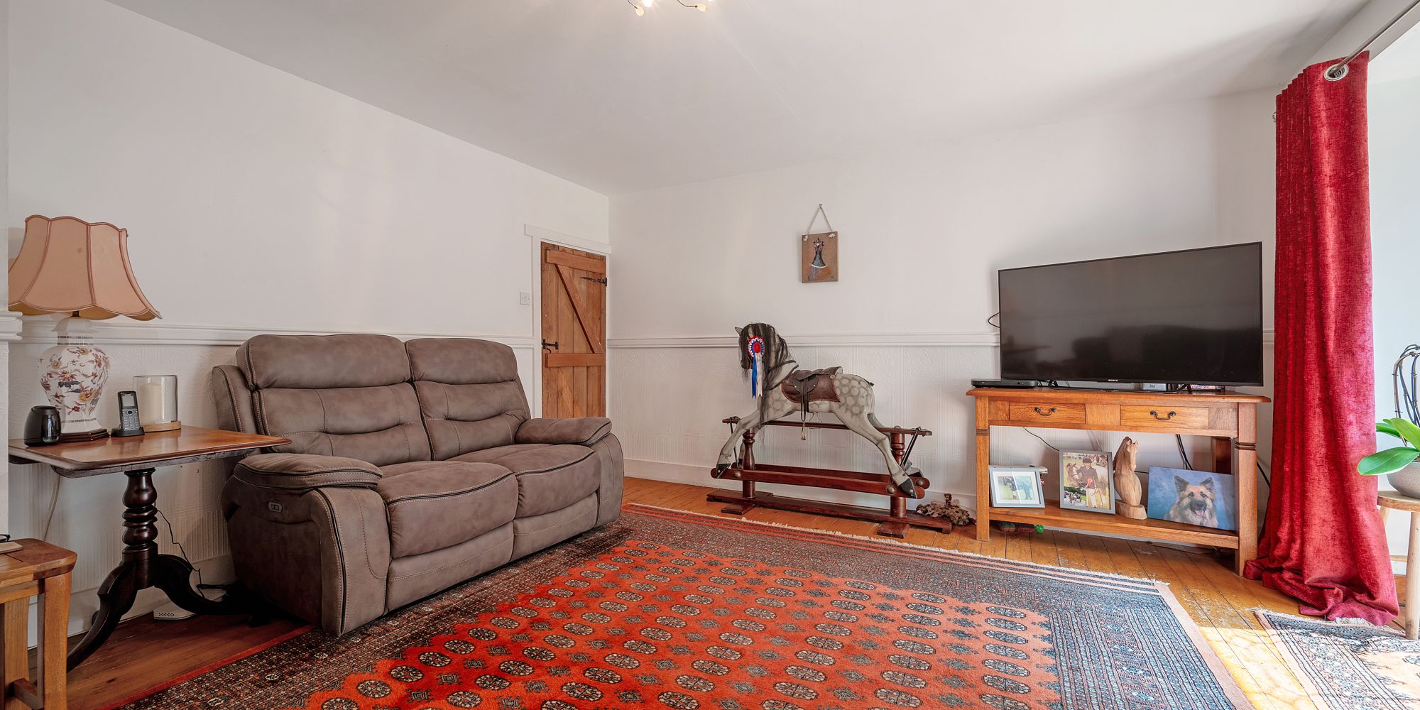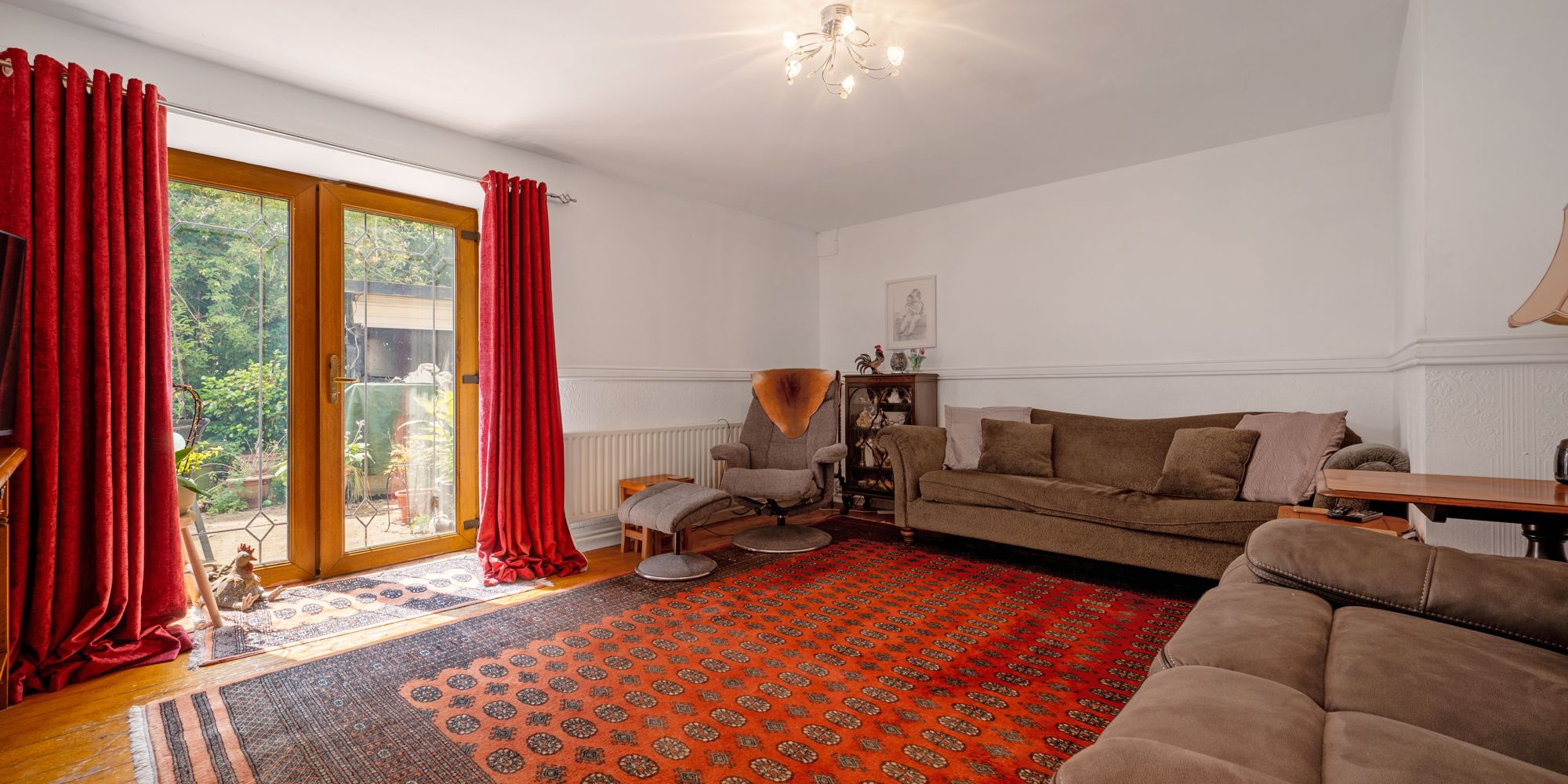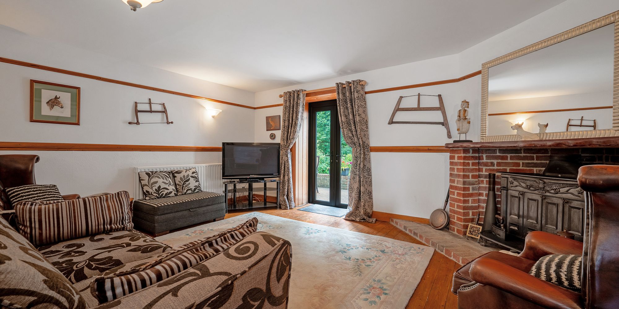 Sitting Room- Measuring a generous 16’4 x 14’6 and featuring double doors to the garden. Exposed floorboards.