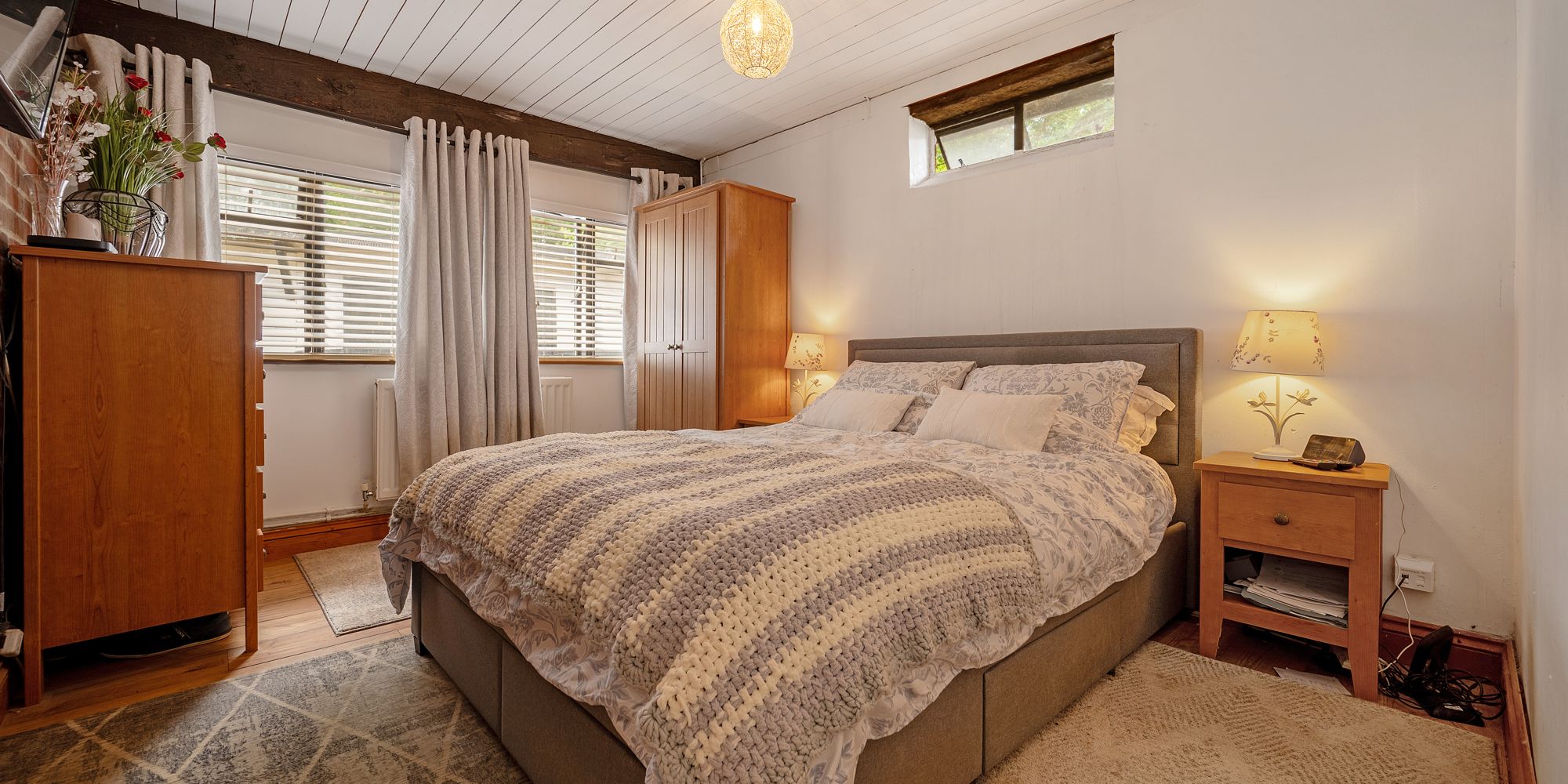 Bedroom- A generous double bedroom with dual aspect views over the garden. Painted tongue and grove ceiling.