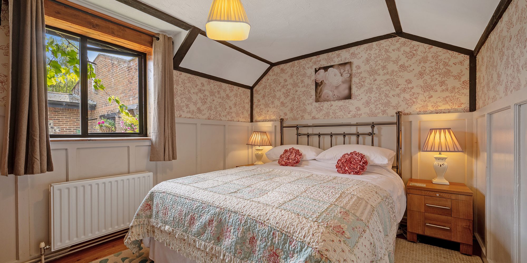 Bedroom- A comfortable double bedroom with painted panelled walls and views over the courtyard.