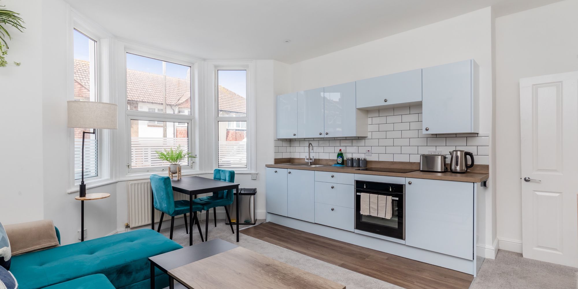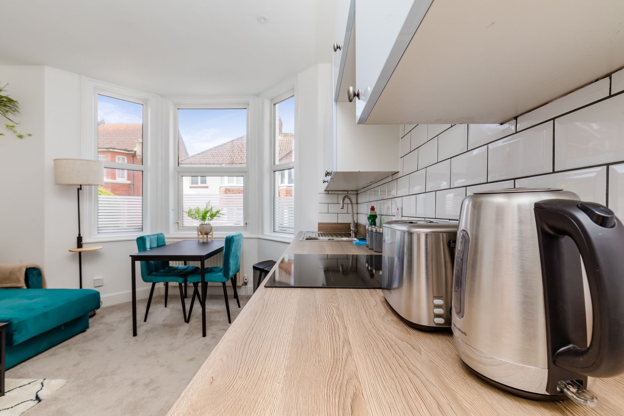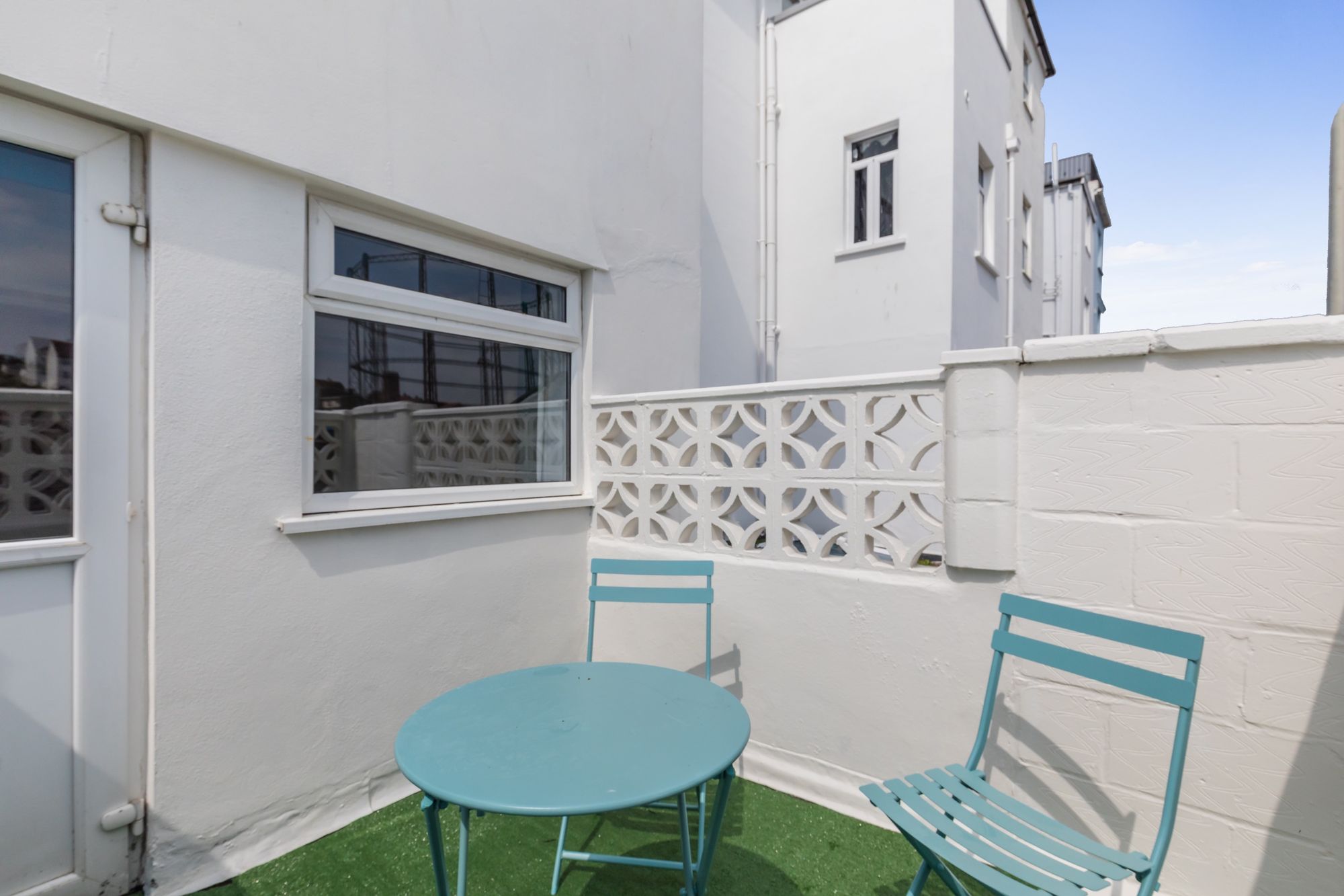 The property comprises of open plan LIVING/DINING ROOM/KITCHEN. The LIVING ROOM has a bay window to the front and the modern fitted KITCHEN benefits from fitted oven, induction hob, fridge and dishwasher. A communal washing machine is also available. The BEDROOM has an ensuite shower room and a door which leads out onto a lovely BALCONY with sea views.