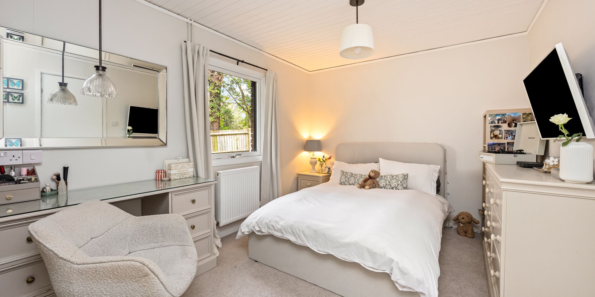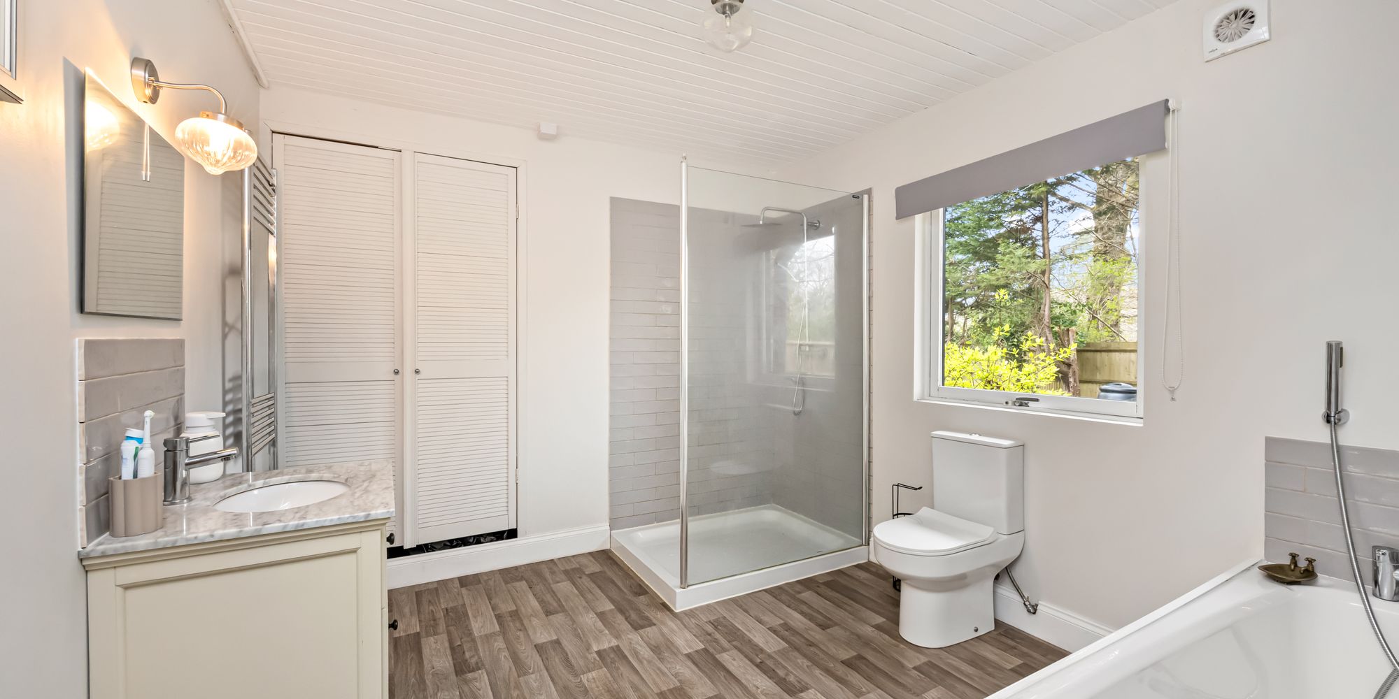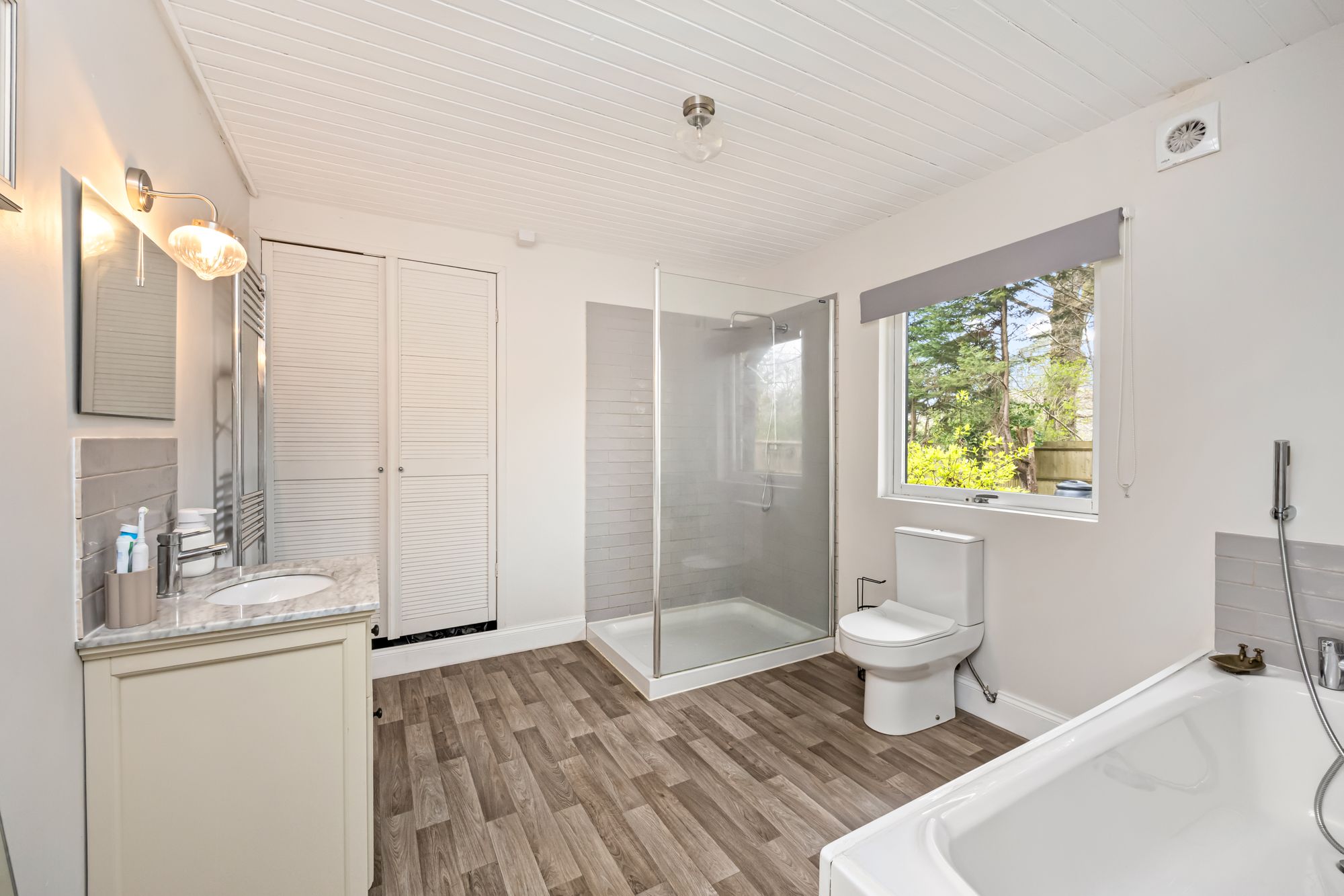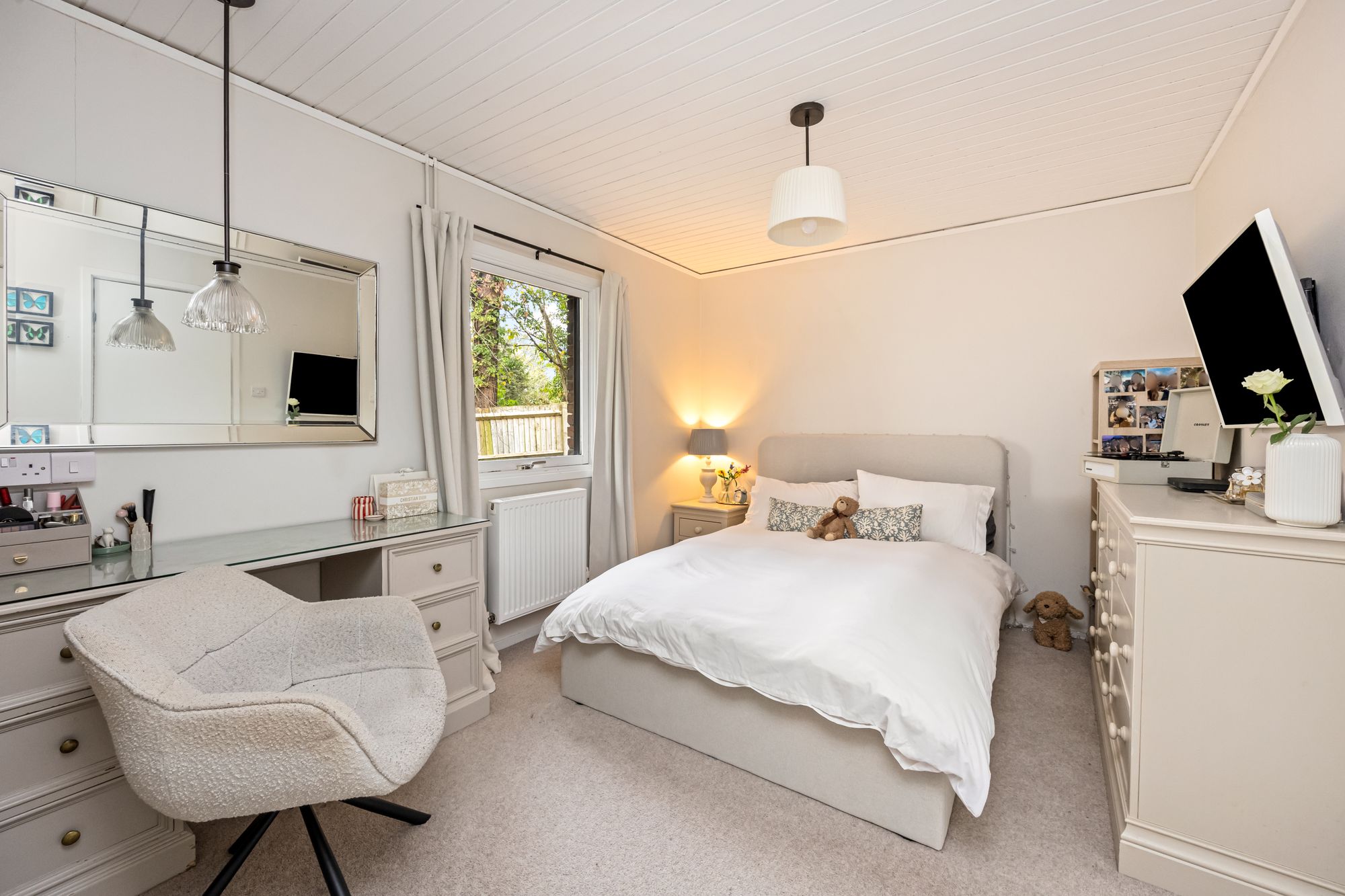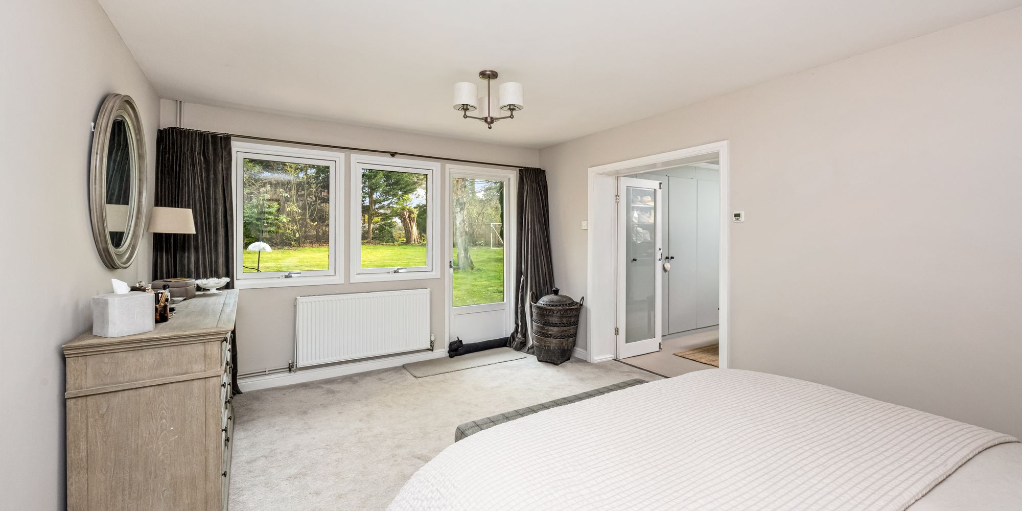 The principal bedroom overlooks the garden with access to the patio terrace, the room benefits from a large walk-in dressing room with fitted wardrobes, as well as a luxurious en suite with both a bath and a separate shower, WC, and basin. The second bedroom also offers a modern en suite with both a walk-in shower and bath, while the third double bedroom features its own en suite bathroom. Completing the internal accommodation is a separate WC with a shower for guests.